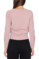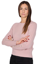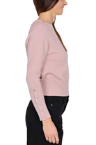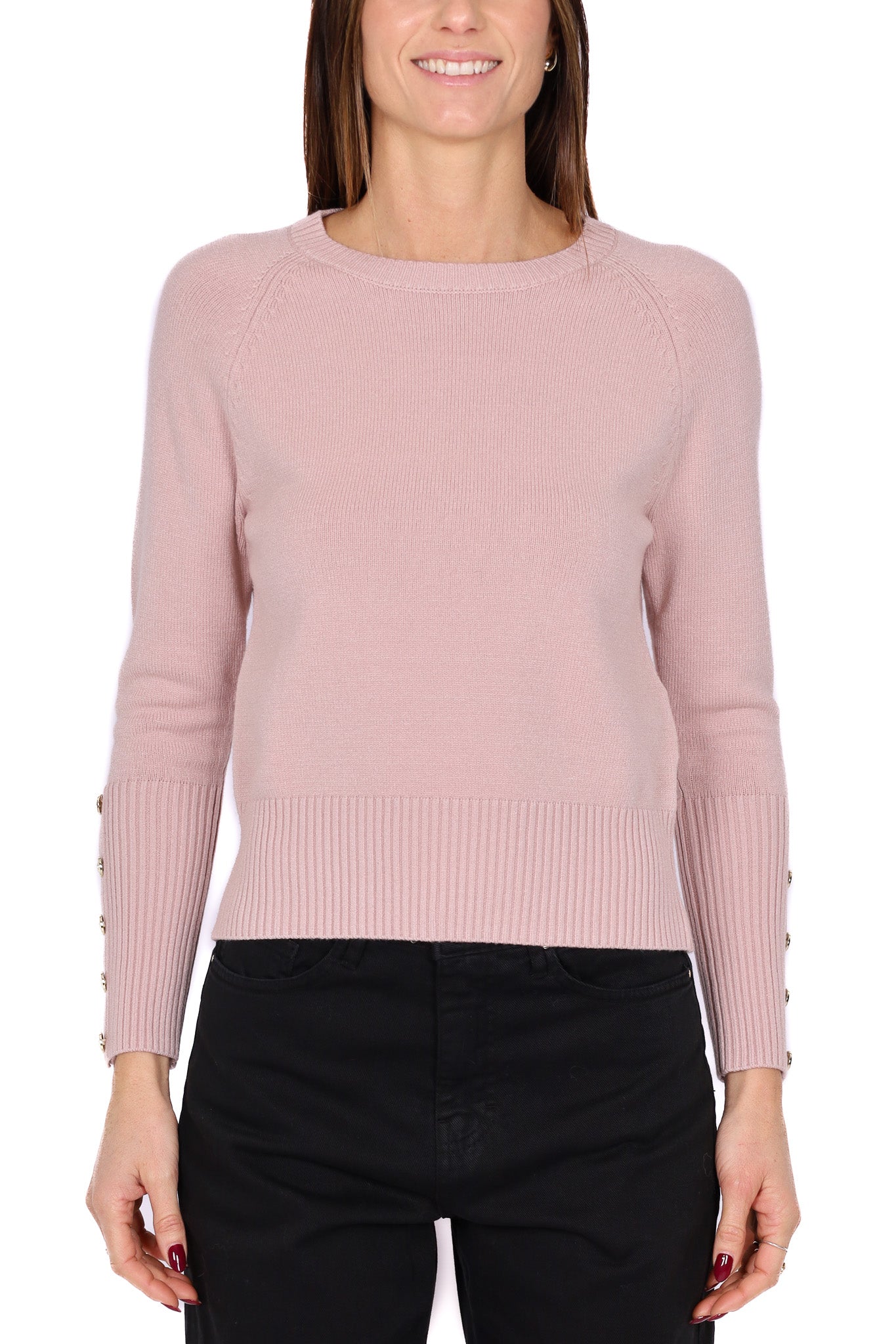 Maglia da donna in fine maglia rosa, dal design pulito e femminile, con girocollo rifinito e maniche lunghe raglan che valorizzano le spalle con discrezione. Il fondo e i polsini sono lavorati a costine alte per definire la linea, perfetto per look da giorno o da ufficio abbinata a jeans o pantaloni tailoring.