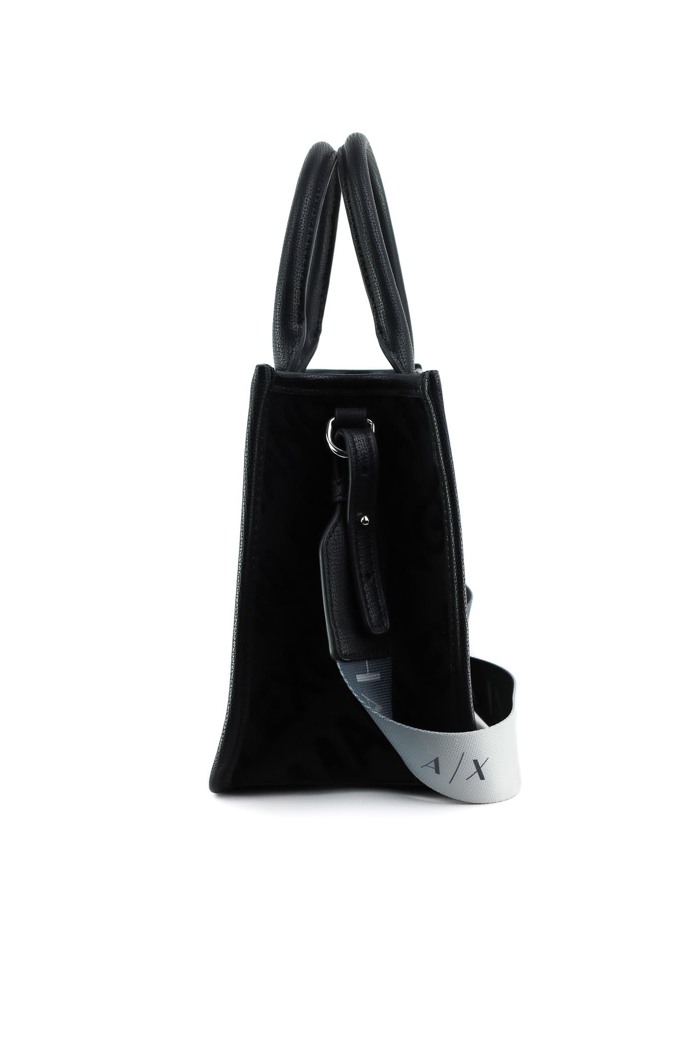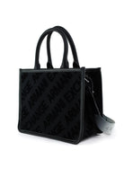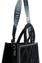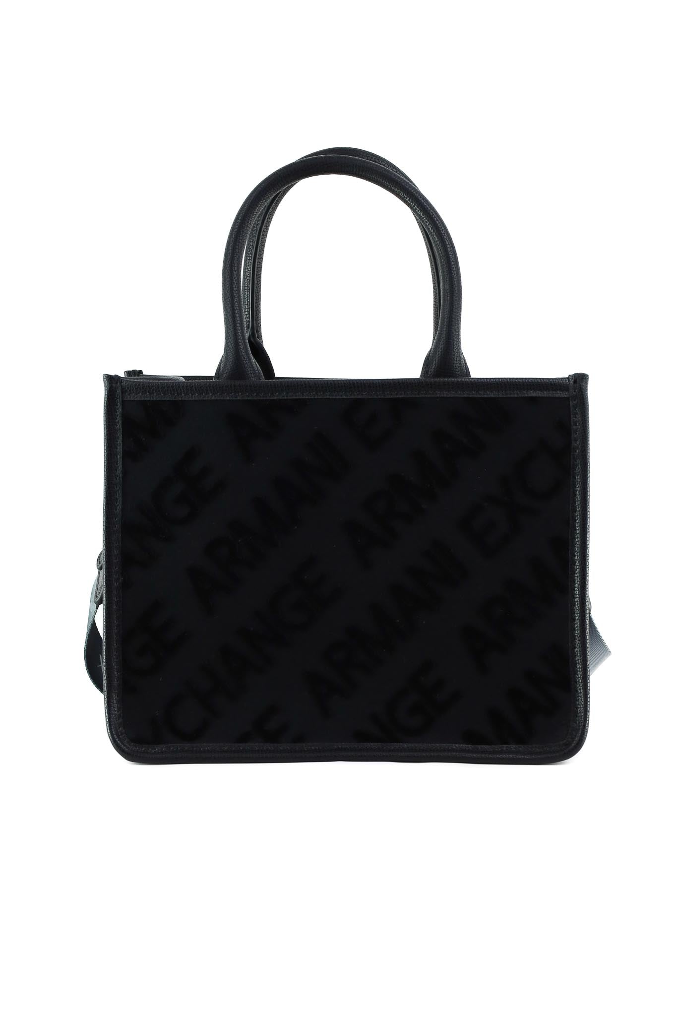 Borsa shopper strutturata con doppi manici in similpelle nera e pannelli in tessuto effetto velluto con monogram all over Armani Exchange tono su tono. La tracolla removibile con maxi logo sfumato consente di indossarla a spalla o crossbody, ideale per look urbani quotidiani.