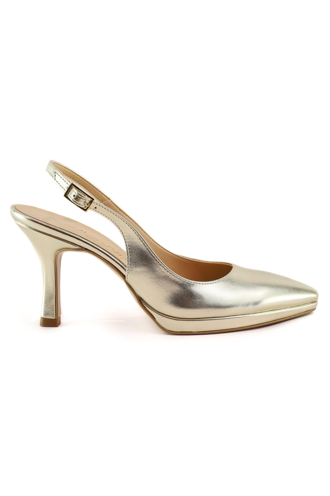 Décolleté slingback made in Italy in vera pelle metallizzata oro rosa, con punta affilata e apertura sul tallone per un fit impeccabile. Il tacco kitten basso a rocchetto garantisce comfort e femminilità, abbinato a una suola in cuoio per aderenza naturale. Ideali per look da giorno elegante, aperitivi o eventi dove splendere con discrezione.