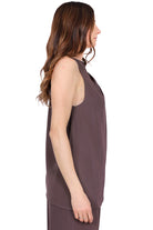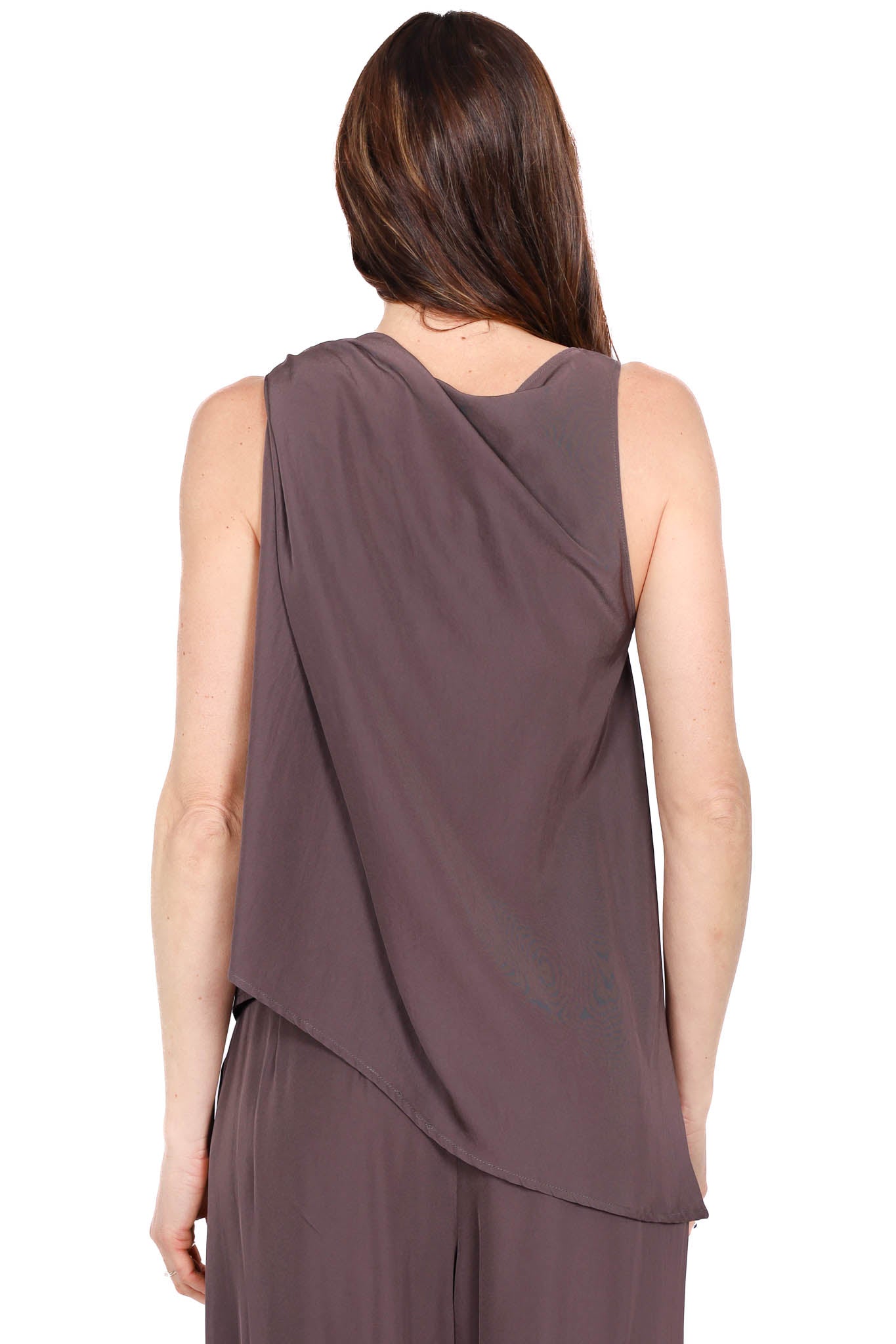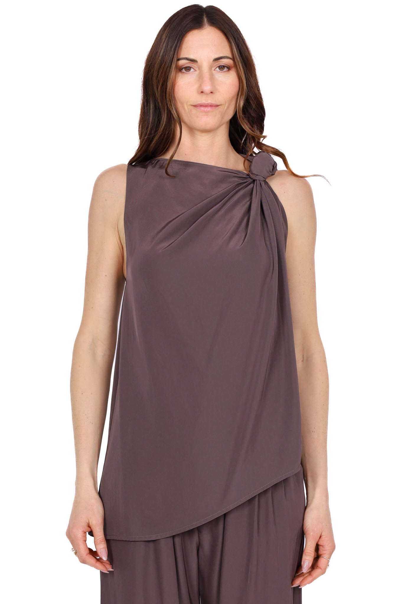 Top dal design elegante e fluido, caratterizzato da drappeggio laterale con dettaglio nodo sulla spalla. La linea morbida e asimmetrica dona movimento e un tocco sofisticato.