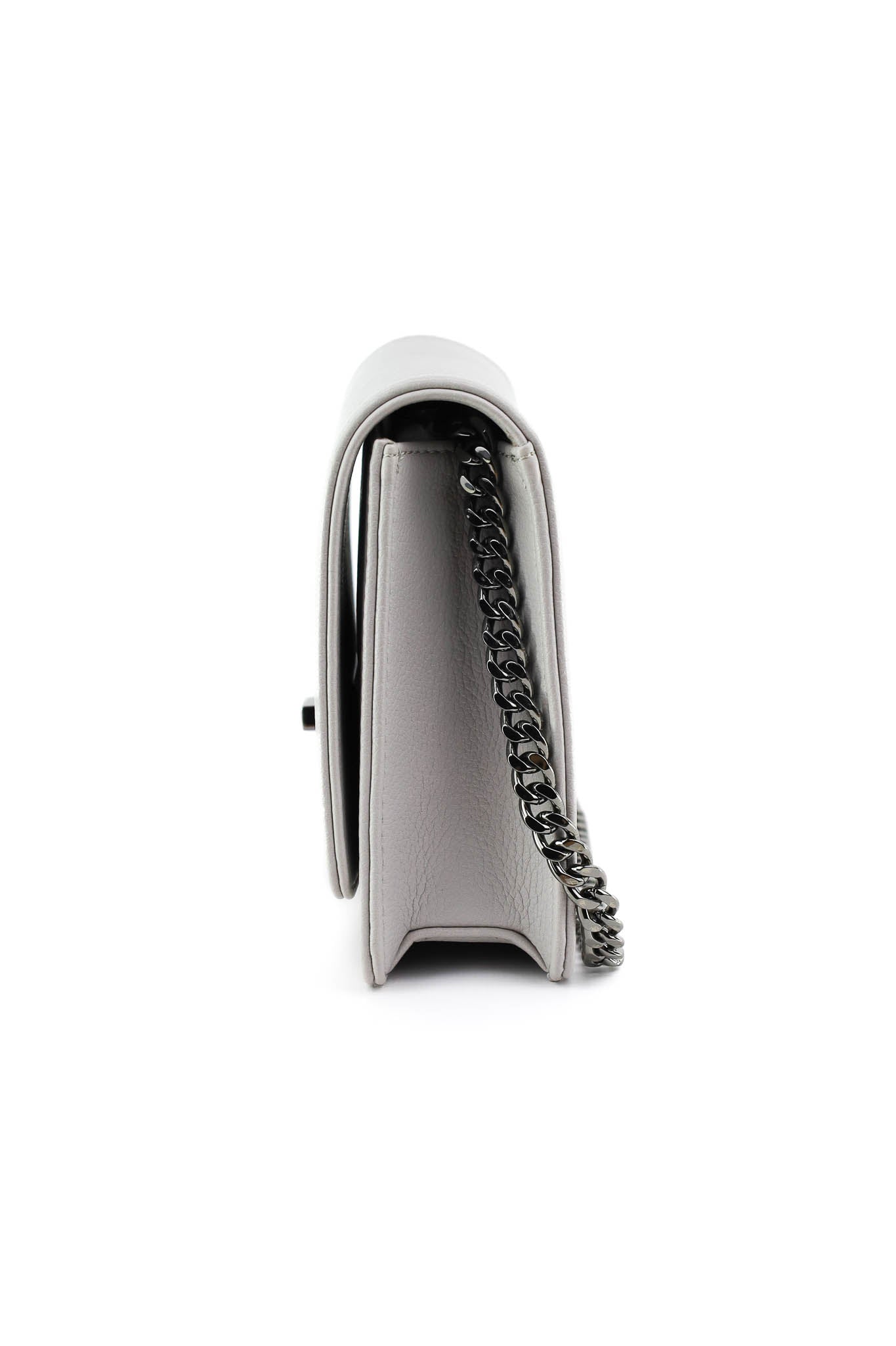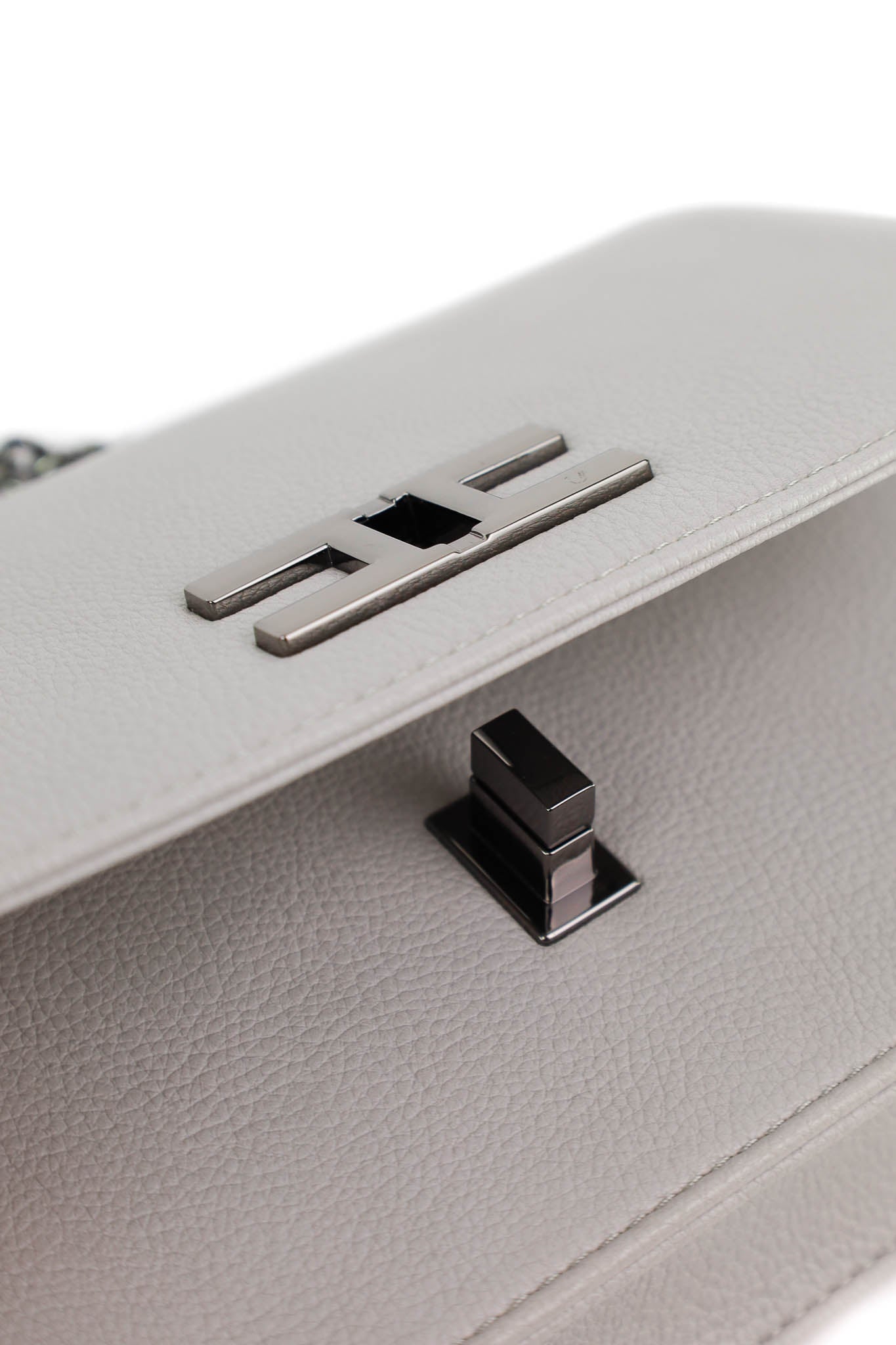 Borsa a tracolla in similpelle martellata grigia con linea essenziale, patta frontale e chiusura metallica geometrica canna di fucile. La catena grigio scuro aggiunge un tocco raffinato, perfetto per look da giorno eleganti o per la sera.