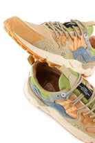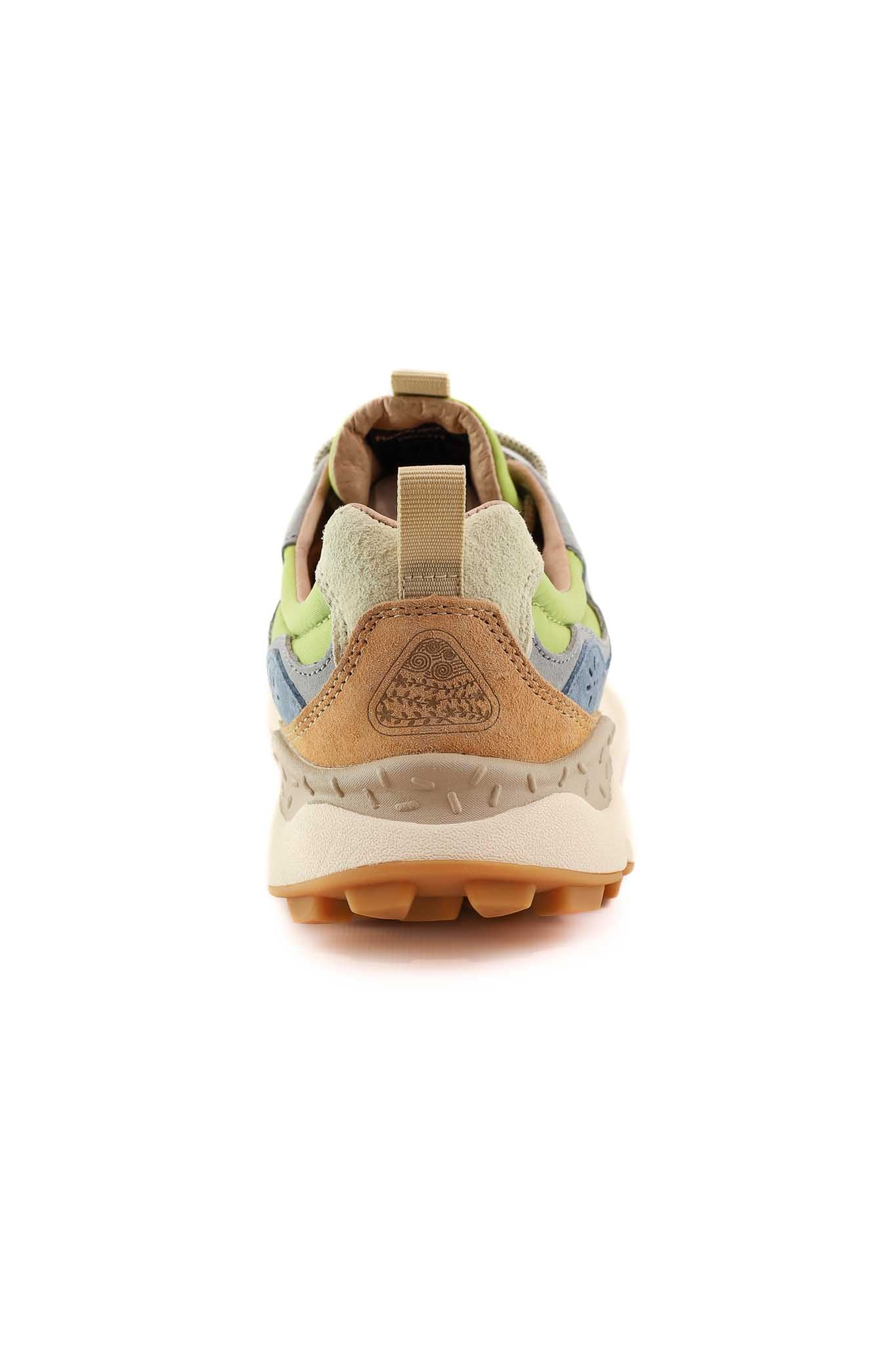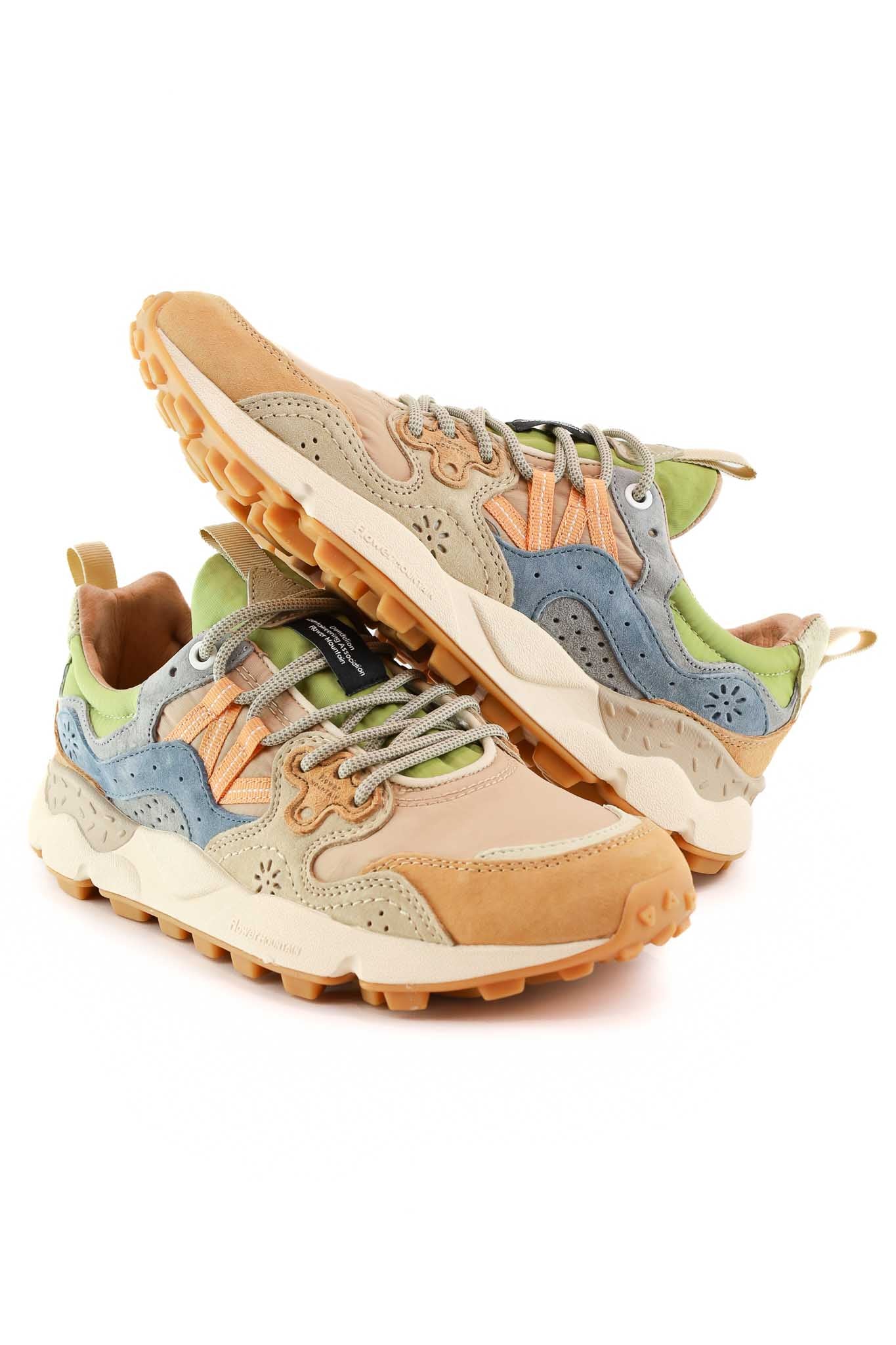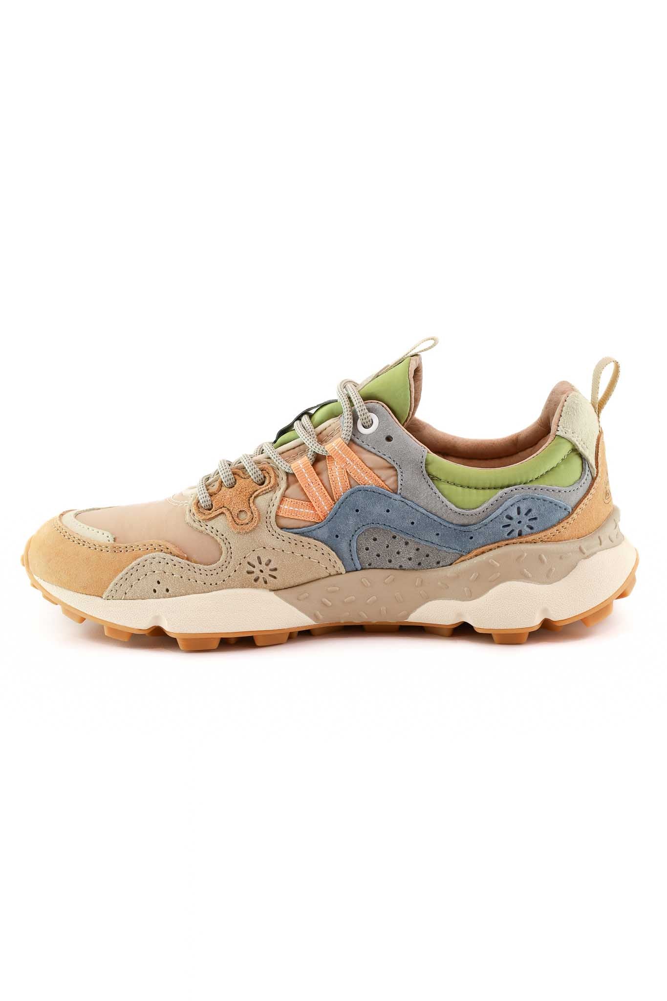 Sneakers Flower Mountain dal design trail con tomaia in suede e tessuto nei toni del beige, sabbia e verde salvia, arricchita da inserti color denim e dettagli arancio a contrasto. La struttura presenta forature decorative laterali, rinforzi in suede su punta e tallone e allacciatura trekking con lacci bicolore. La suola chunky in gomma color miele con battistrada garantisce aderenza e comfort, perfetta per look sporty-casual dall’ispirazione outdoor.