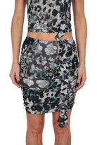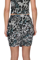 Gonna da donna in tulle elasticizzato con stampa animalier nei toni del nero, grigio e petrolio, dal design aderente e femminile che avvolge le forme mettendo in risalto la silhouette. L’intera superficie è caratterizzata da arricciature orizzontali che creano un effetto drappeggiato mentre il volant frontale verticale dona movimento al capo senza appesantire il look, perfetto con top coordinato o con bluse e maglie essenziali per outfit da sera dal carattere glam.