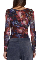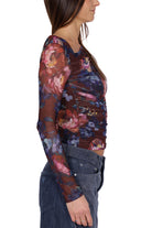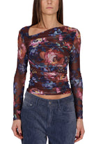 Top da donna in tulle elasticizzato semi-trasparente con stampa floreale multicolor su base marrone, caratterizzato da un originale scollo monospalla che lascia scoperta una spalla e incornicia il décolleté in modo femminile. La lavorazione arricciata su tutto il busto crea un effetto drappeggiato che avvolge la figura e slancia la silhouette senza appesantire il look, perfetto da abbinare a jeans o pantaloni sartoriali per outfit serali dal carattere romantico e contemporaneo.