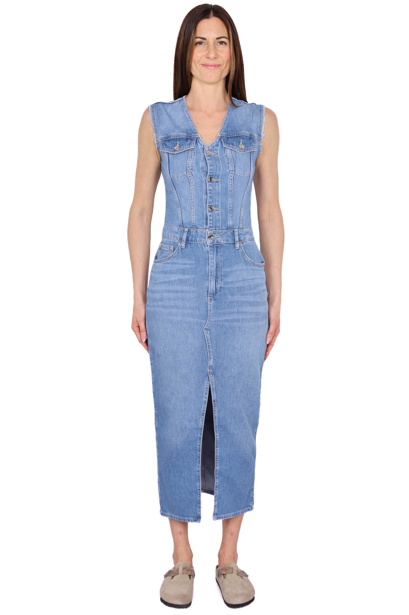 Abito in denim dal design femminile e strutturato, pensato per valorizzare la silhouette con un fit aderente e dettagli utility.