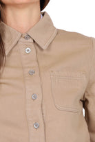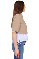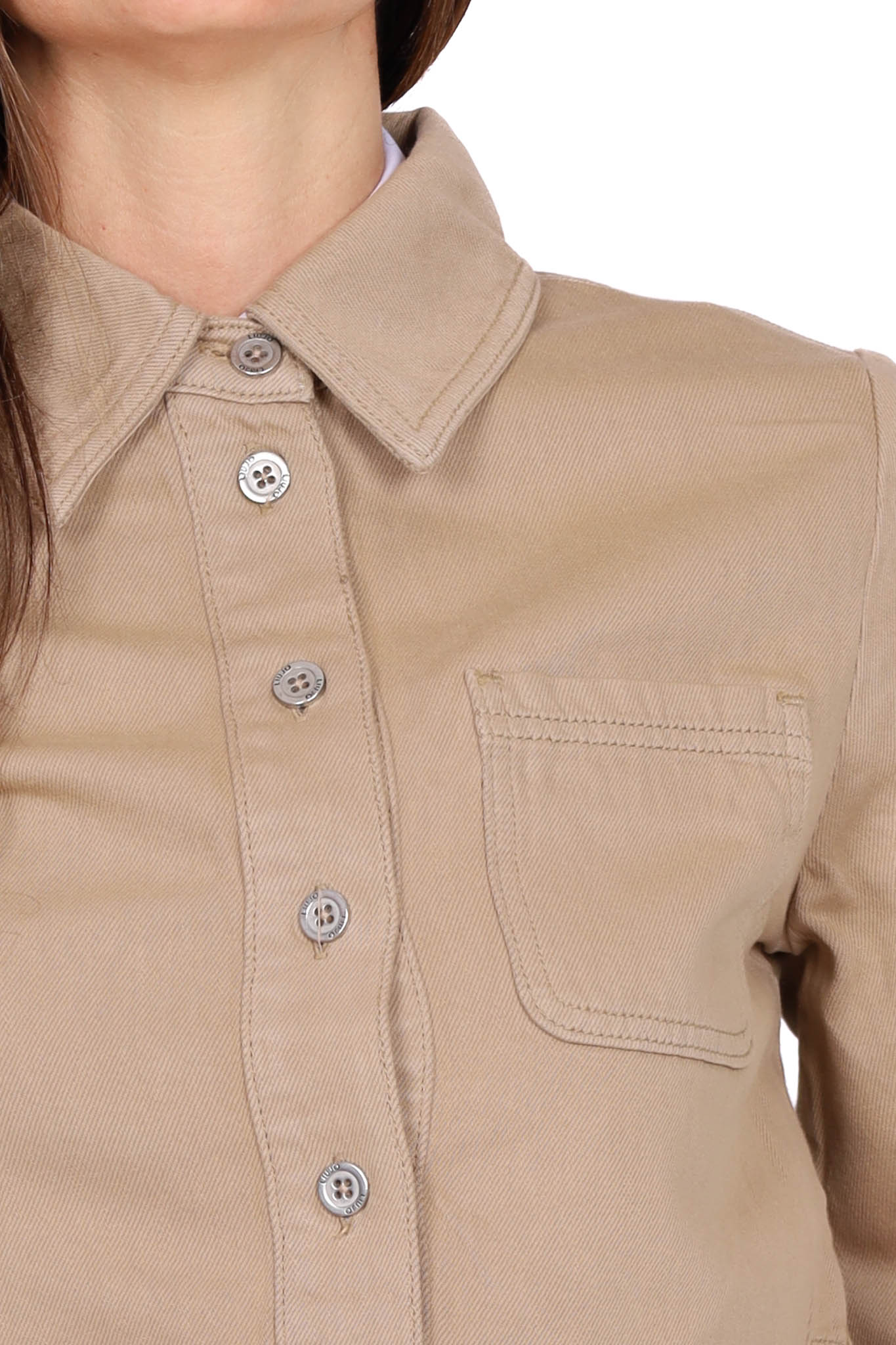 Colletto classico, chiusura con bottoni, maniche corte, taschino sul petto, lunghezza cropped