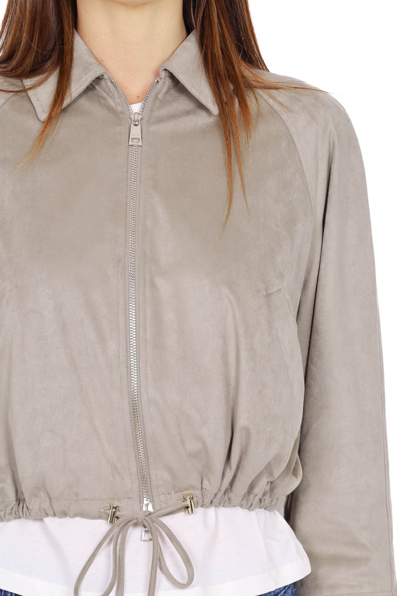 Giacca corta dal design contemporaneo, realizzata in tessuto effetto suede morbido e confortevole. Il modello cropped con coulisse regolabile in vita valorizza la silhouette, mentre la chiusura con zip e il taglio pulito la rendono perfetta per look casual-chic di stagione.