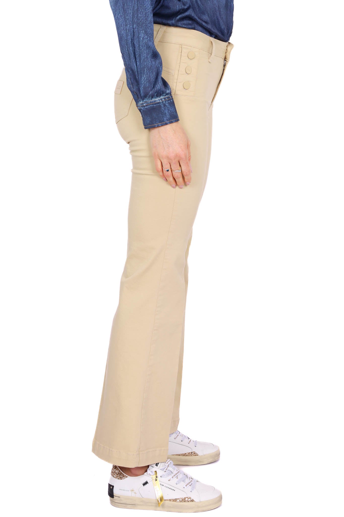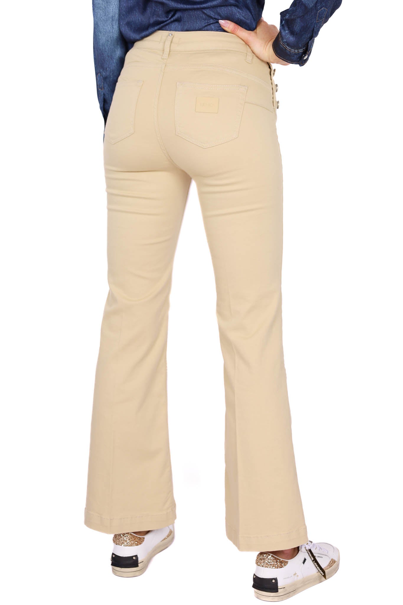 Pantalone dal taglio flare che slancia la silhouette, realizzato in cotone stretch per garantire comfort e vestibilità impeccabile. Il design essenziale è arricchito da bottoni decorativi sui fianchi che aggiungono un dettaglio raffinato e contemporaneo.