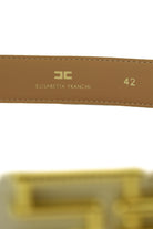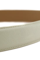 Cintura da donna in pelle liscia color panna, dal design essenziale e raffinato, perfetta per valorizzare il punto vita su pantaloni, gonne e abiti grazie al profilo sottile e alla nuance chiara e versatile. La maxi fibbia rettangolare dorata con lavorazione geometrica e logo centrale aggiunge un tocco di luce e carattere al look, trasformando l’accessorio in un vero dettaglio gioiello.