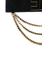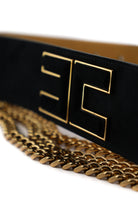 Cintura in camoscio nero dalla fascia ampia, impreziosita da fibbia centrale dorata con doppio logo geometrico che dona un tocco deciso e sofisticato alla silhouette. Le tre catene dorate che scendono creano un elegante effetto gioiello, perfetto per valorizzare abiti, blazer e gonne in look da sera o occasioni speciali.