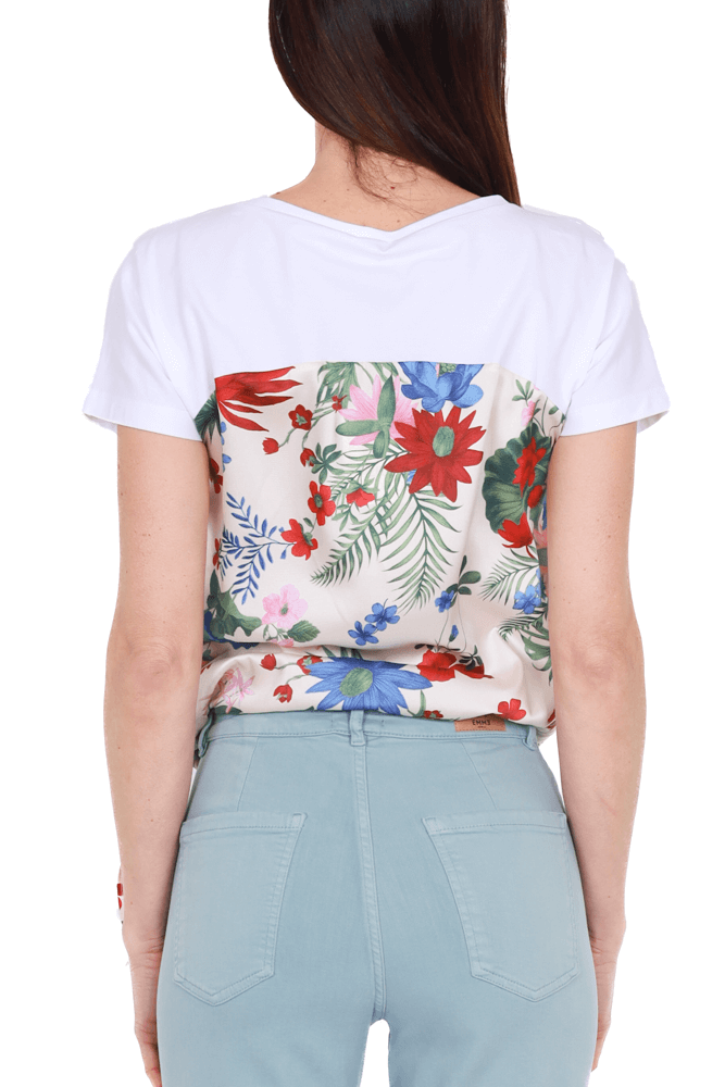 T shirt mezza manica con inserto di tessuto di raso stampa floreale