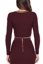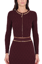 Cardigan corto da donna in maglia bordeaux con motivo geometrico all-over, scollo tondo impreziosito da catena oro e chiusura zip centrale con tirazip logato. Maniche lunghe, vestibilità aderente e dettaglio catena sulla vita, perfetto da abbinare ad abiti o gonne coordinate per un look sofisticato e moderno. Composizione tessuto 50% Viscosa 28% Poliestere 22% Poliammide.