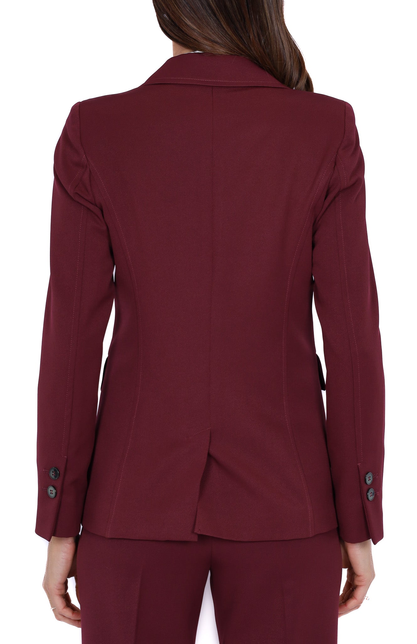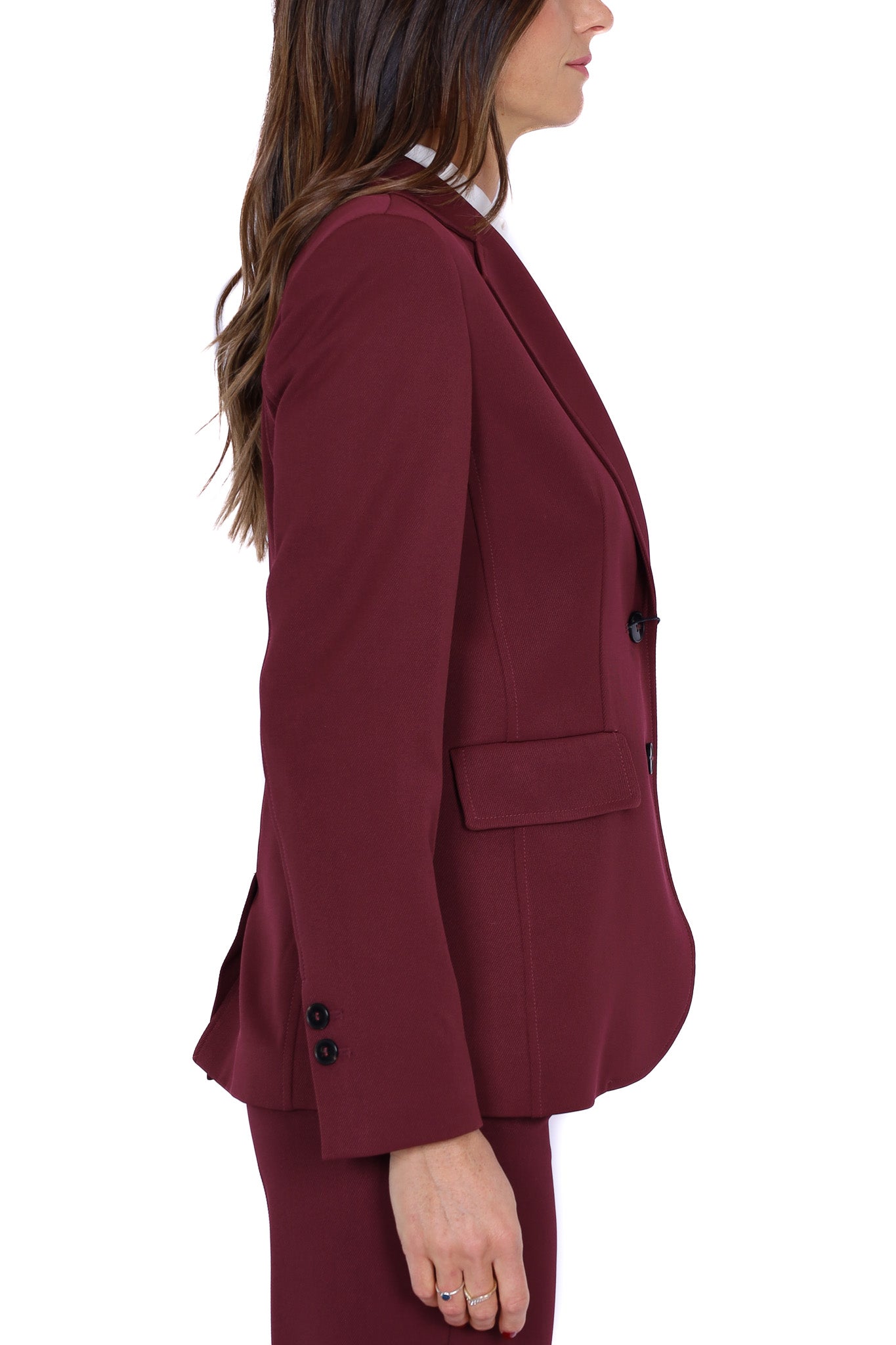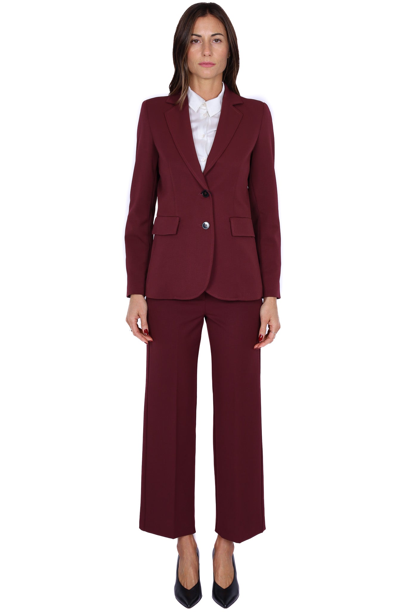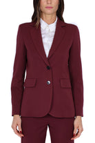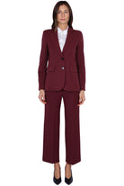 Blazer monopetto da donna color bordeaux in tessuto strutturato, linea slim e chiusura con due bottoni frontali. Rever classico, tasche anteriori con patta e spacco centrale sul retro per una maggiore vestibilità. Perfetto come parte di un completo elegante o per valorizzare look più casual.