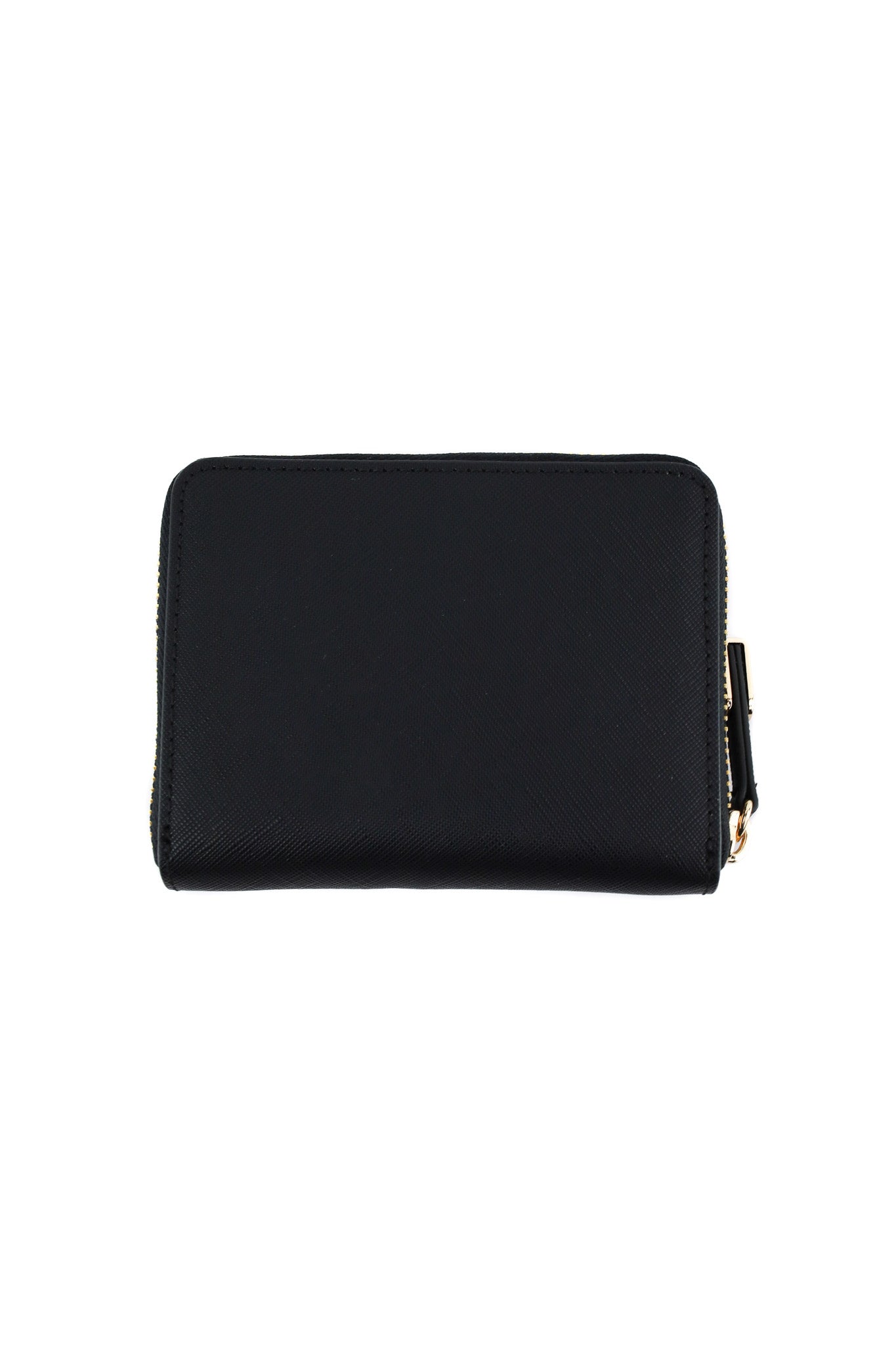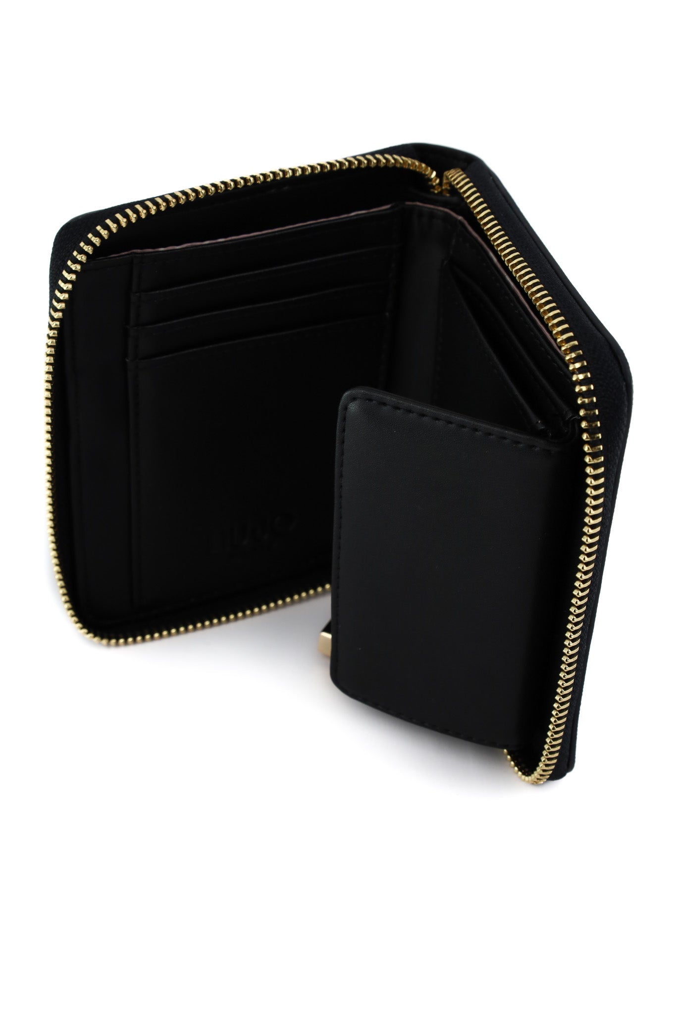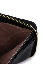 Portafoglio compatto in materiale effetto saffiano nero, caratterizzato dal maxi logo LIU JO MILANO embossato tono su tono sul fronte e da una chiusura con zip dorata su tre lati. L’interno è organizzato con slot per carte, scomparto per banconote e taschino portamonete con pattina, offrendo praticità e stile in un formato ideale per borse di piccole e medie dimensioni.