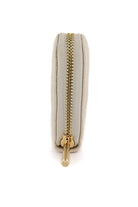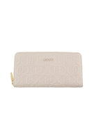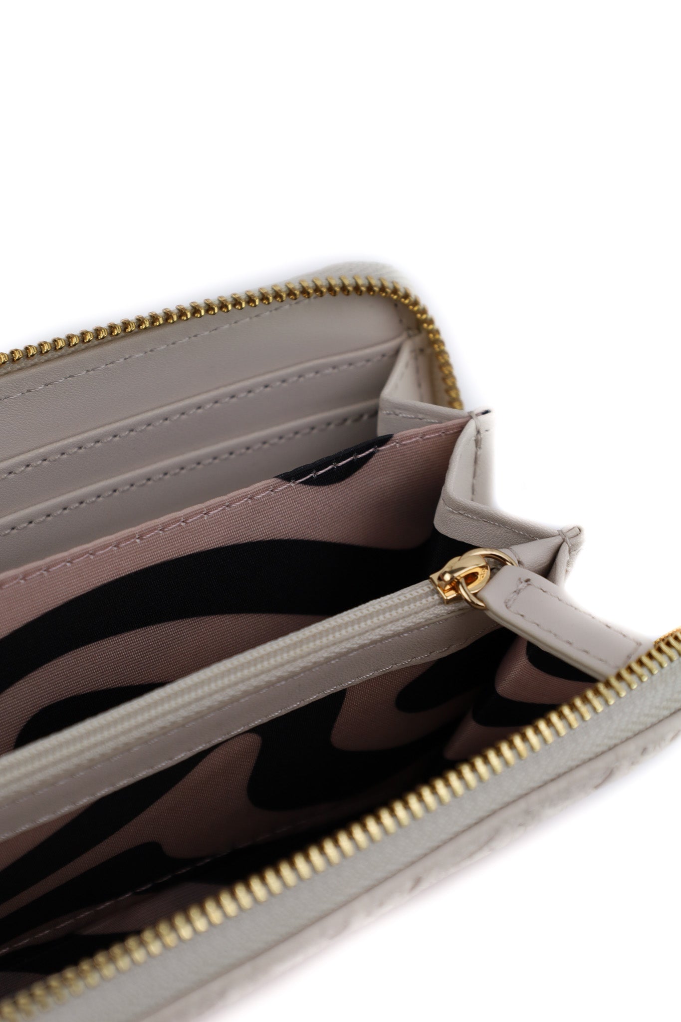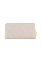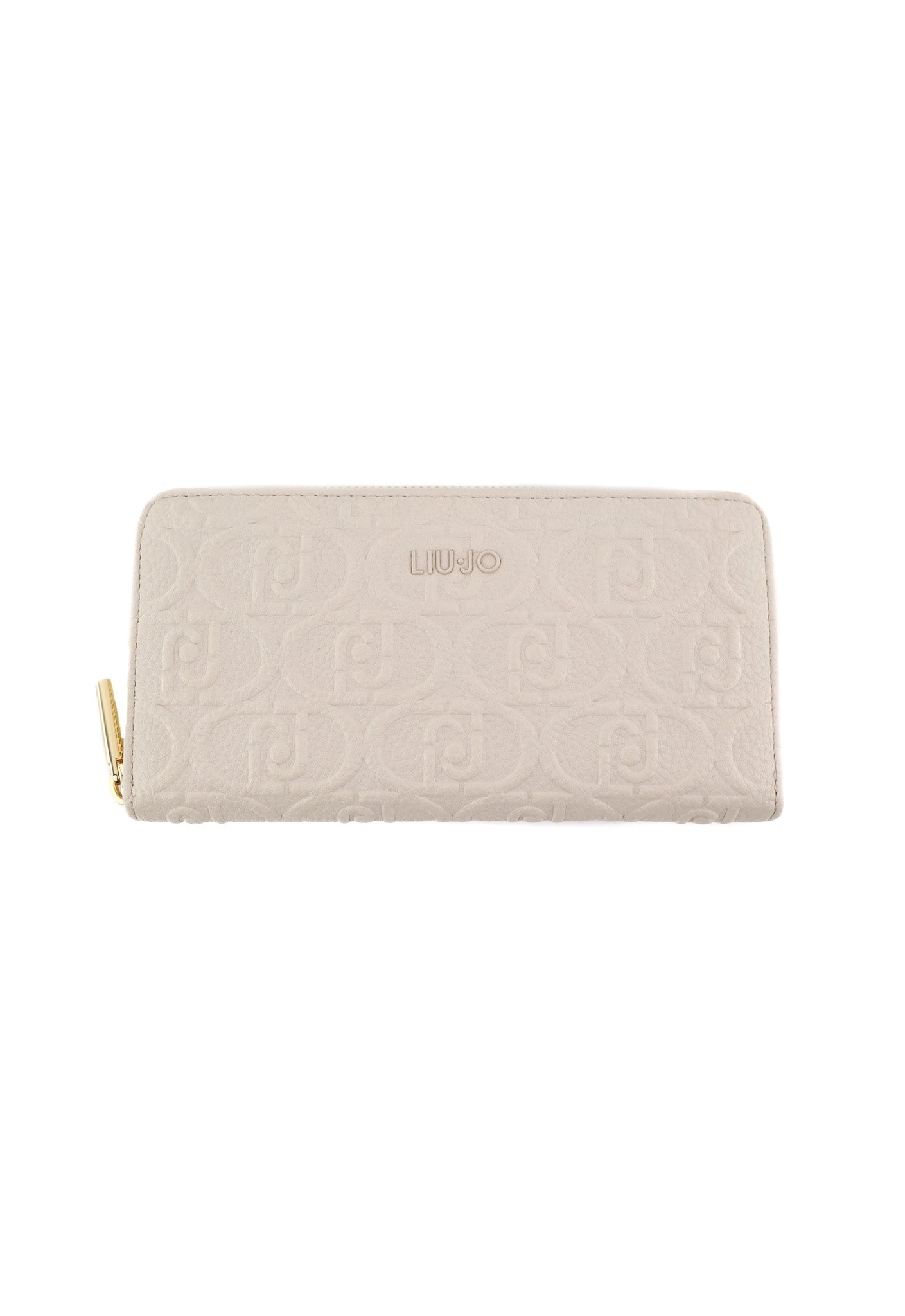 Portafoglio lungo in materiale effetto pelle color panna, caratterizzato dal logo monogram LJ in rilievo all over e da una pratica chiusura con zip dorata su tre lati. L’interno, foderato con tessuto stampato, offre scomparti organizzati per banconote, tasca centrale con zip per monete e numerosi slot per carte, ideale per chi cerca capienza e stile luminoso in un unico accessorio.