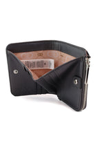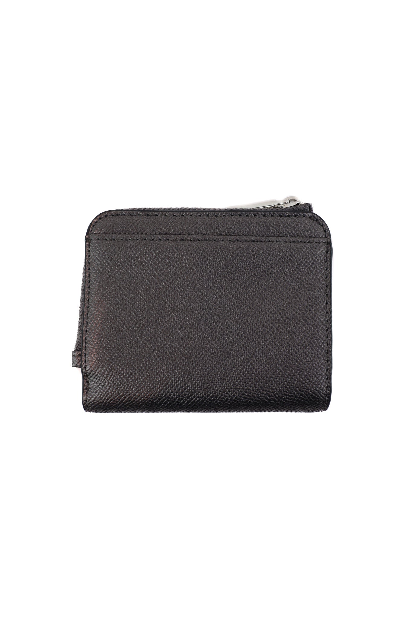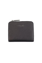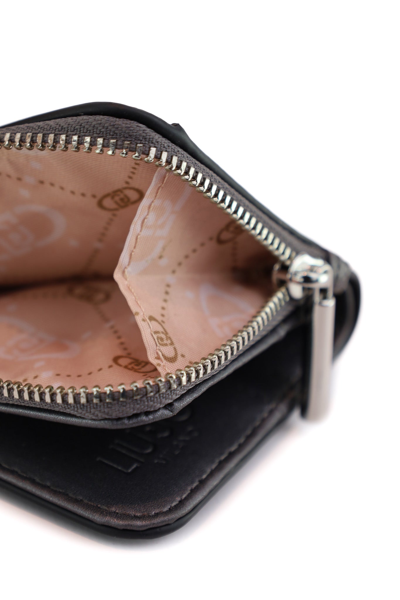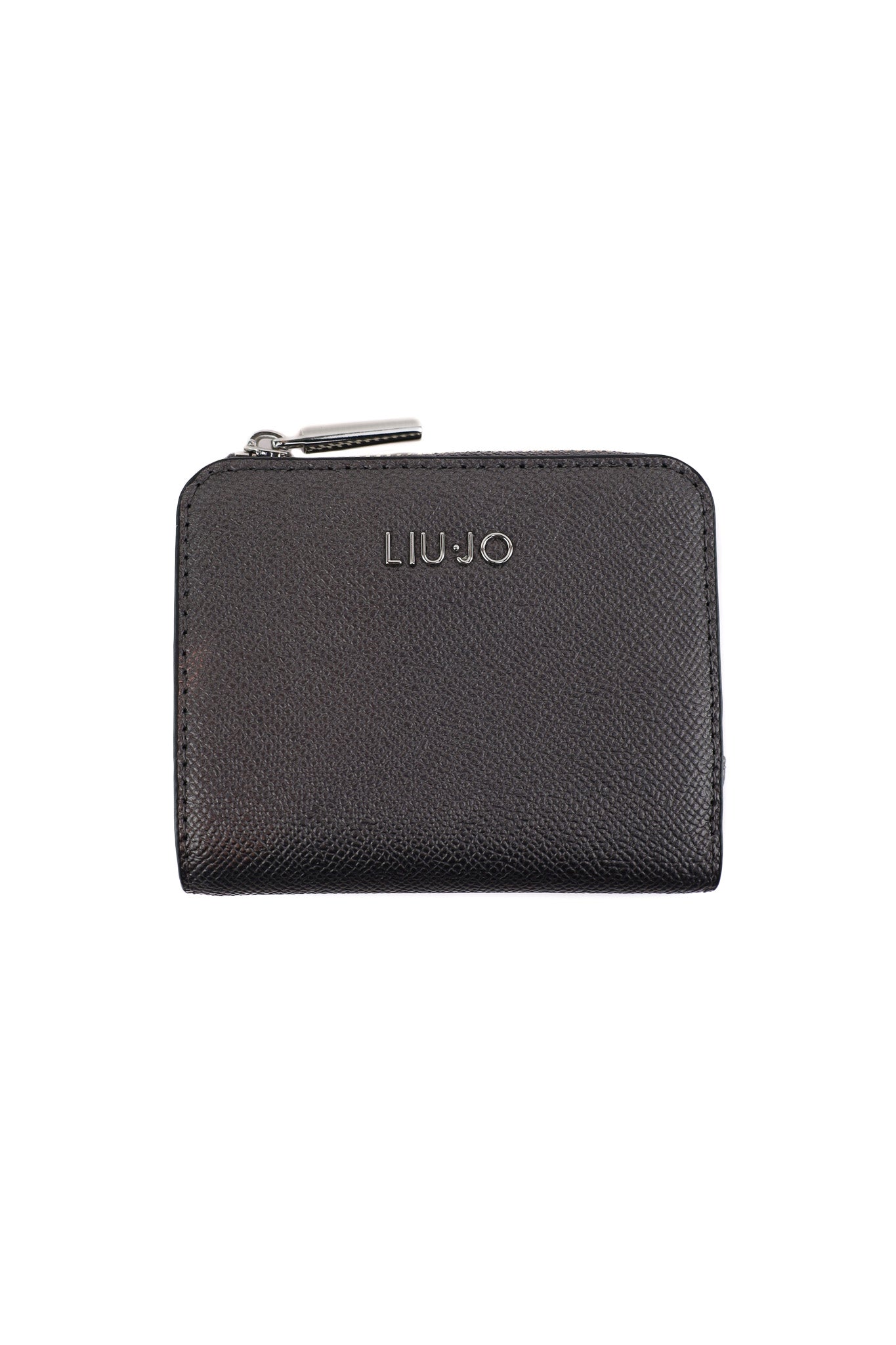 Portafoglio compatto in materiale effetto saffiano nero con logo LIU JO in metallo silver sul fronte e chiusura con zip su tre lati, pratico da tenere in borsa o in mano. L’interno, foderato con pattern logato, è organizzato con scomparti per carte, banconote e monete, offrendo massima funzionalità in un design essenziale e moderno