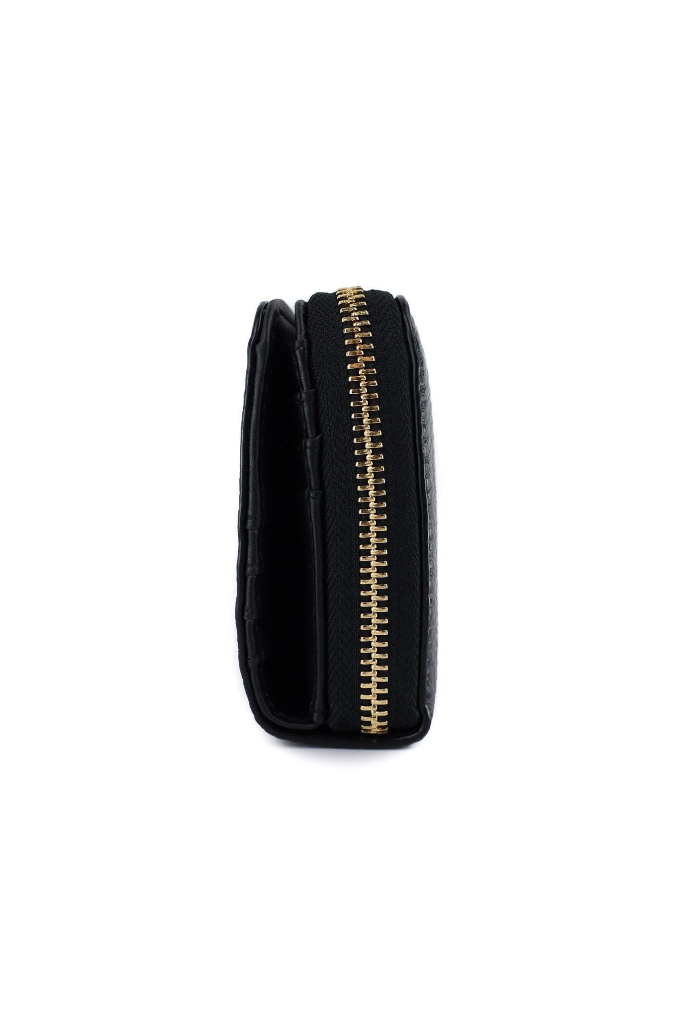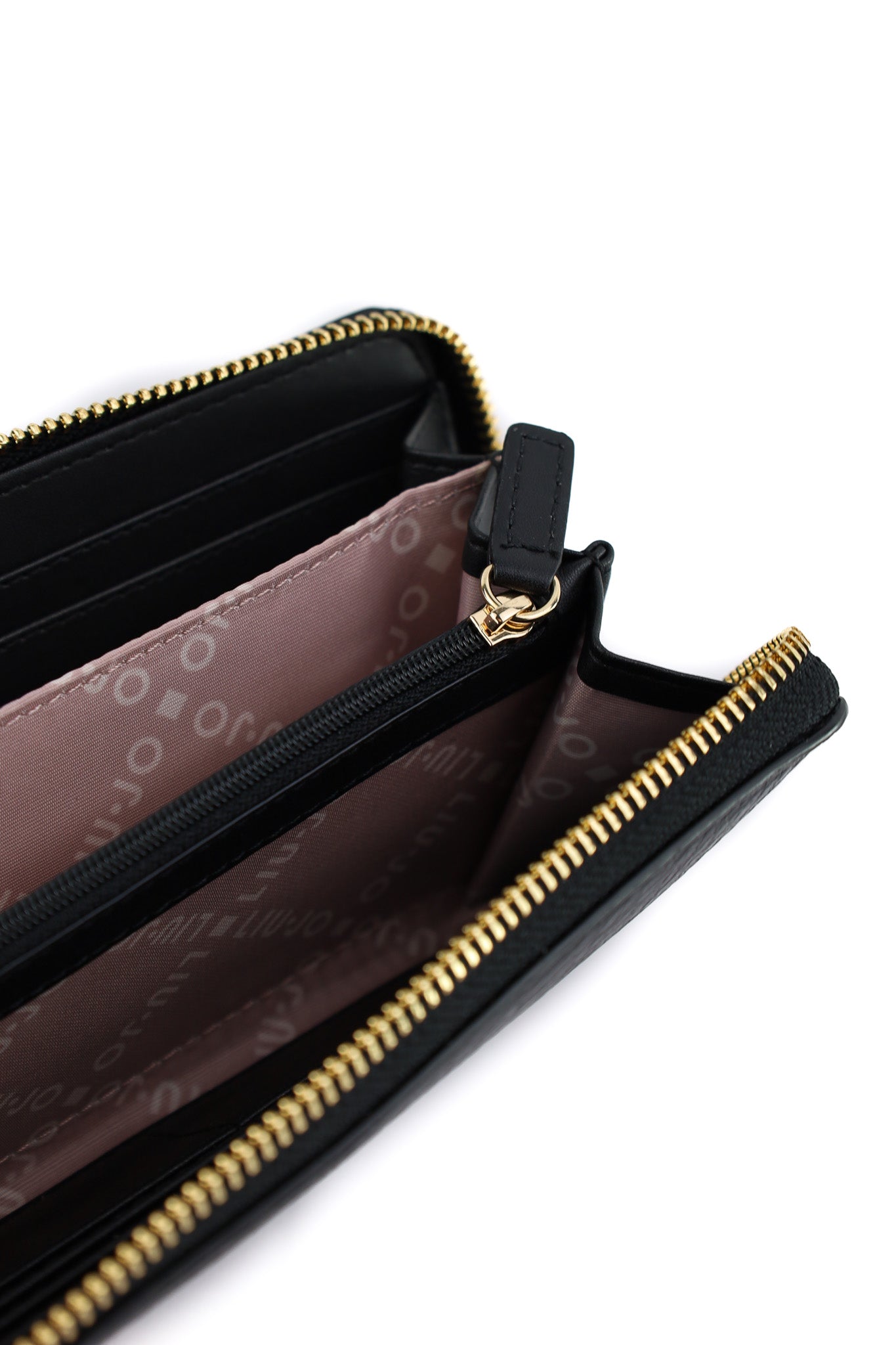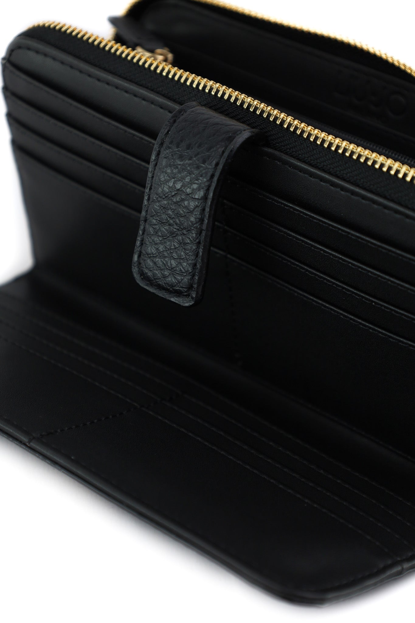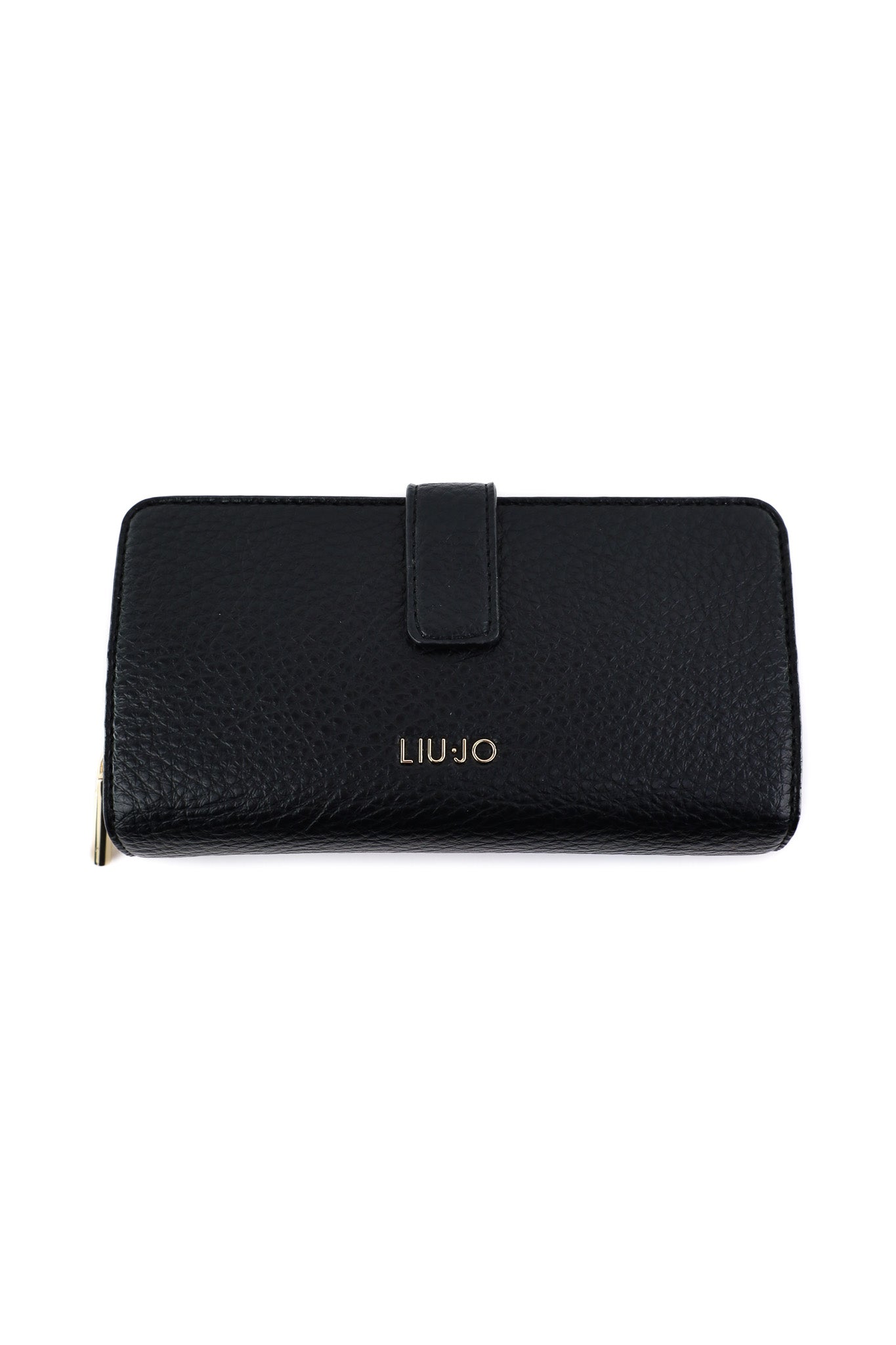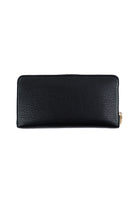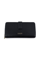 Portafoglio lungo in materiale effetto pelle martellata nera, impreziosito dal logo LIU JO in metallo dorato sul fronte e chiuso da zip dorata su tre lati per una maggiore sicurezza. L’interno, foderato con tessuto logato, è organizzato con ampi scomparti per banconote, tasca centrale con zip per monete e numerosi slot per carte, perfetto per chi desidera capienza e stile in un unico accessorio