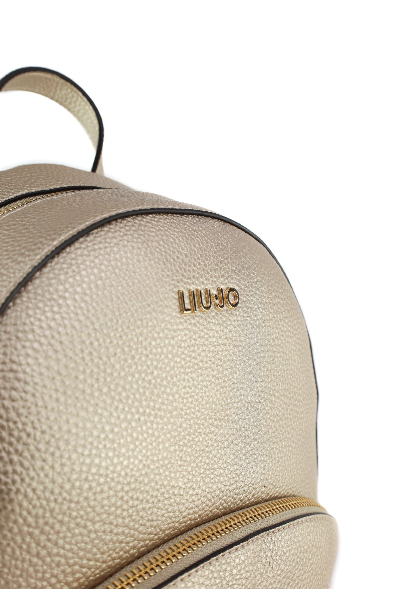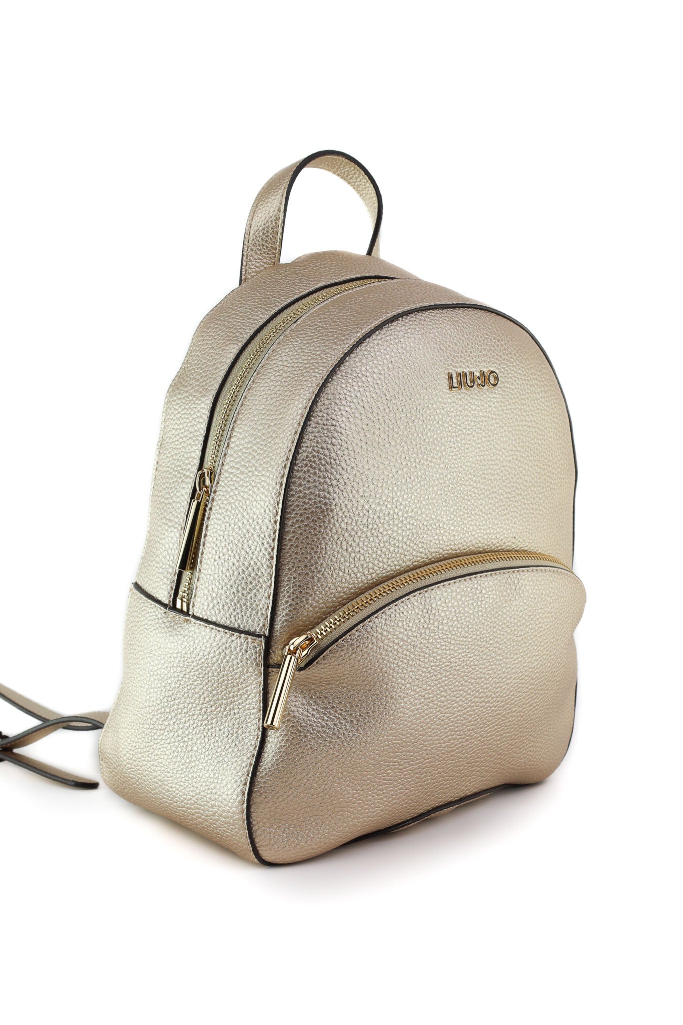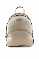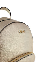 Zainetto Liu Jo in materiale sintetico effetto pelle martellata color oro chiaro, con profili neri a contrasto, logo metallico frontale e tasca esterna con zip dorata. Gli spallacci regolabili e il manico superiore lo rendono pratico e versatile, ideale per illuminare outfit casual o completi più eleganti.
