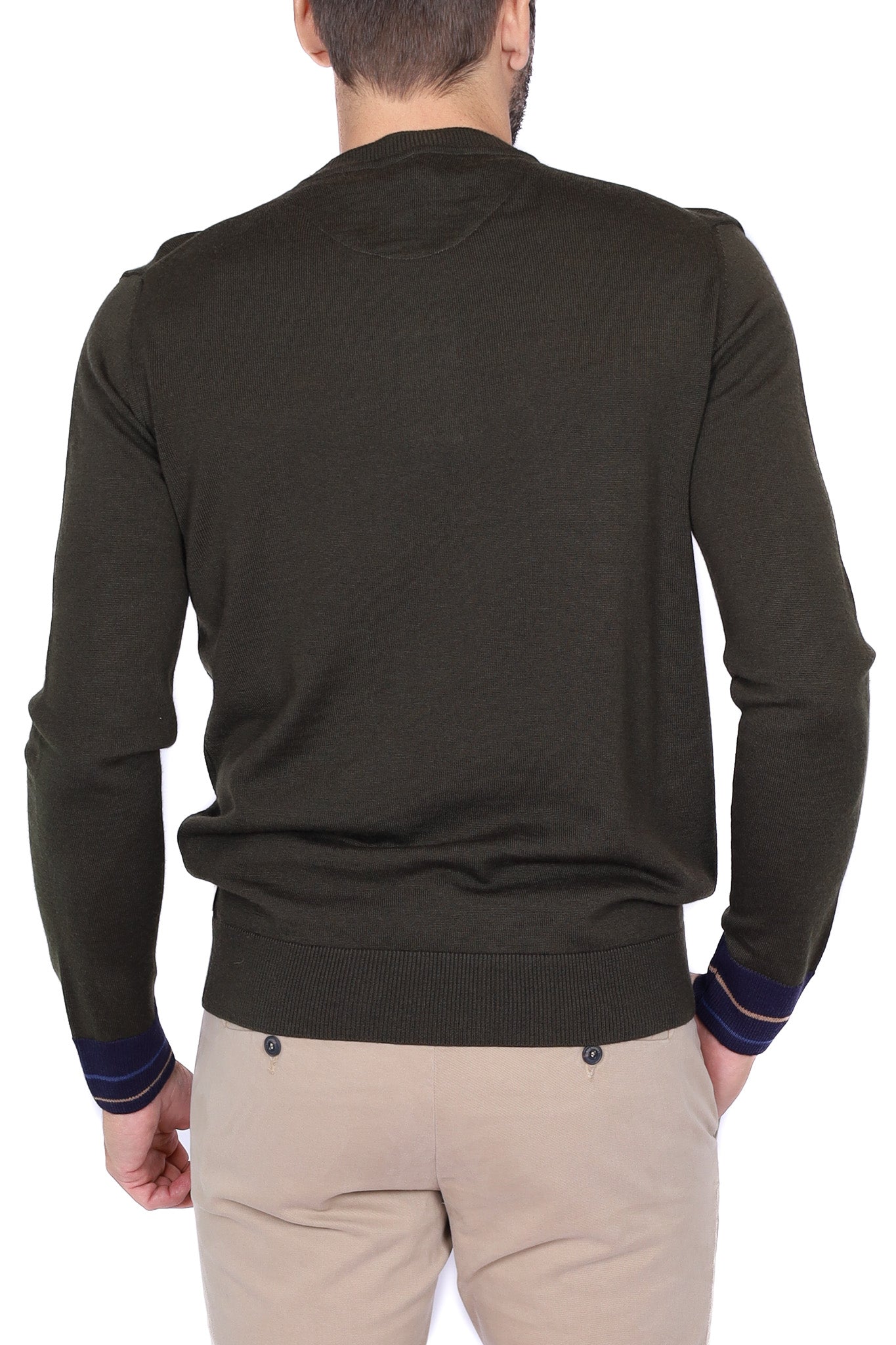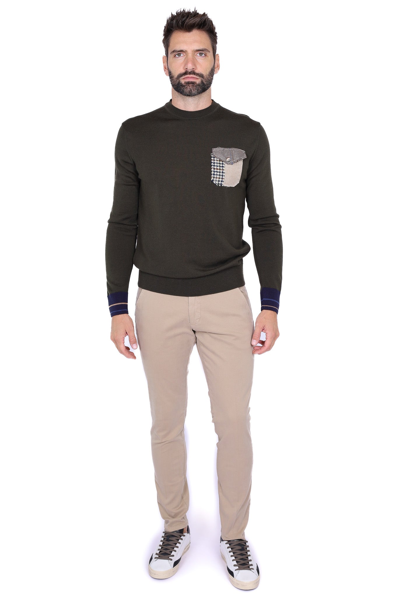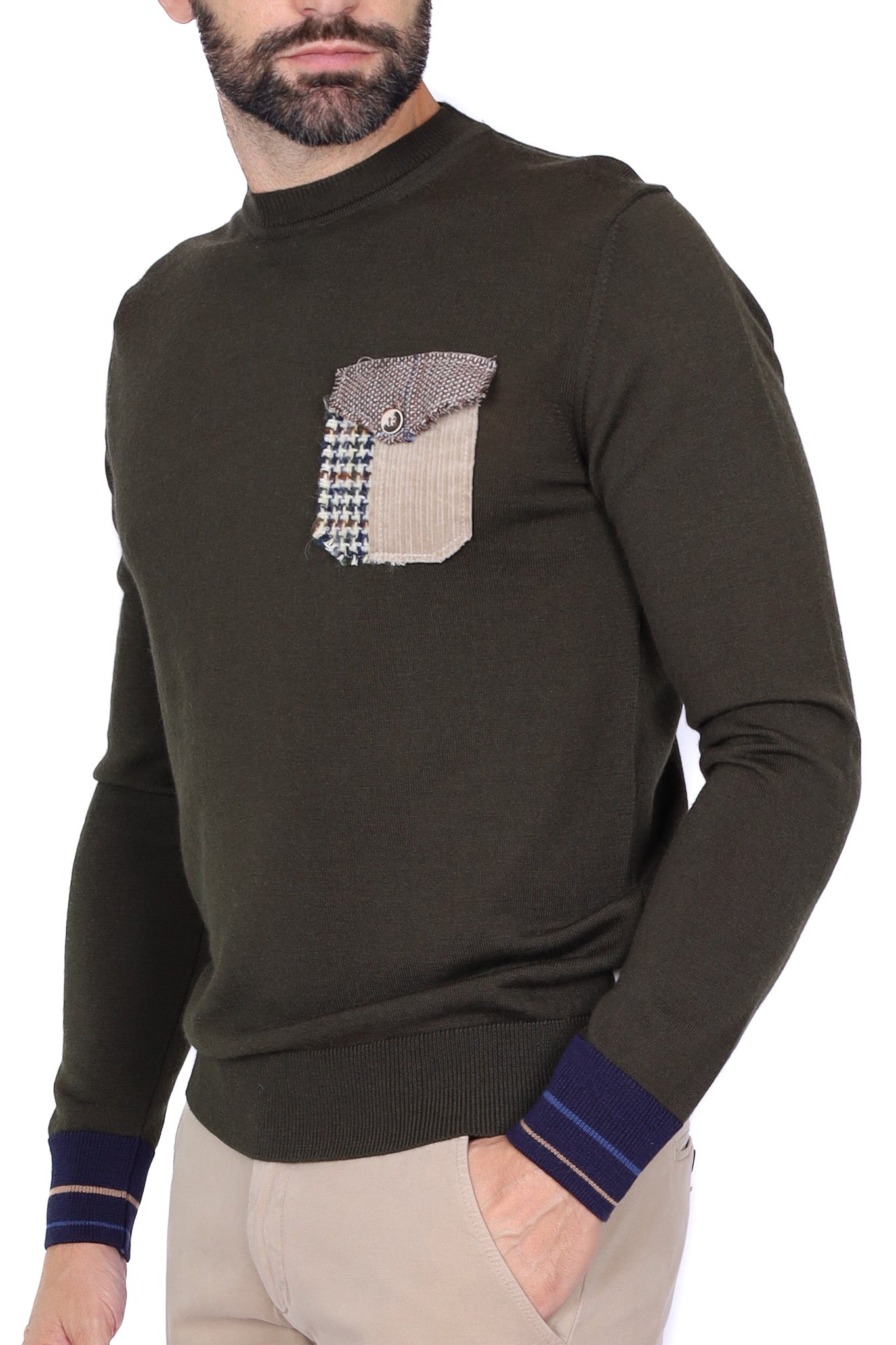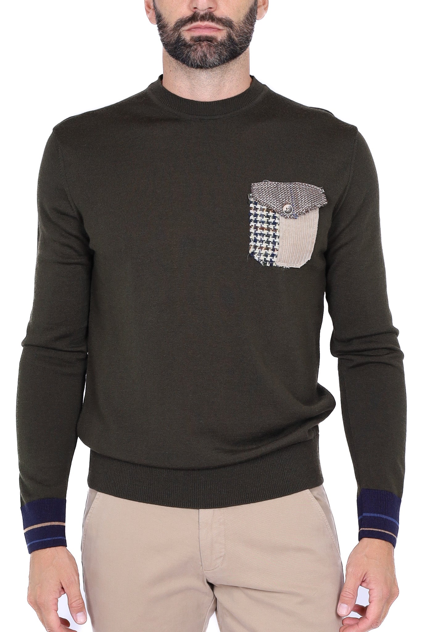 Maglia uomo girocollo in lana merino con taschino verde militare