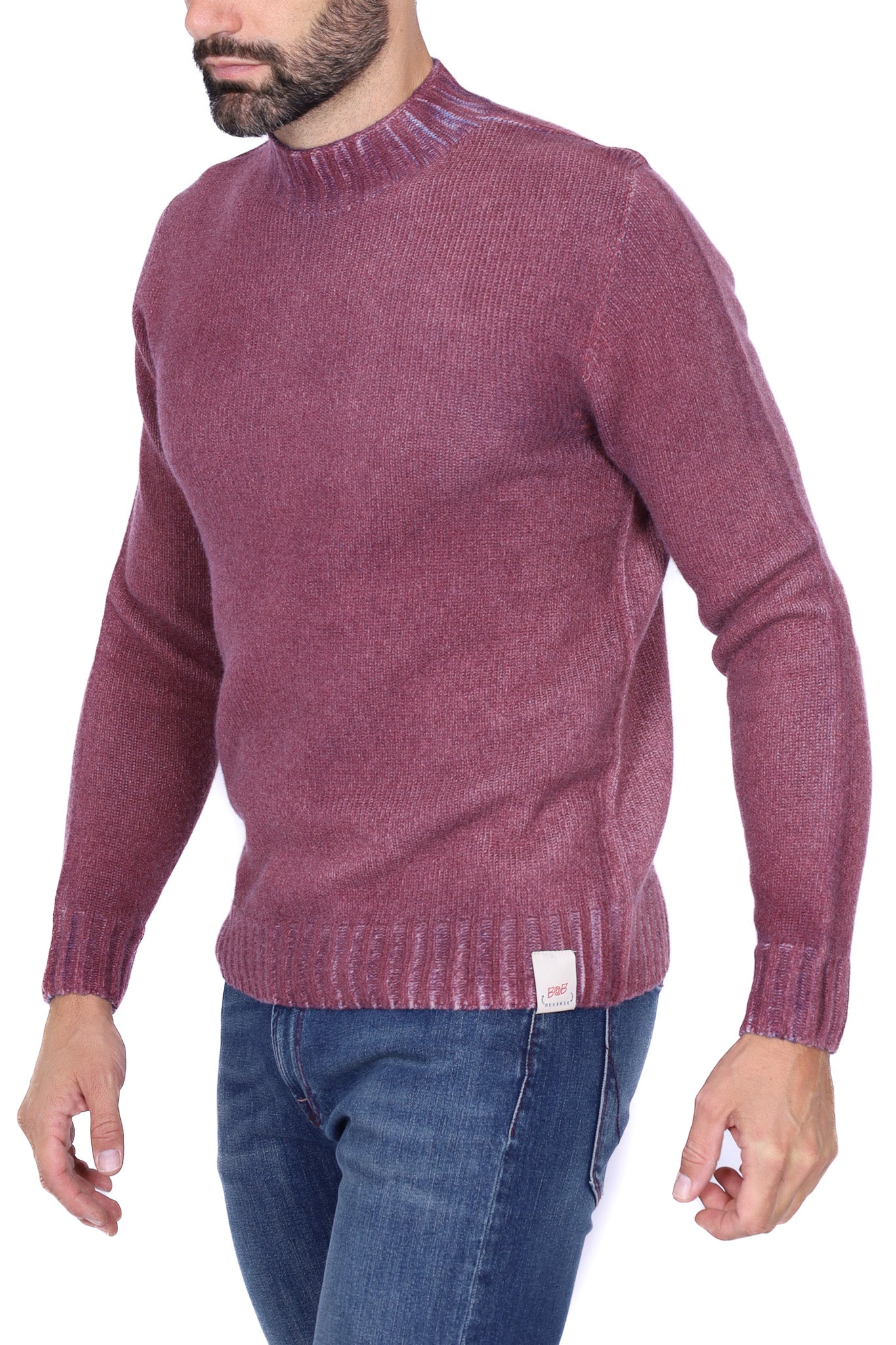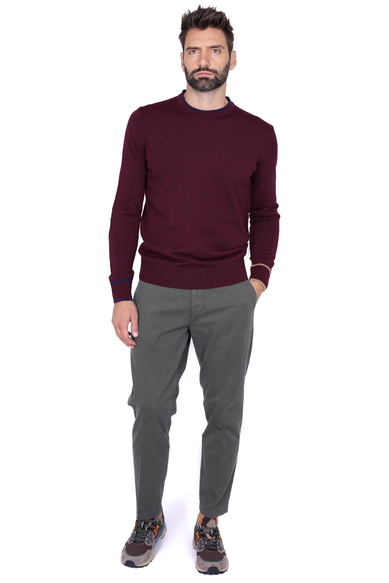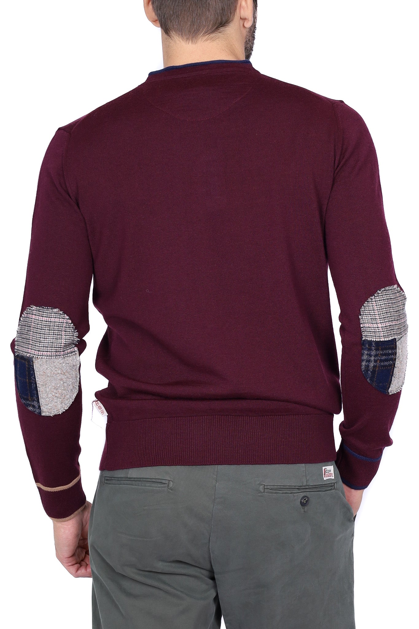 Maglia uomo girocollo con toppe patchwork bordeaux