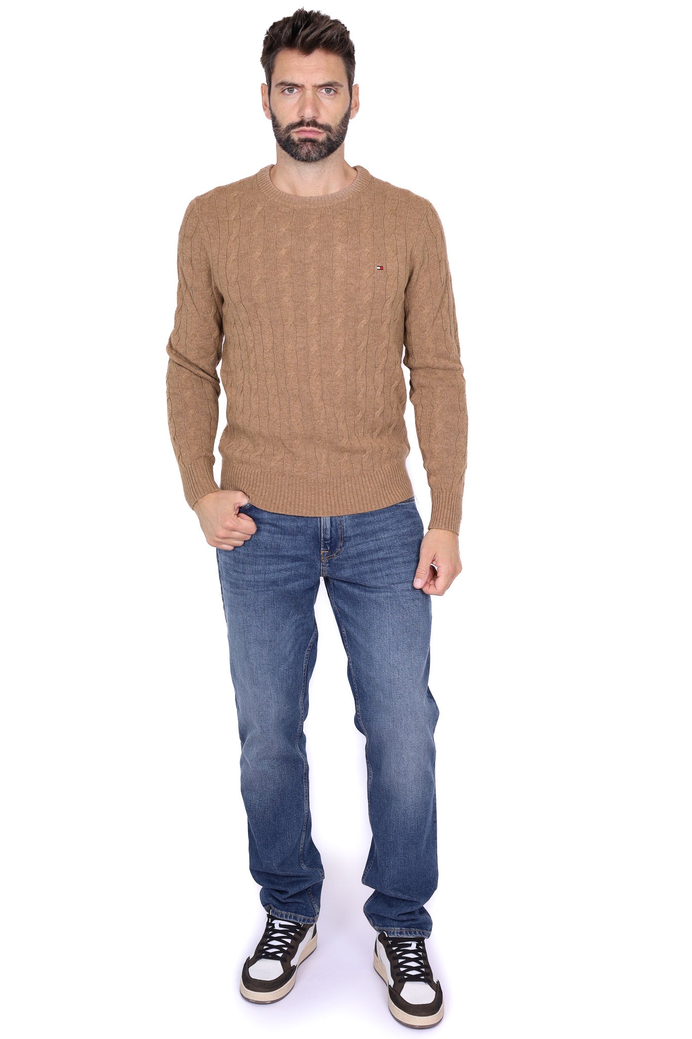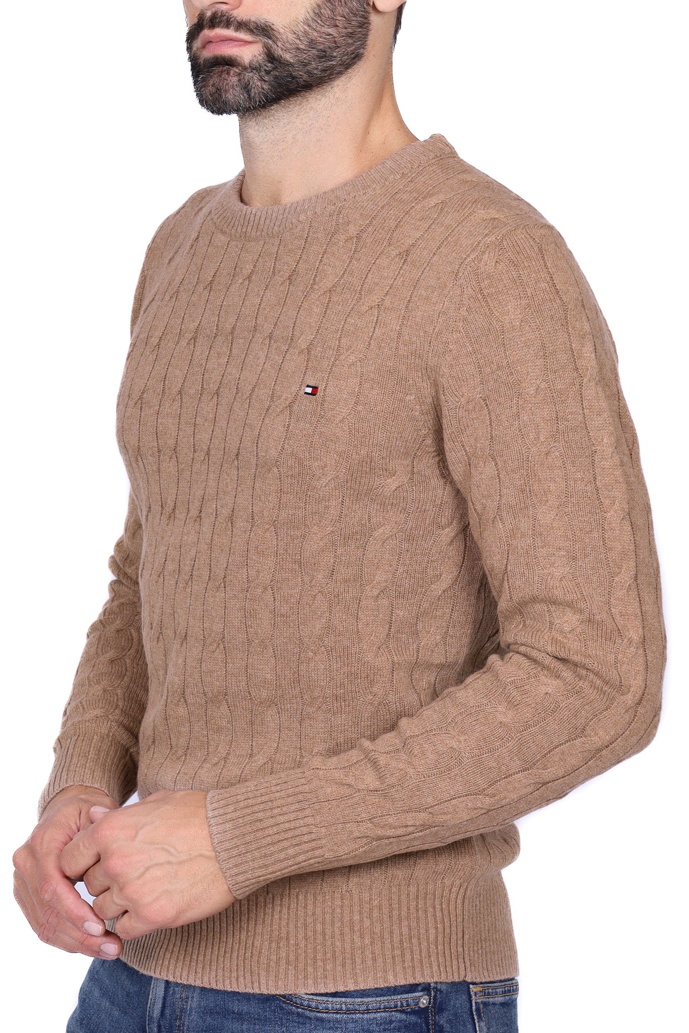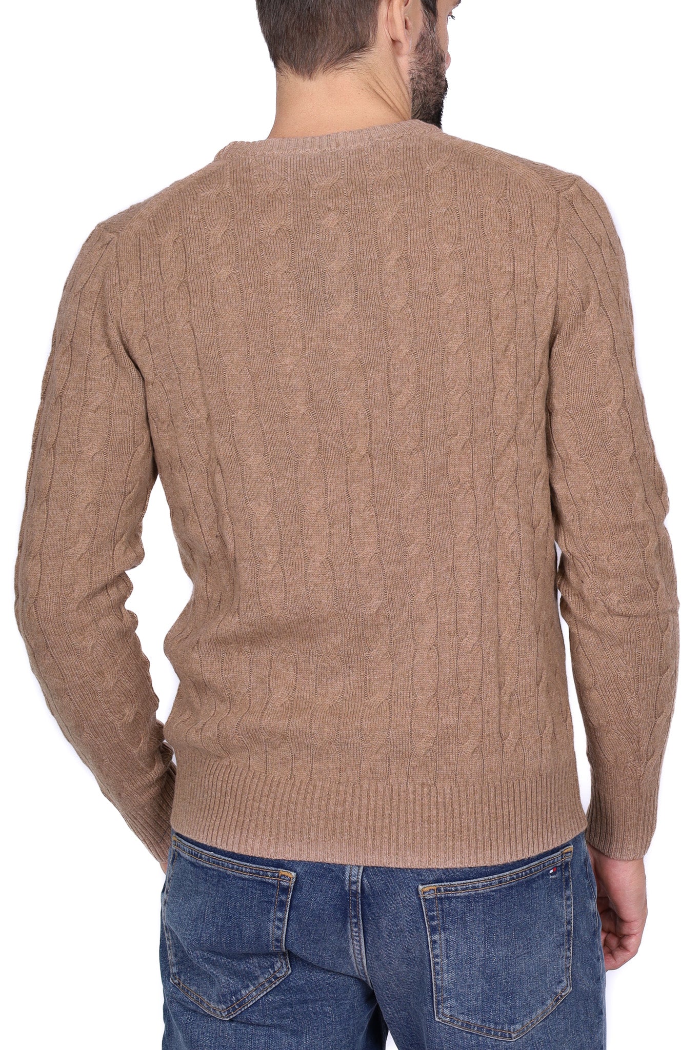 Maglione uomo treccia girocollo cammello