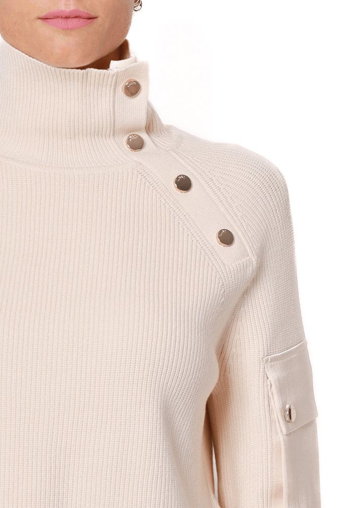 Maglia dolcevita in misto viscosa lavorazione a coste modello con bottoni decorativi sul collo e tascone in raso sulla manica