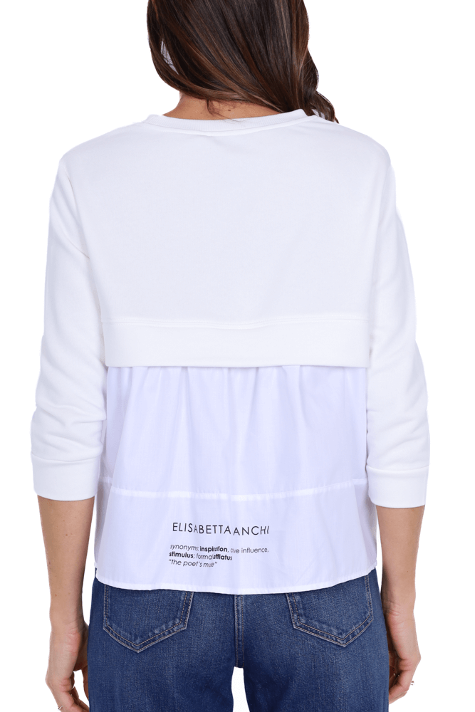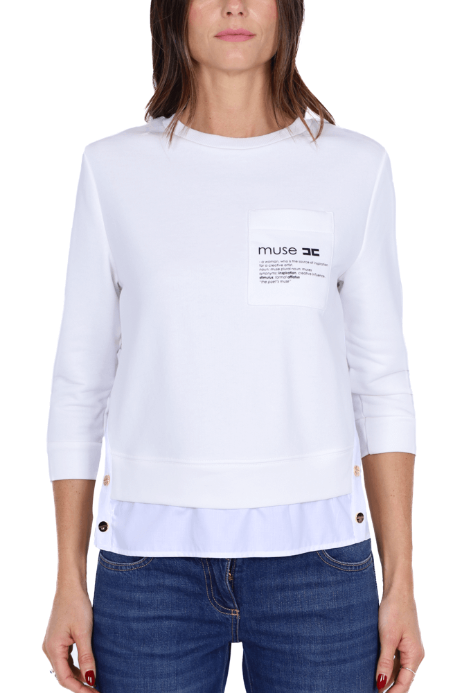 Felpa da donna in cotone bianco con taschino frontale, dettaglio stampa "muse" e inserto in tessuto tecnico tono su tono sul fondo. Retro caratterizzato da stampa logo Elisabetta Franchi e frase d’ispirazione, maniche 3/4 e bottoni dorati decorativi sui fianchi. Vestibilità regular. Composizione tessuto 65% cotone 35% poliestere