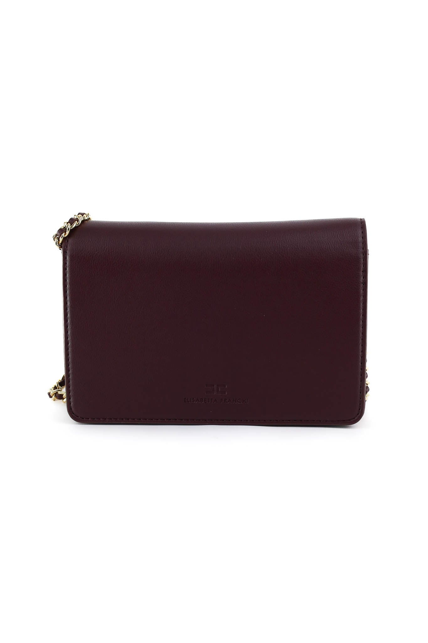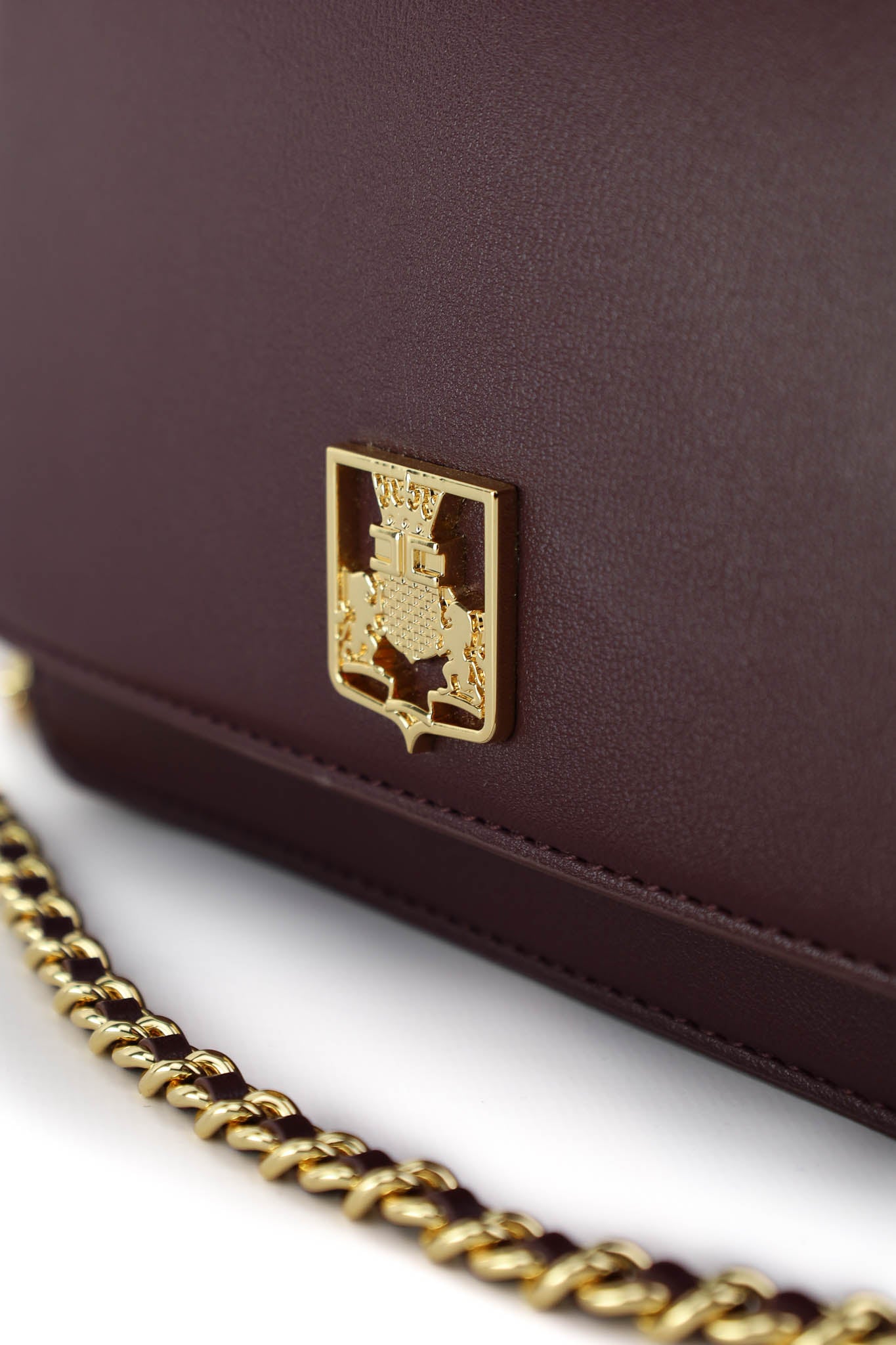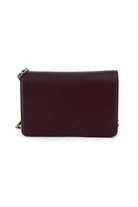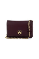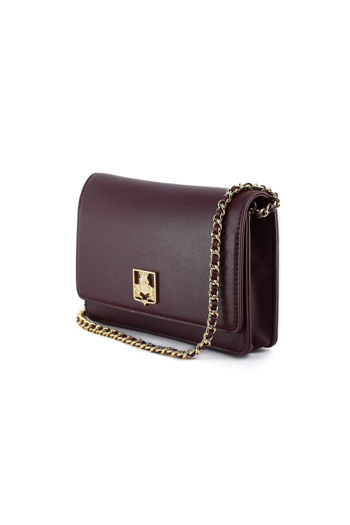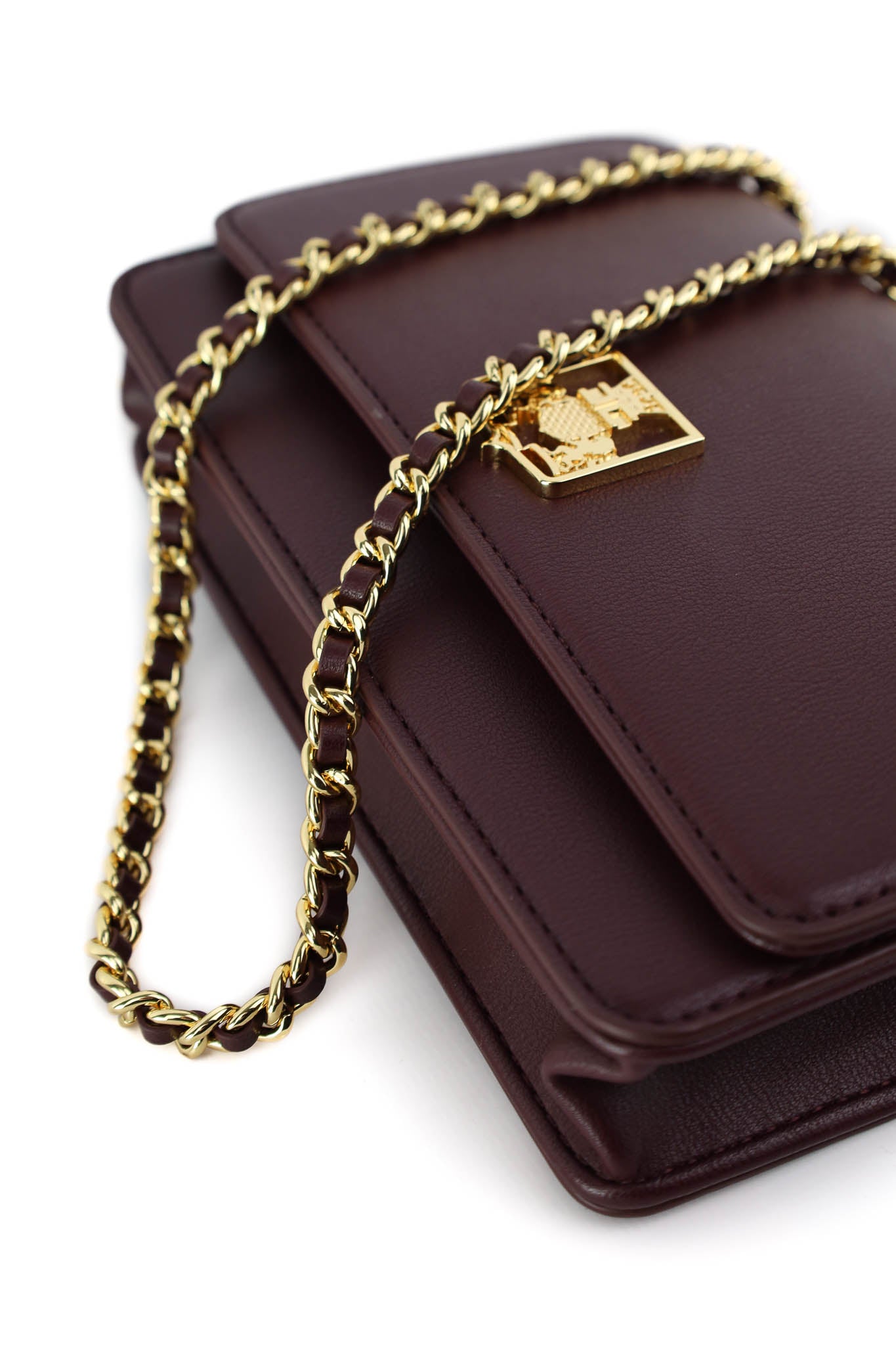 Borsa a tracolla in similpelle lucida color bordeaux, con catena dorata e logo metallico frontale. La forma rettangolare compatta offre spazio per essentials, rendendola versatile per aperitivi, cene o eventi serali.