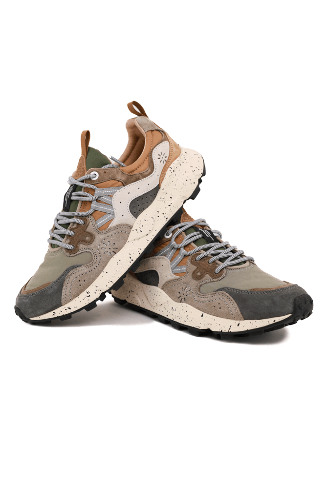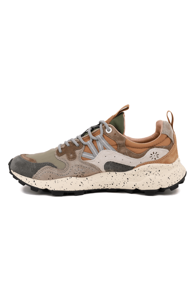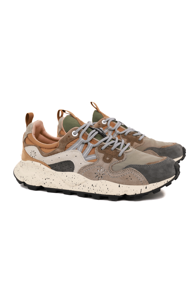 Sneaker multicolore e multi materiale dal design moderno, realizzate in morbido camoscio e tessuto tecnico, la leggerezza e originalità della suola in gomma e il sottopiede in sughero naturale antibatterico la rendono l’accessorio ideale per i tuoi outfit comodi e di tendenza