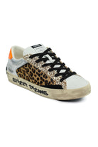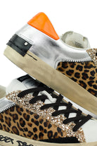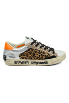 Sneaker bassa da donna firmata Crime London audace e grintosa. La tomaia combina il fascino animalier con inserti leopardati, una banda laterale scintillante in glitter oro e dettagli in pelle argento metallizzato, con il tallone in fluo arancio per una marcia in più. Suola dall’effetto vintage personalizzata con scritta "Street Dreams" e lacci neri a contrasto.