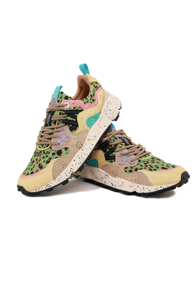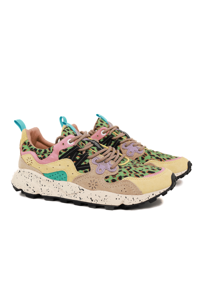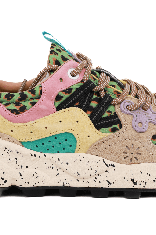 Sneaker multicolore e multi materiale dal design moderno, realizzate in morbido camoscio e tessuto tecnico stampa animalier, la leggerezza e originalità della suola in gomma e il sottopiede in sughero naturale antibatterico la rendono l’accessorio ideale per i tuoi outfit comodi e alla moda