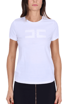 T-shirt da donna in cotone bianco con logo Elisabetta Franchi ricamato tono su tono sul davanti. Modello a manica corta, vestibilità regular e girocollo, ideale per look versatili da abbinare sia a capi casual che eleganti. Composizione tessuto 100% Cotone.