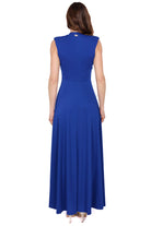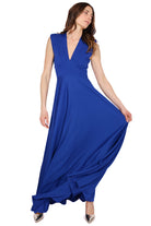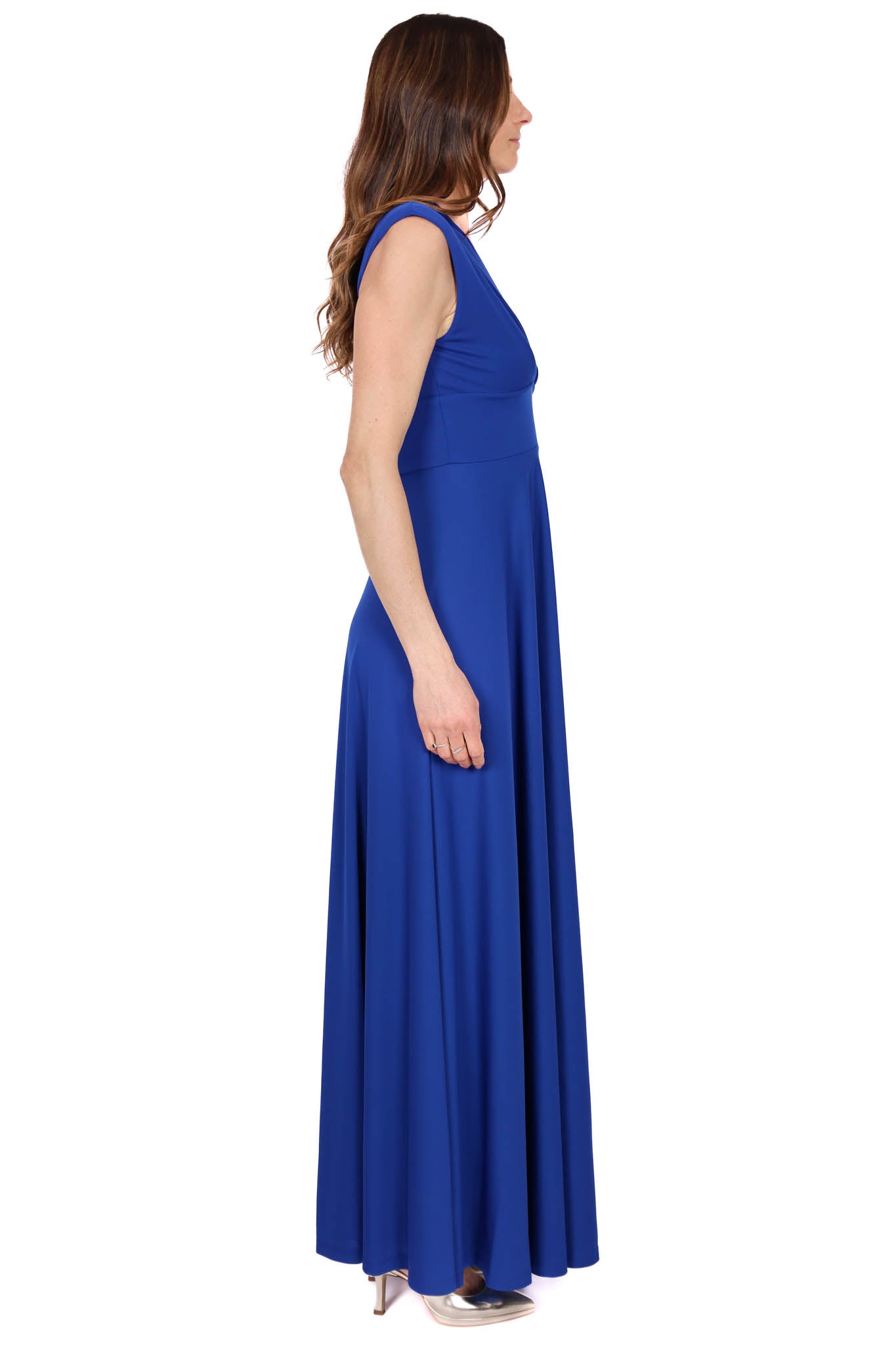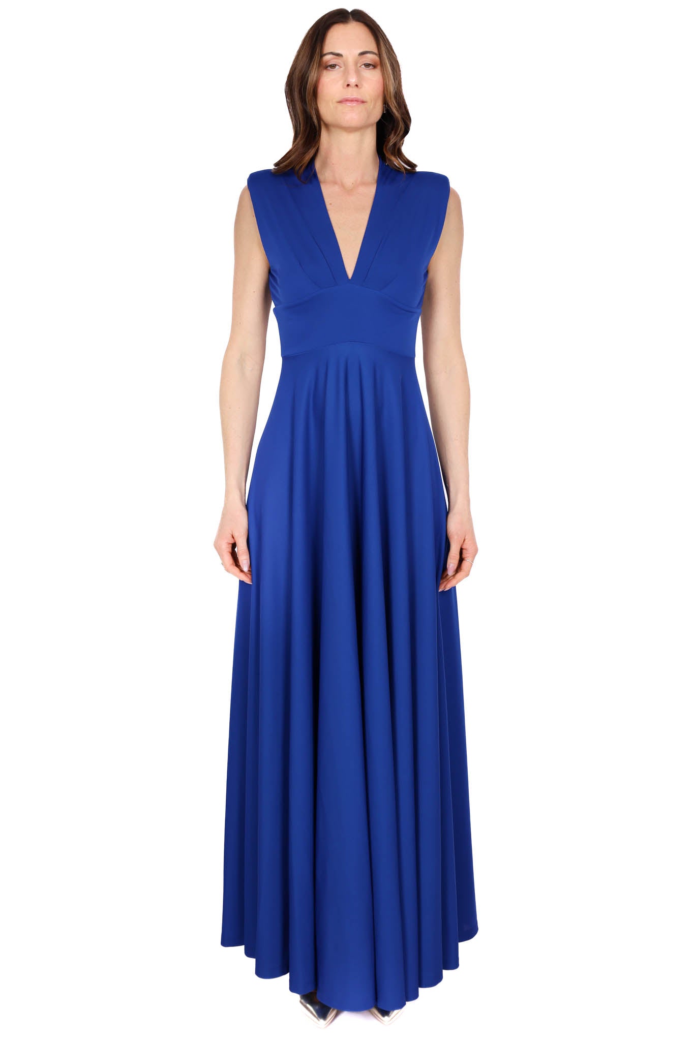 Abito lungo da donna in elegante blu, con scollo a V e linea fluida che valorizza la silhouette. Perfetto per cerimonie, eventi e occasioni eleganti.