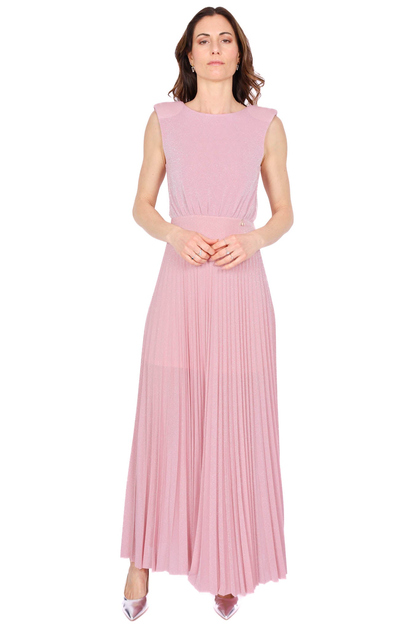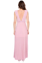 Abito lungo da donna in elegante rosa cipria con gonna plissé che dona movimento e leggerezza. Il design raffinato lo rende perfetto per cerimonie ed eventi eleganti.