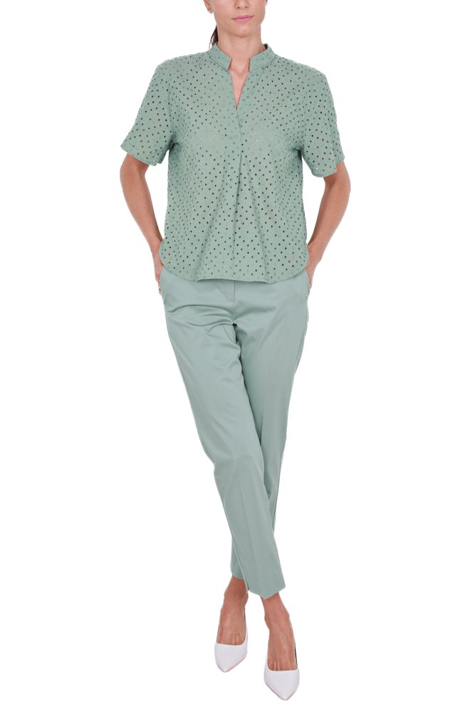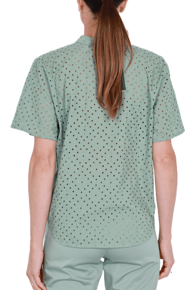 Camicia maniche corte con collo a fascetta in fresco pizzo sangallo di puro cotone