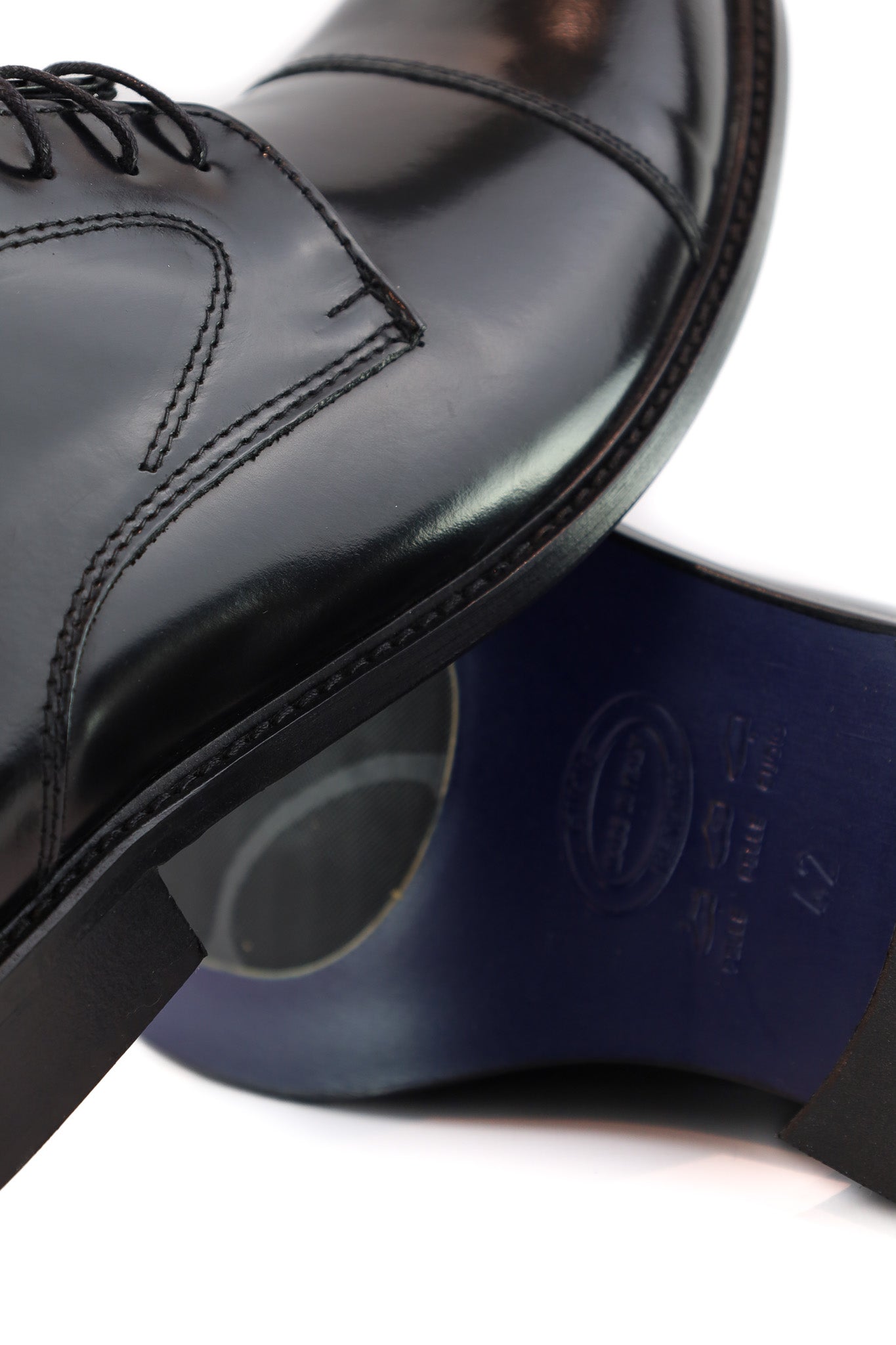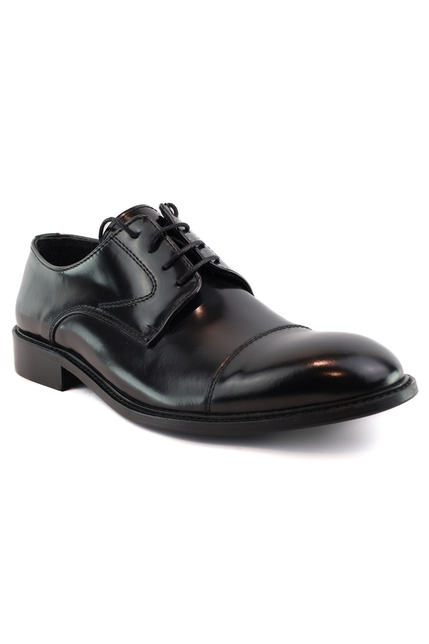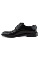 Scarpa derby da uomo in pelle nera lucida con puntale segnato, caratterizzata da linee essenziali e allacciatura a quattro fori per un’eleganza sobria e raffinata. La suola in gomma e la forma classica la rendono perfetta per cerimonie, look formali e outfit da ufficio da abbinare a completi o pantaloni sartoriali.