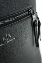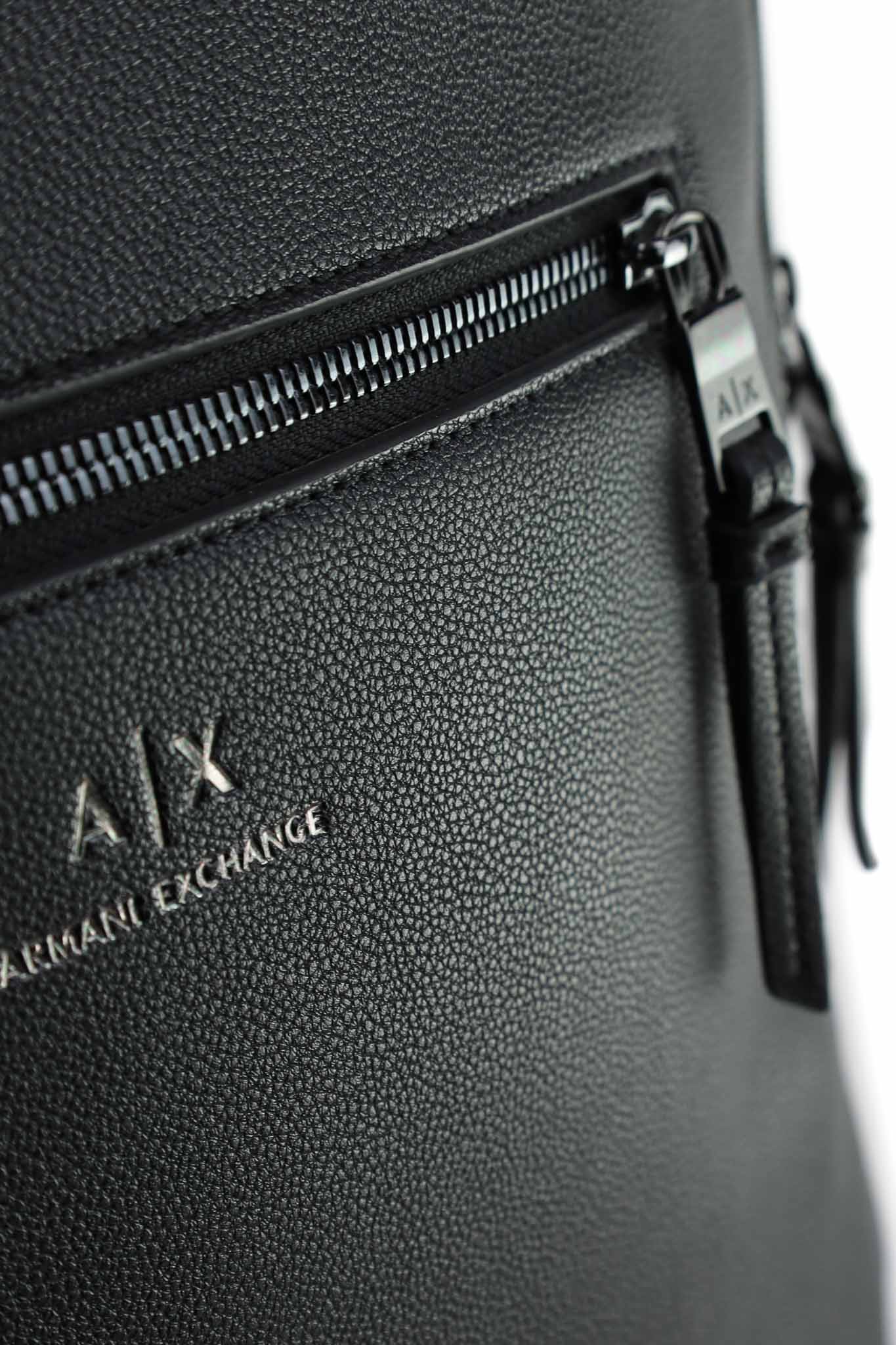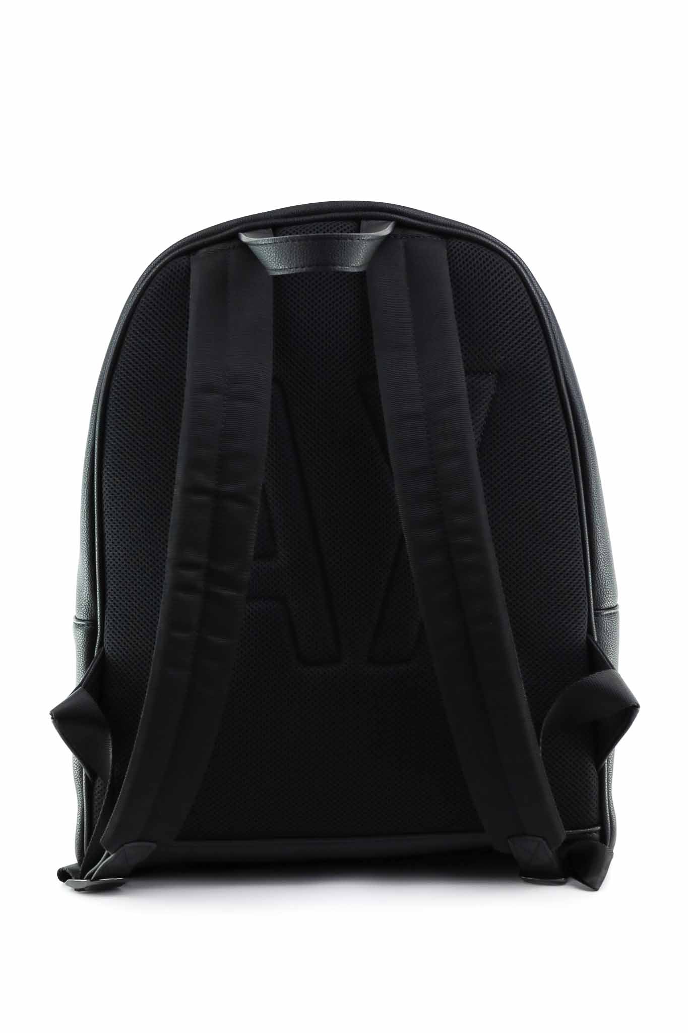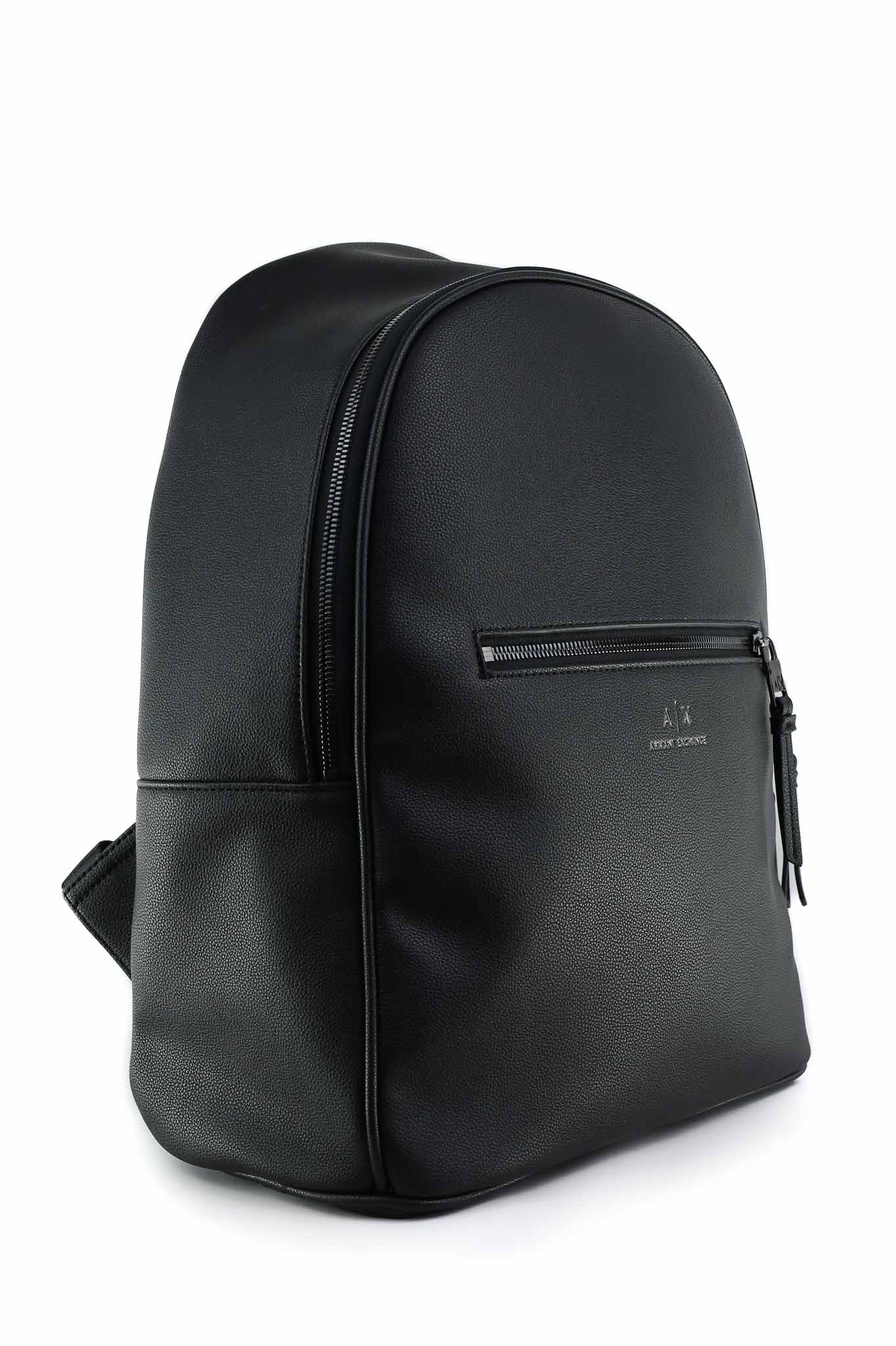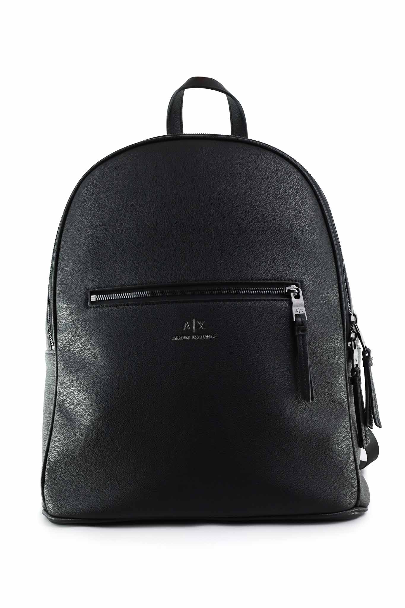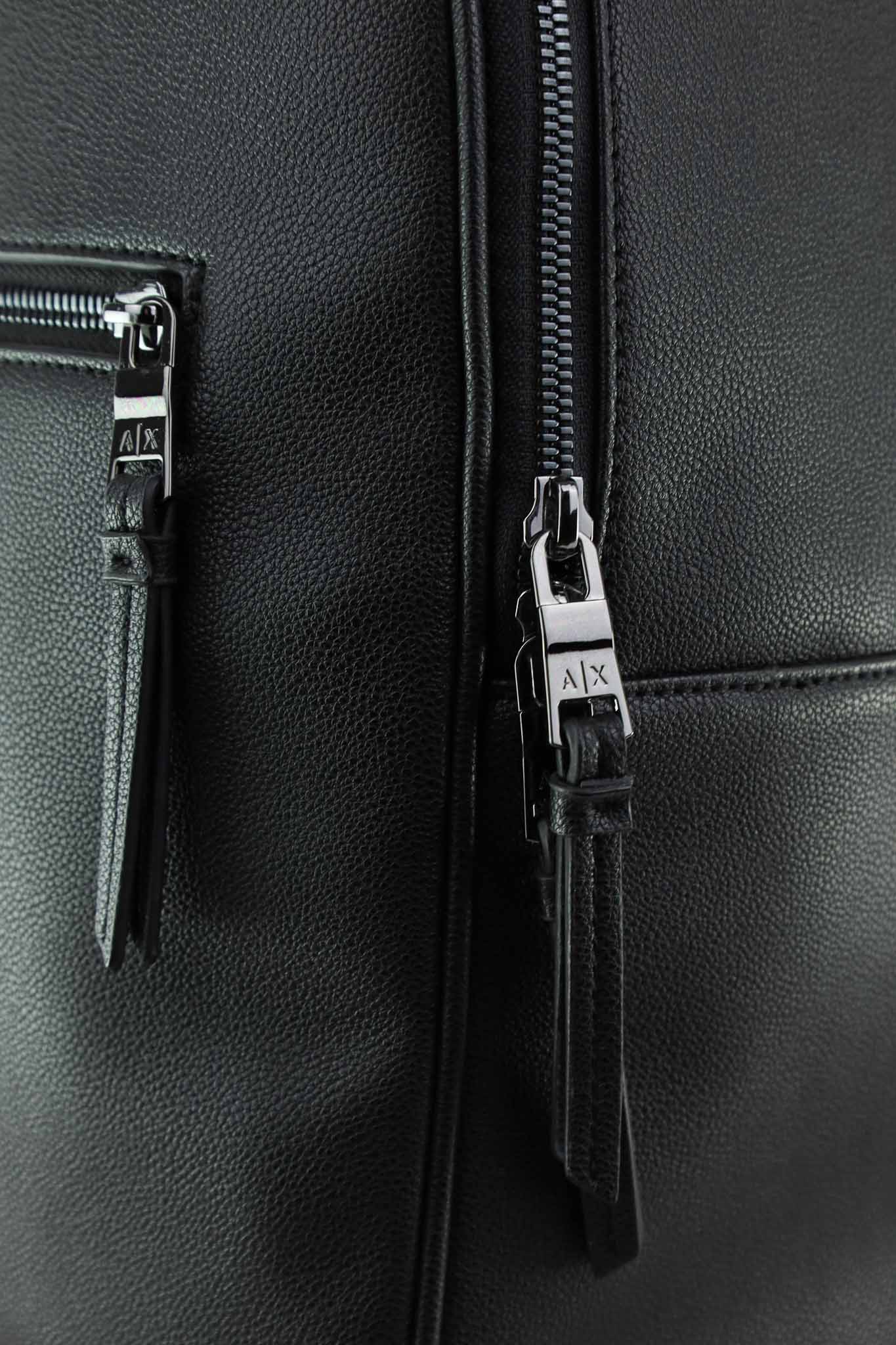 Zaino Armani Exchange in similpelle nero lucido con logo AX embossed sul retro e tasche multiple con zip. Le cinghie imbottite regolabili e i dettagli in similpelle nera lo rendono comodo e funzionale per uso quotidiano urbano.