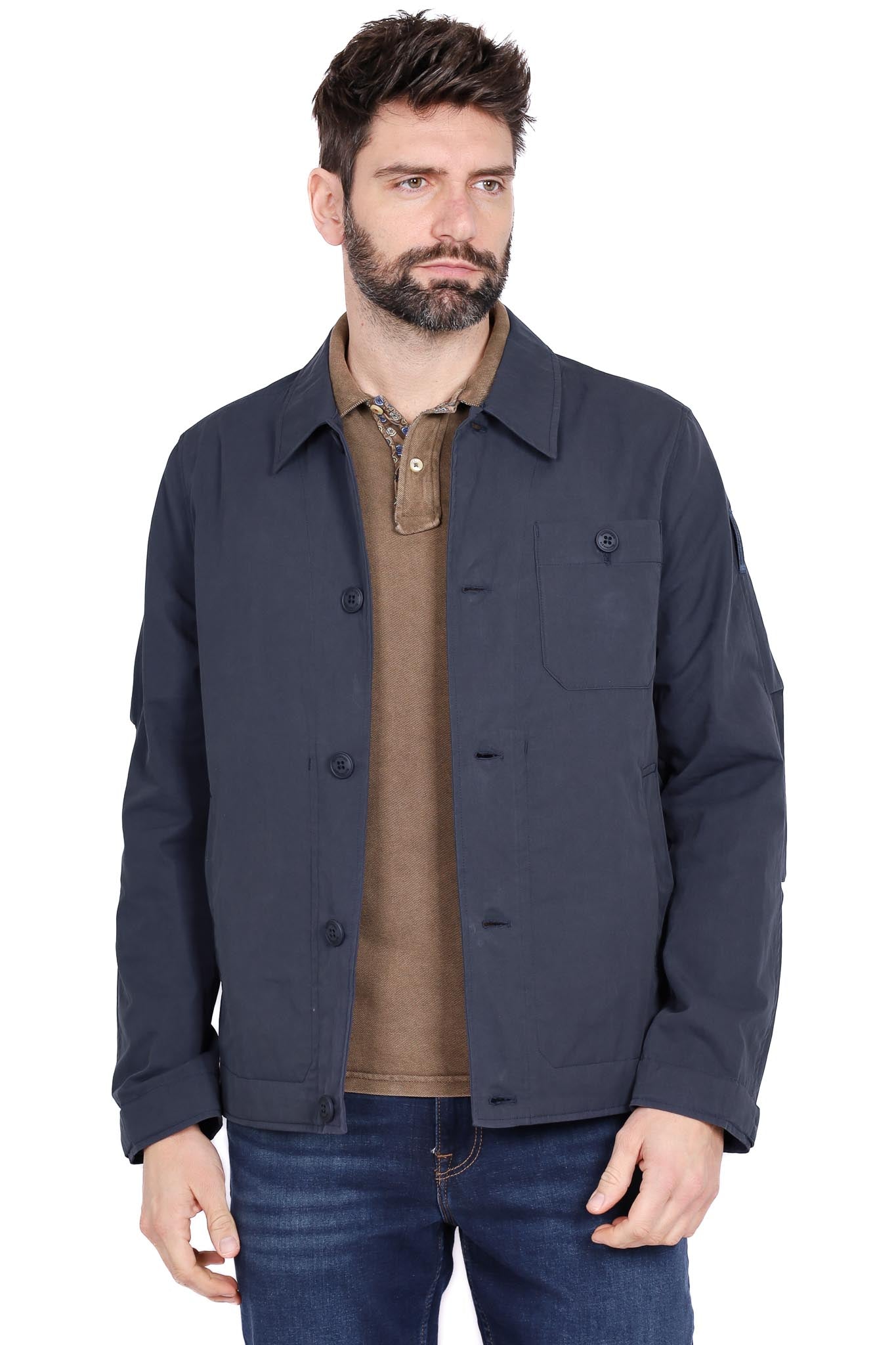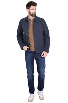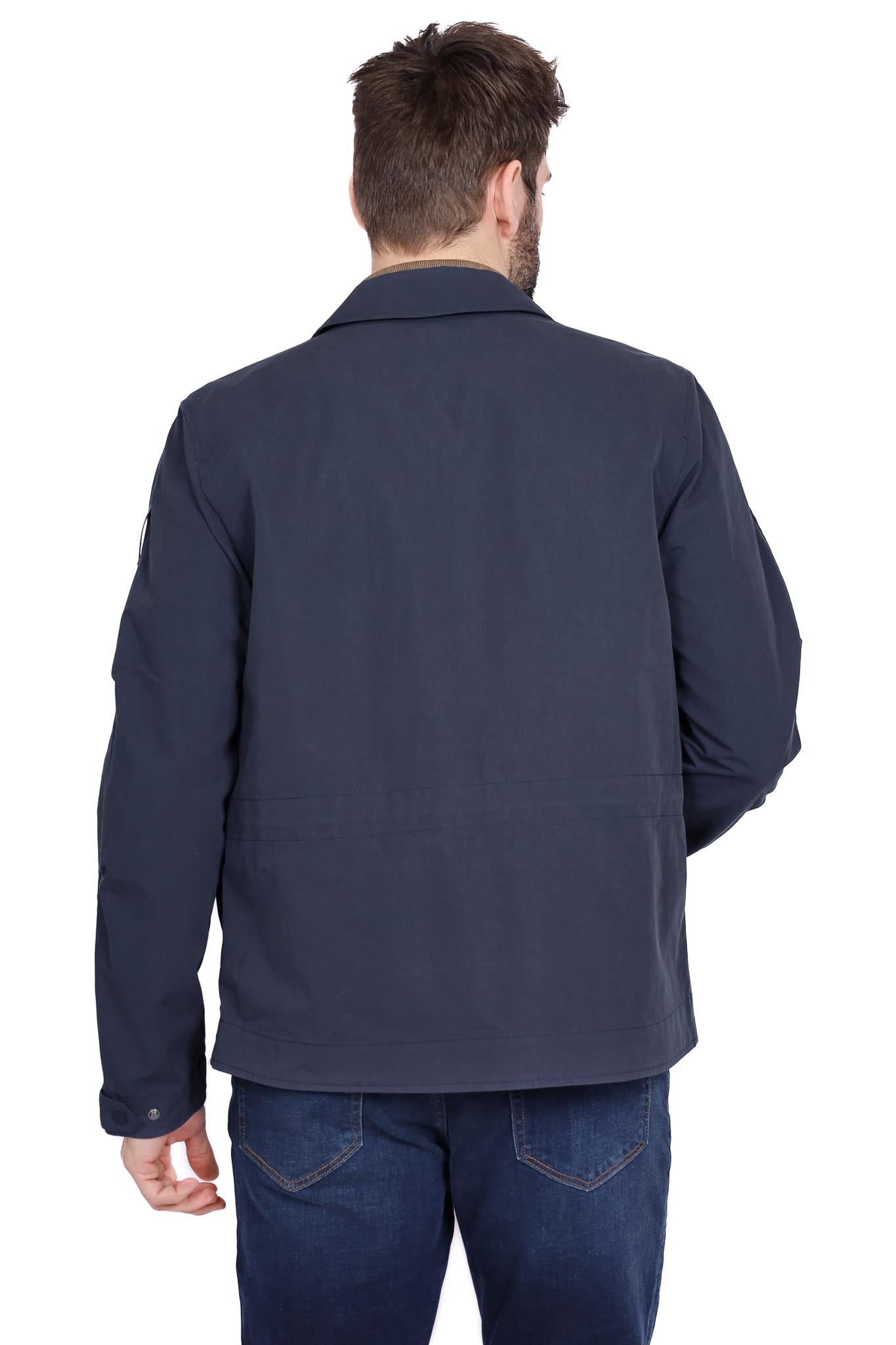 Giacca utility navy con tasche e collo a camicia. Tessuto misto resistente con vestibilità regular, versatile per casual urbano.