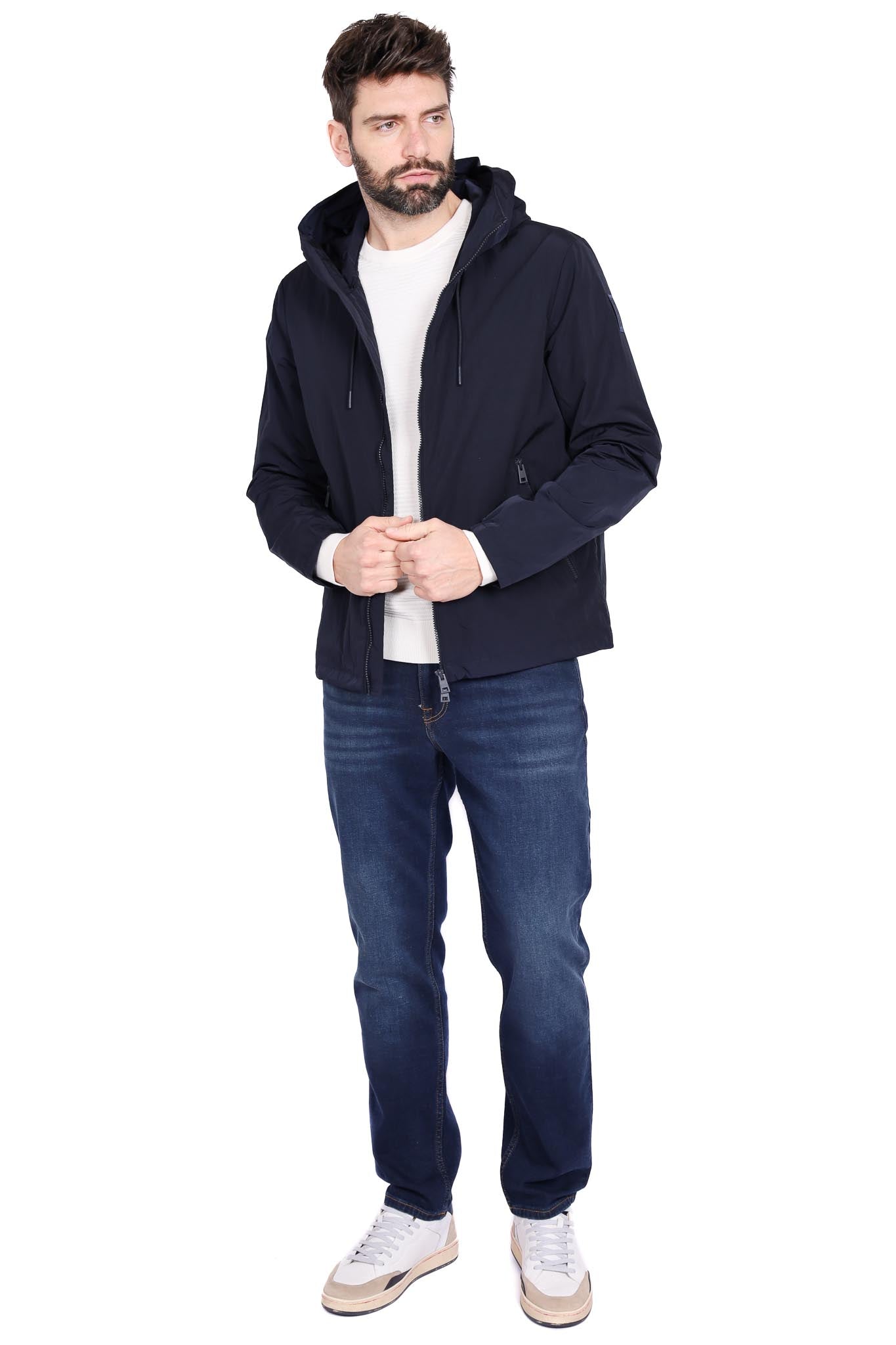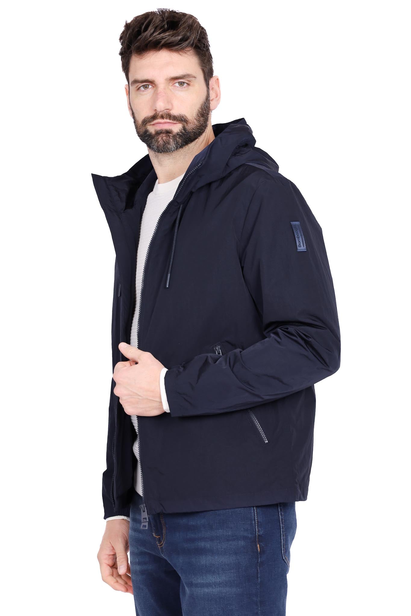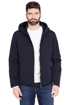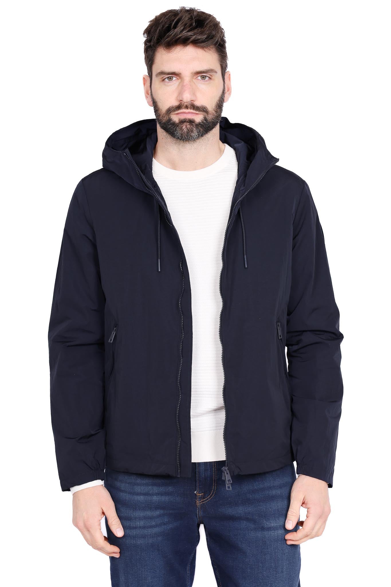 Giacca con cappuccio blu scuro tecnica con zip integrale e tasche laterali. Tessuto misto impermeabile per transizione stagionale, vestibilità regular.