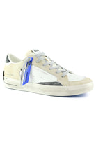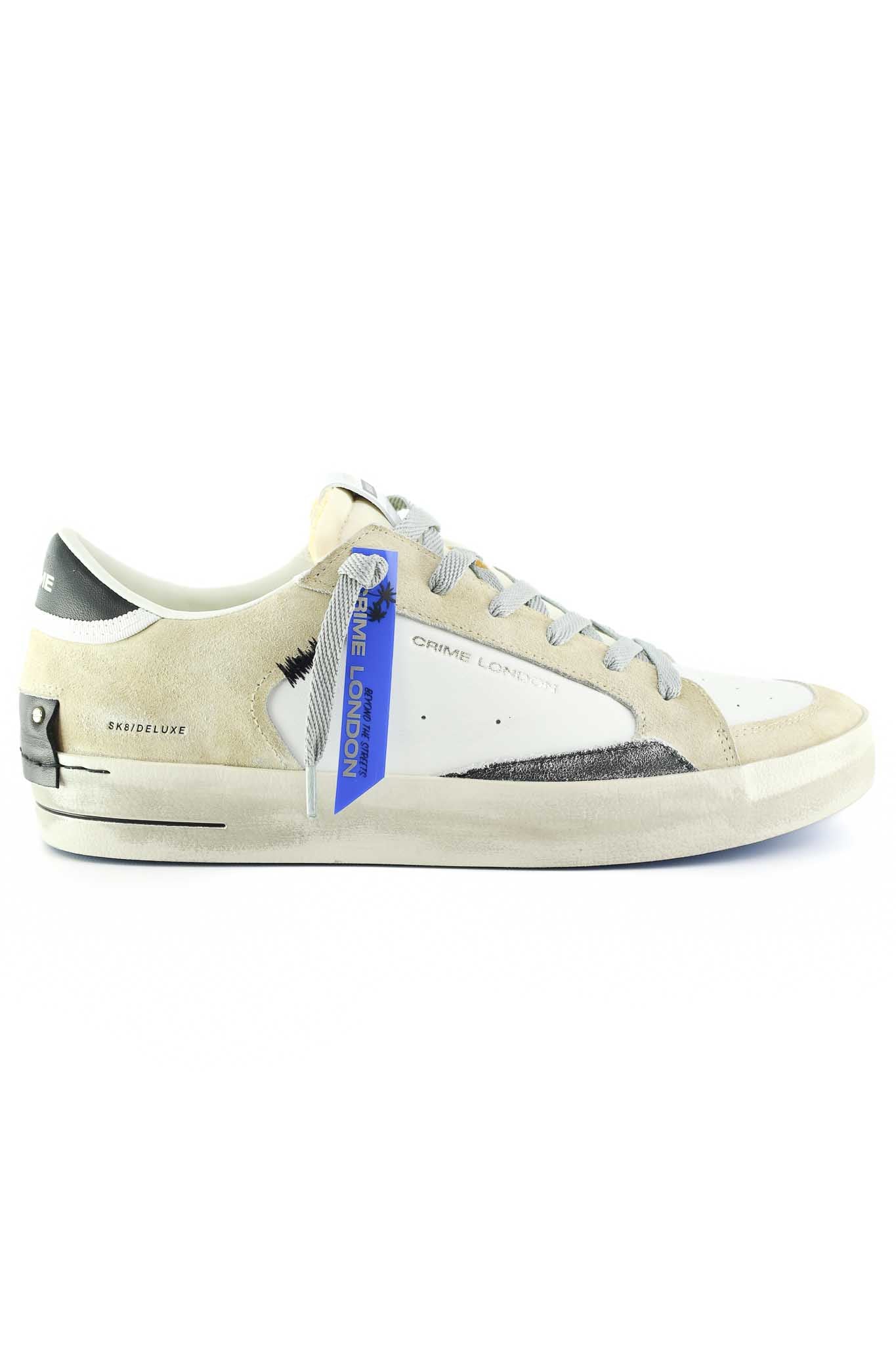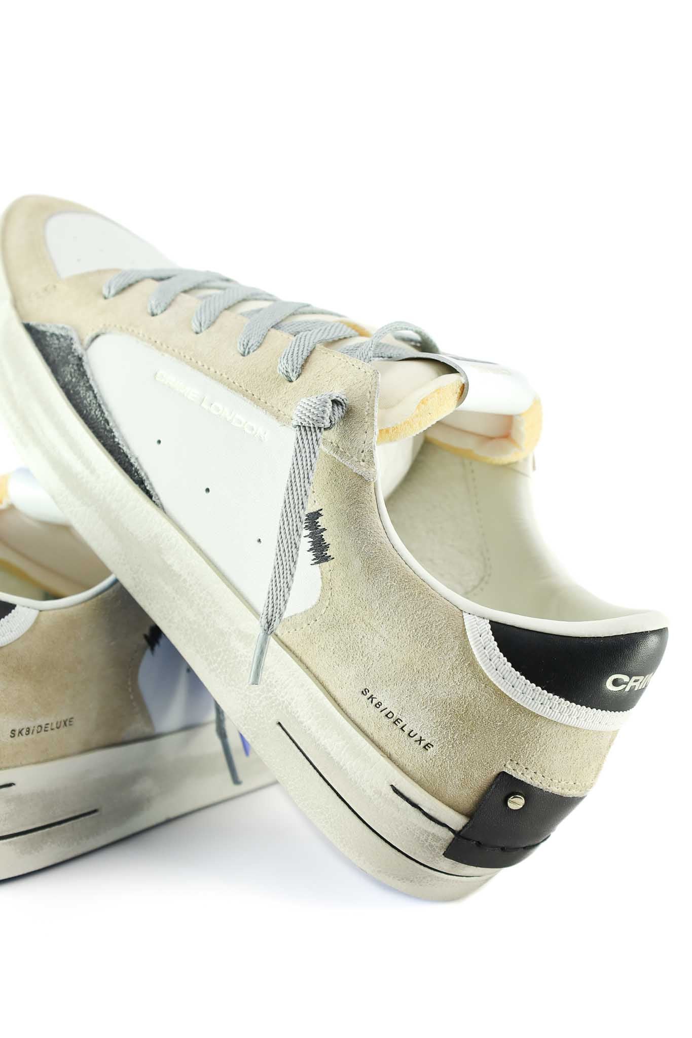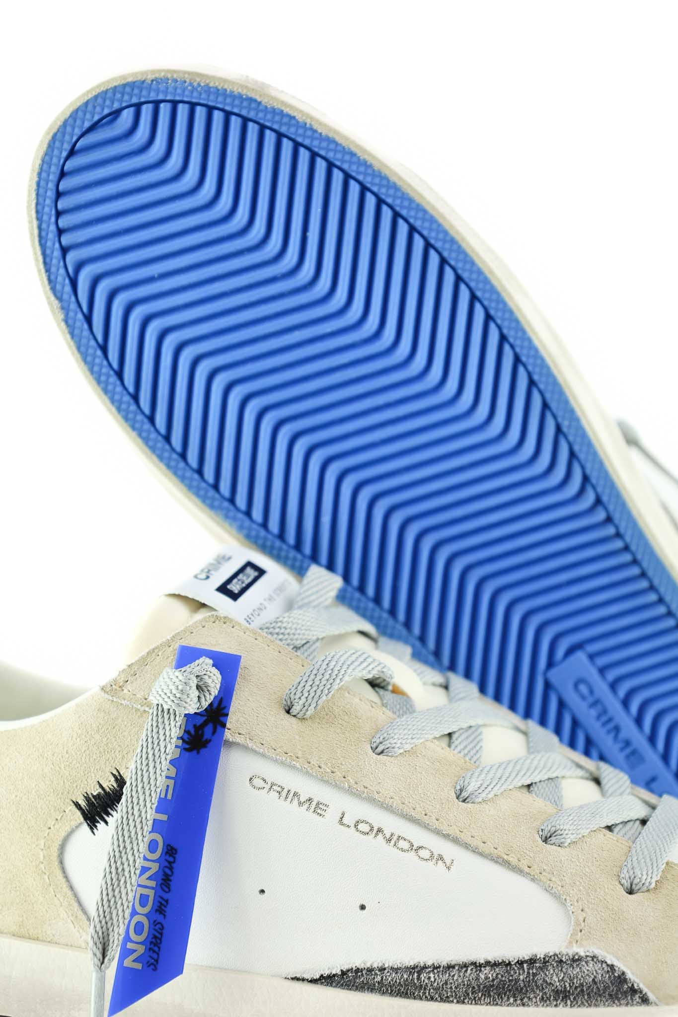 Sneakers Crime London in suede beige con suola blu, lacci bianchi. Perfette per casual luxury, viaggi o streetwear everyday.