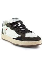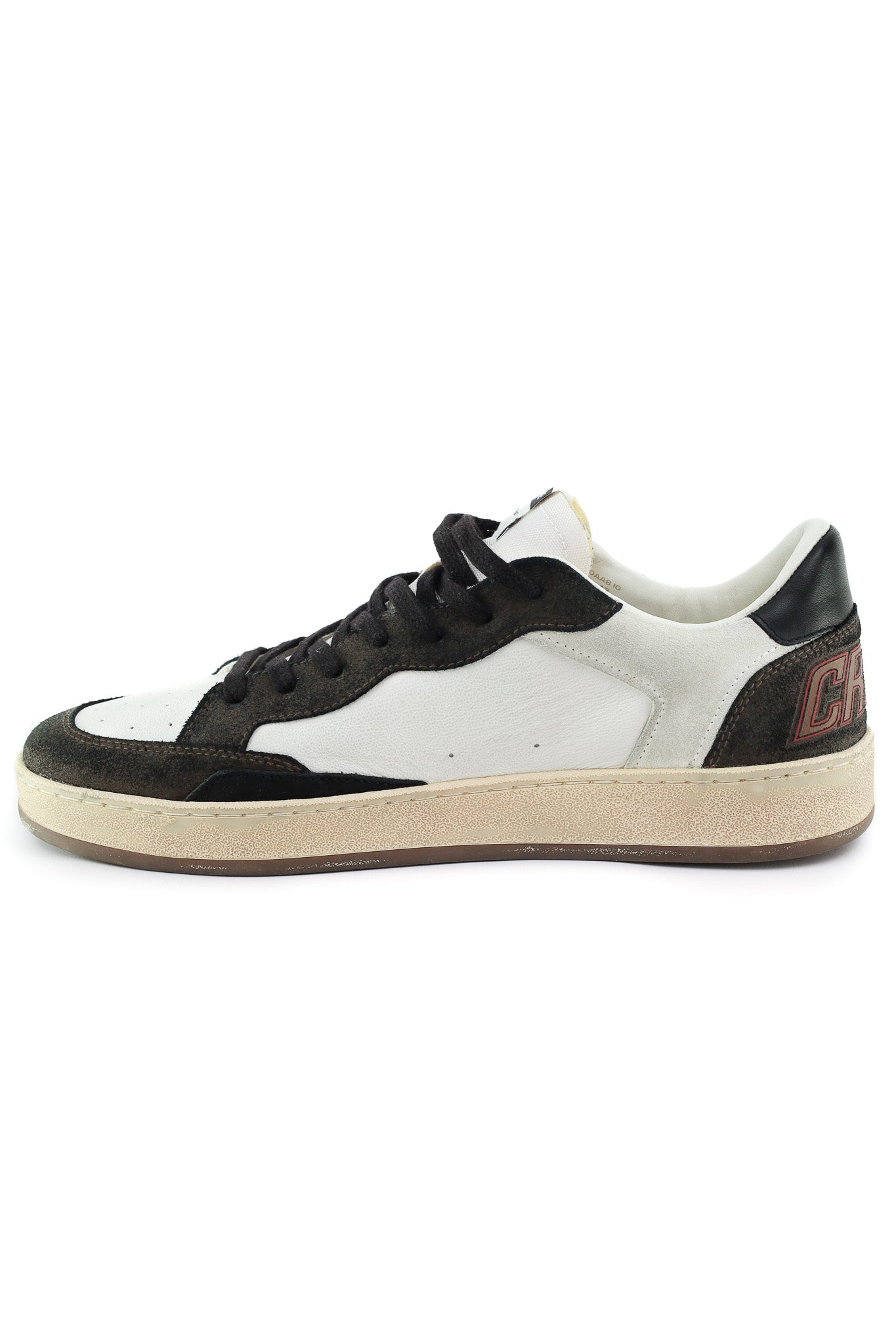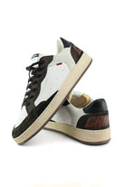 Sneakers bassa Crime London in pelle e suede nei toni del bianco e marrone, con tallone in pelle nera a contrasto e maxi scritta CRIME sul retro per un effetto deciso e urbano. La suola color avorio dall’effetto vissuto e i dettagli cuciti a contrasto completano il design, ideale per dare carattere a jeans, pantaloni cargo e look casual di tutti i giorni.