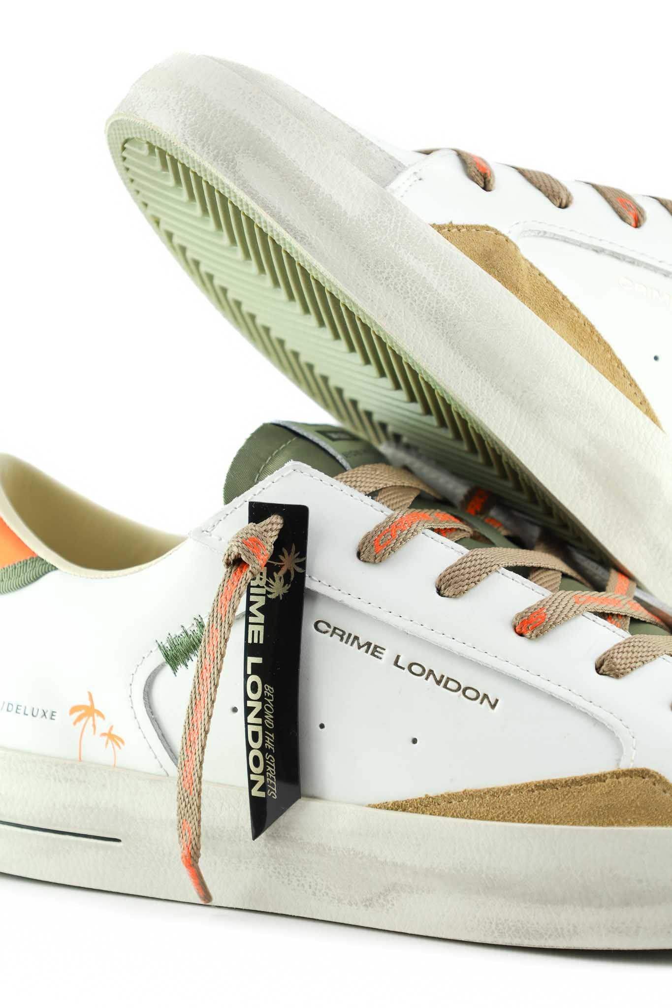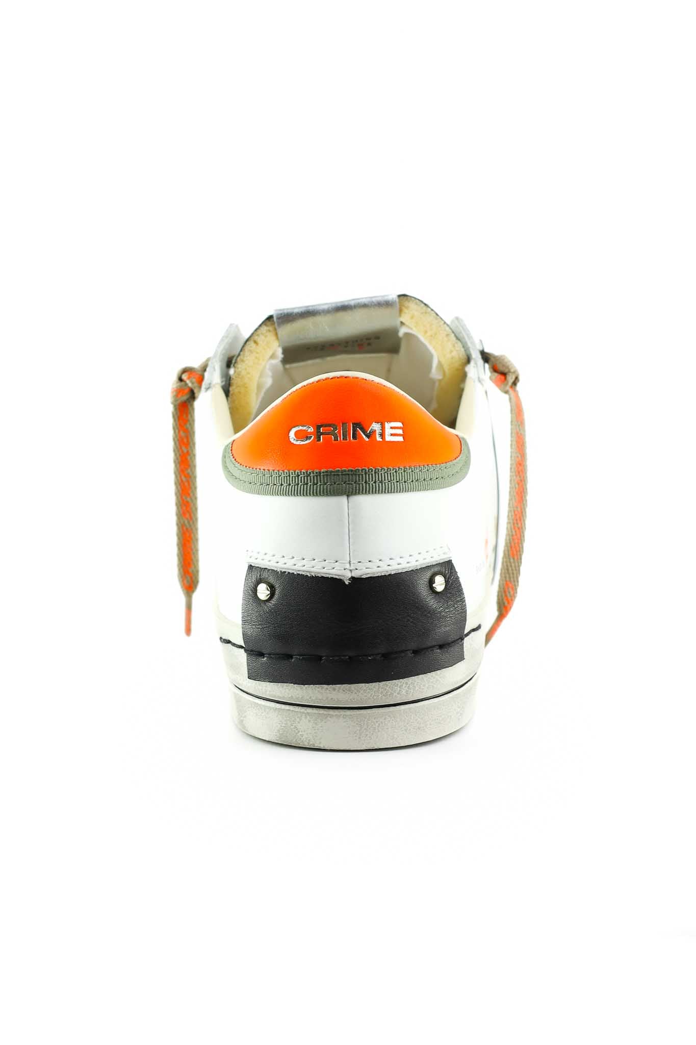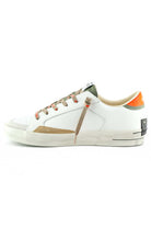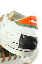 Sneakers Crime London in pelle bianca con accenti arancioni su linguetta, tallone e lacci. Suola chunky beige e dettagli suede taupe per comfort e texture unica.