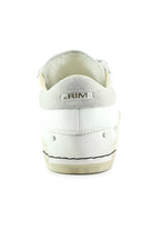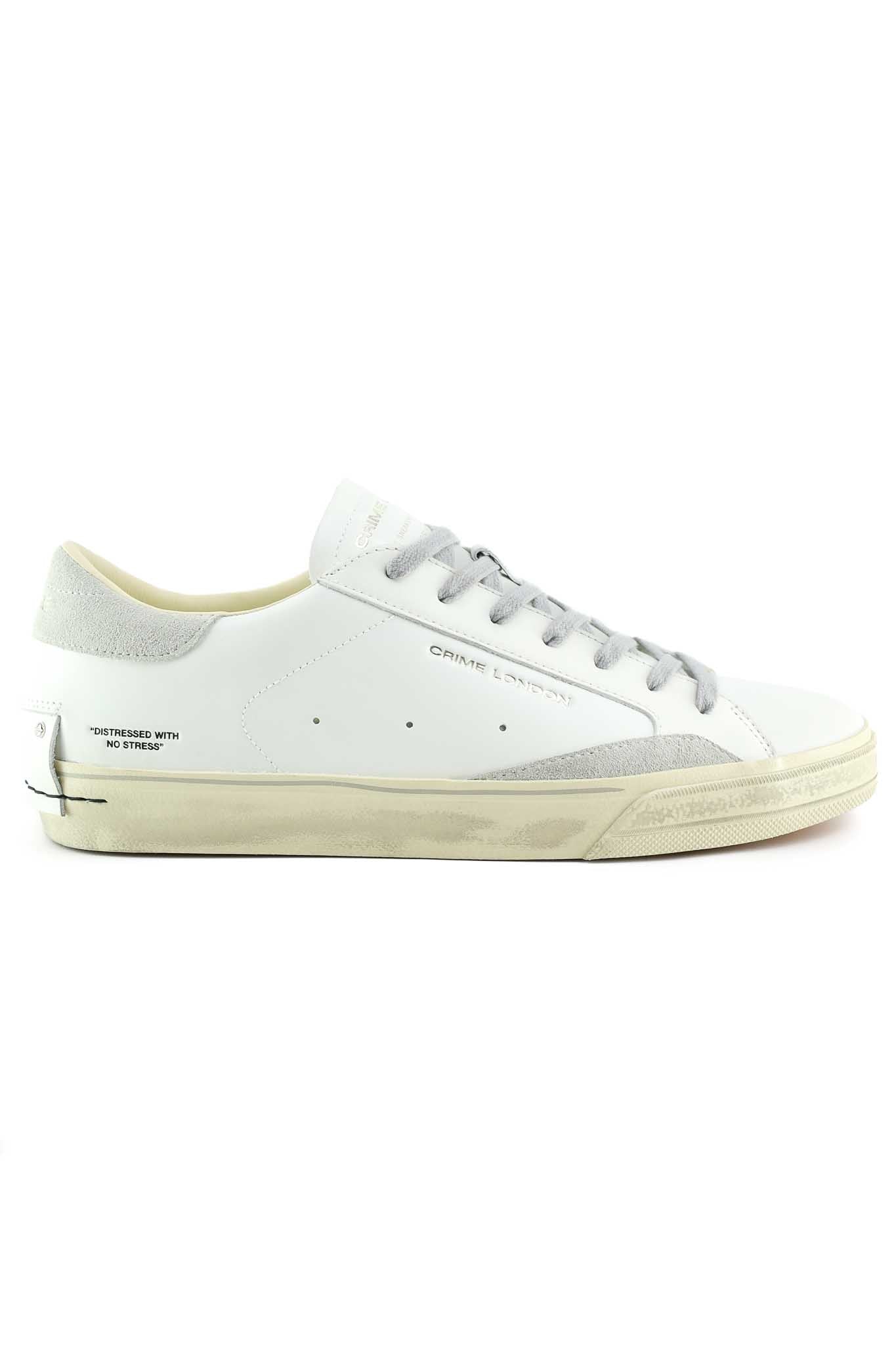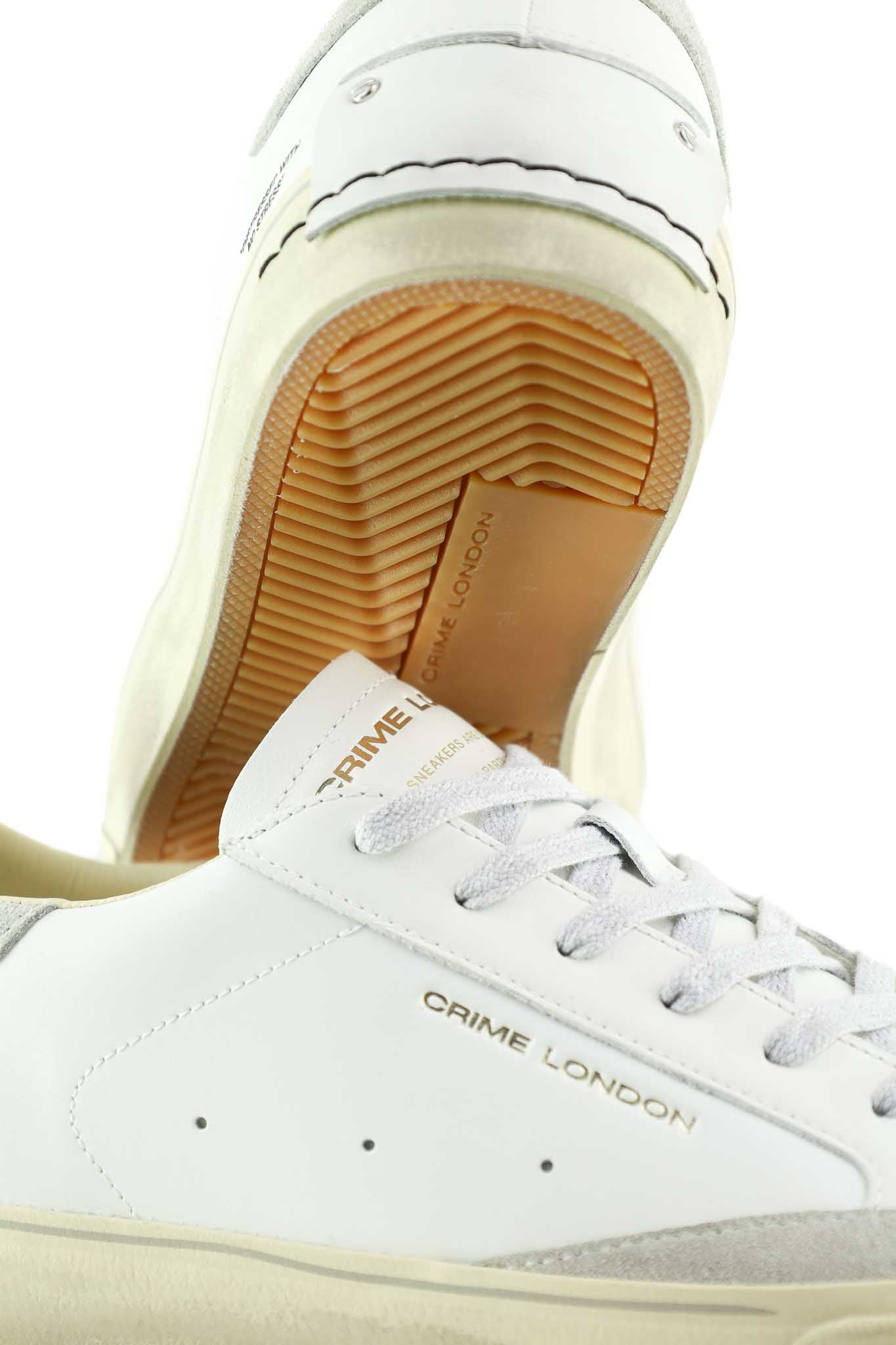 Sneakers Crime London bianche in pelle con inserti grigi suede sulla linguetta e laterali. Suola chunky beige per cushioning superiore e lacci bianchi per facile calzata.