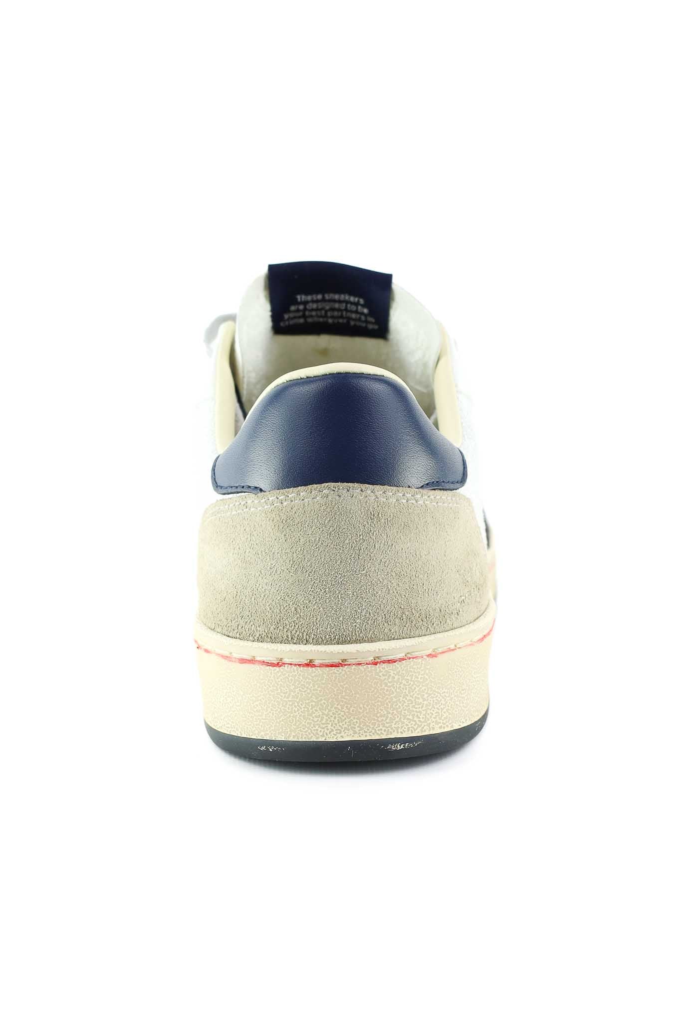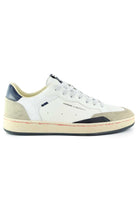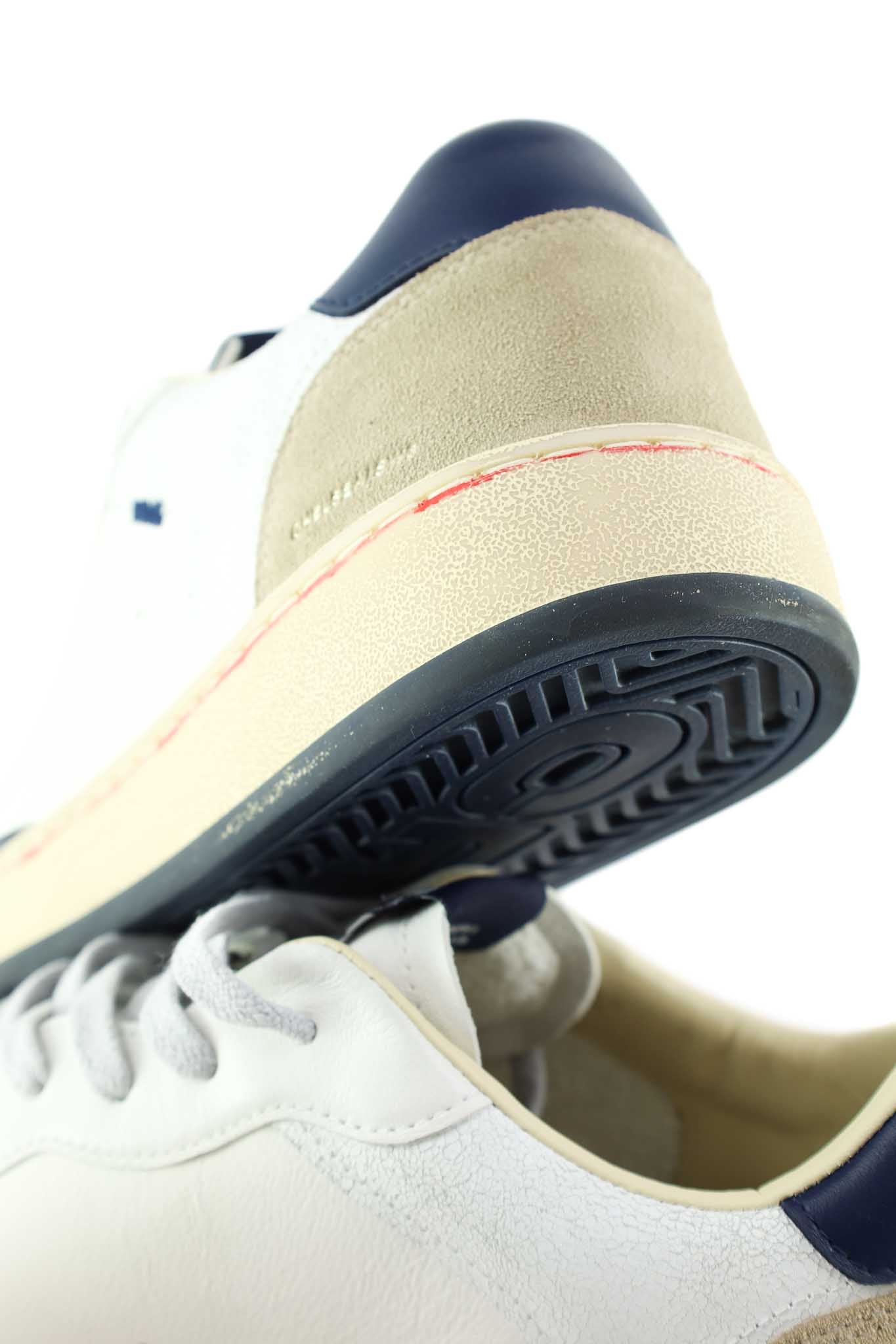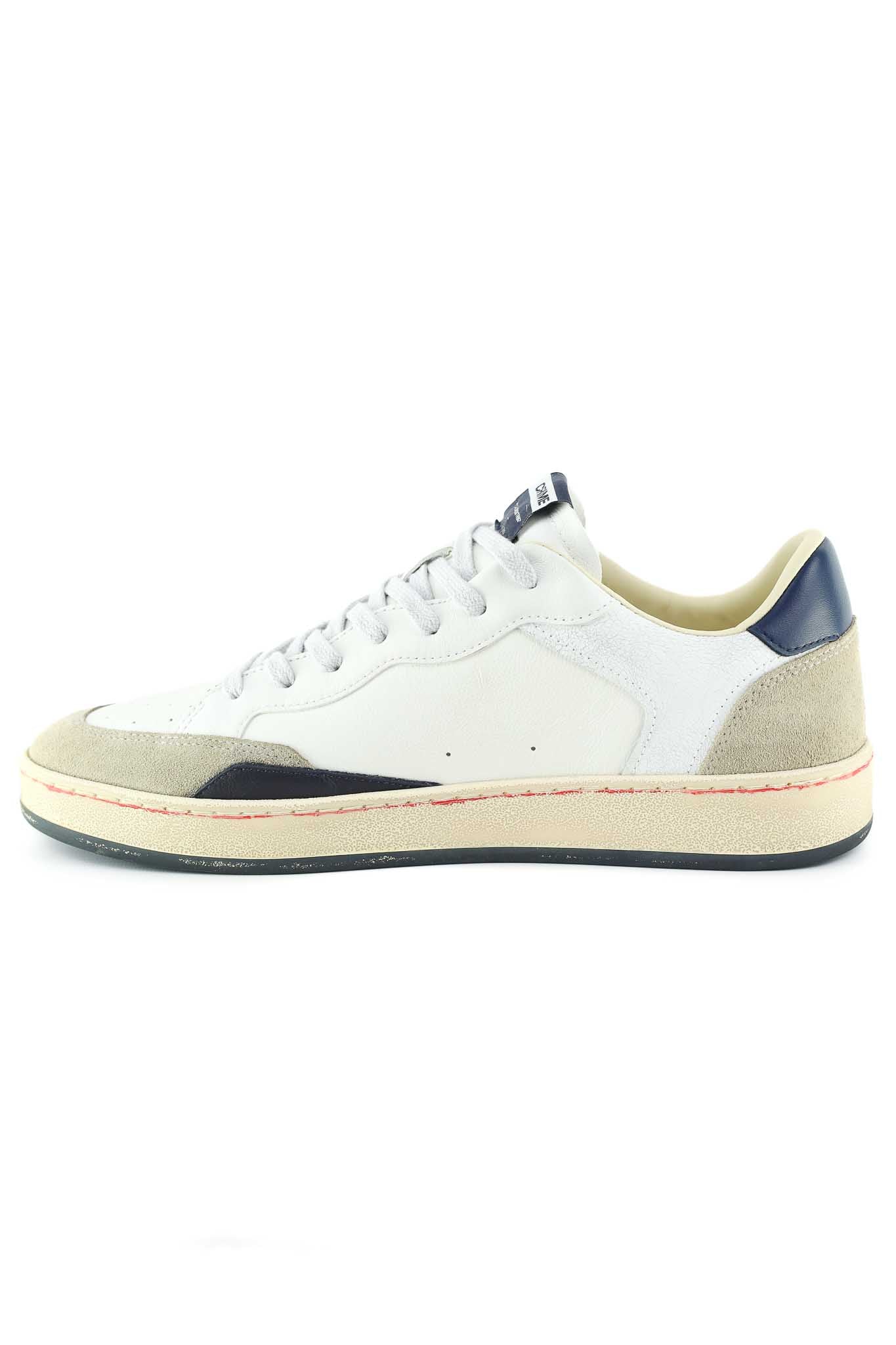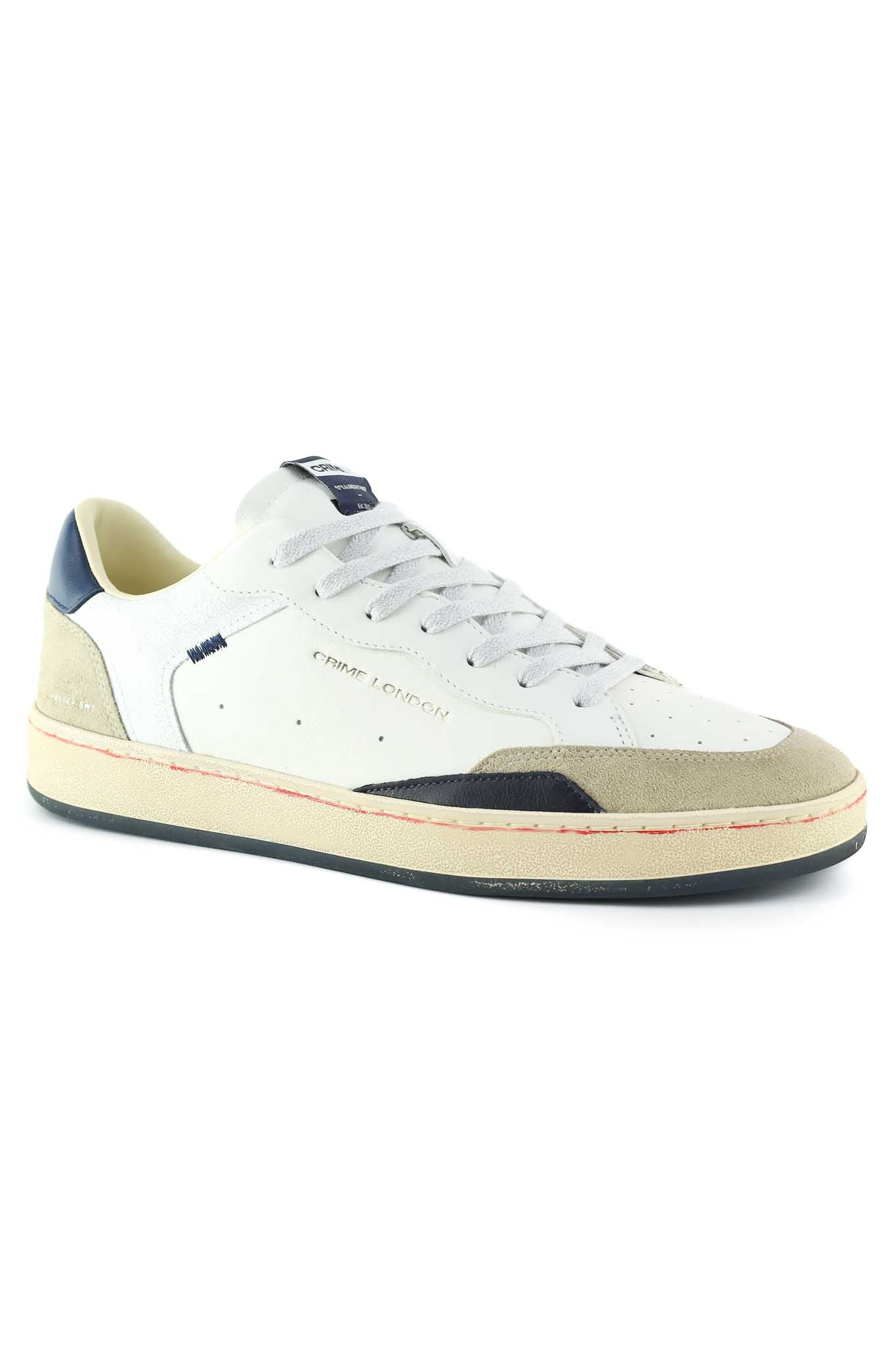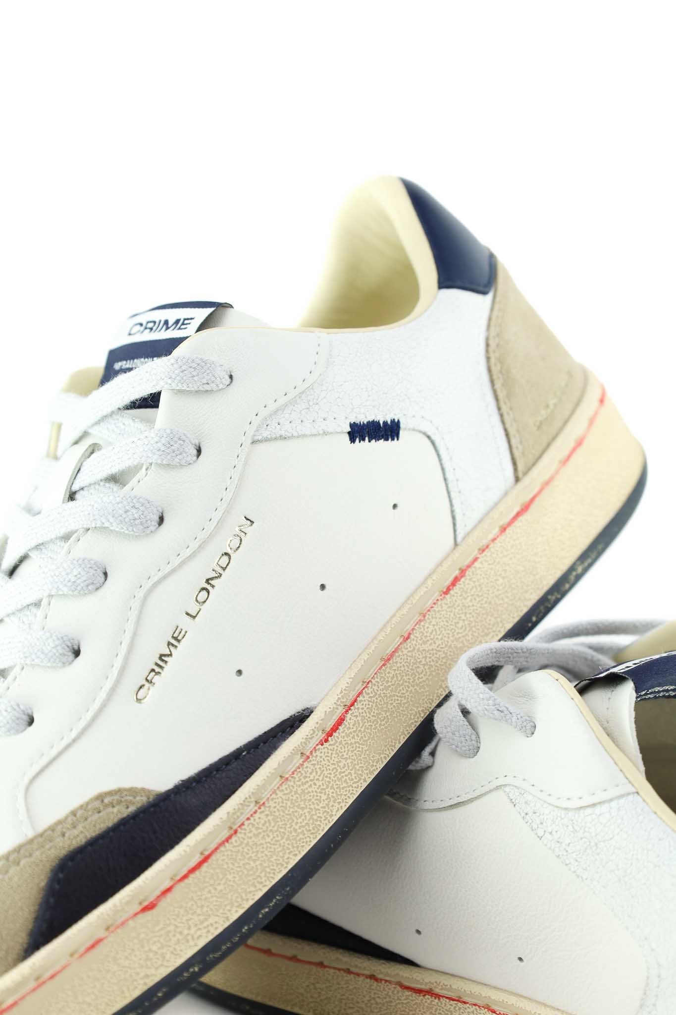 Sneakers Crime London bianche in pelle con inserti suede grigio chiaro e navy sulla linguetta e profilo. Suola beige ammortizzata per comfort quotidiano, lacci bianchi.