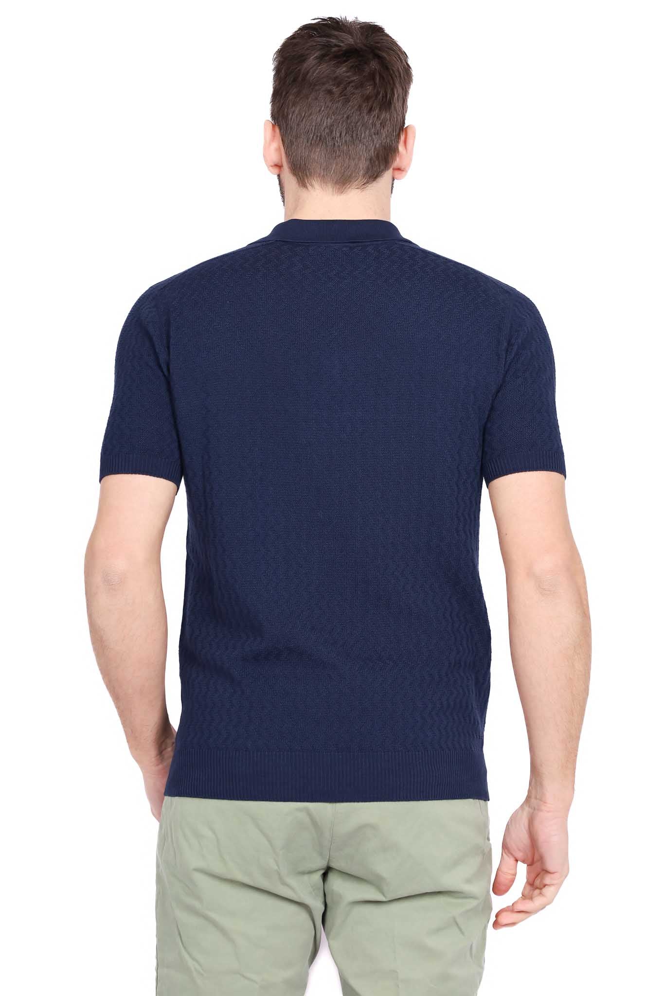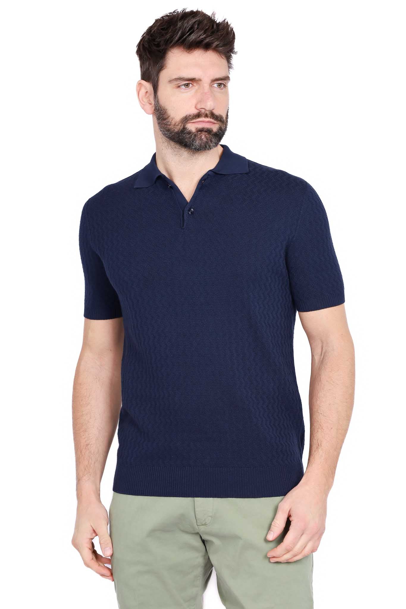 Polo maniche corte navy in maglina cotone stretch con texture rigata. Collo a polo con zip, vestibilità slim per stile smart casual.