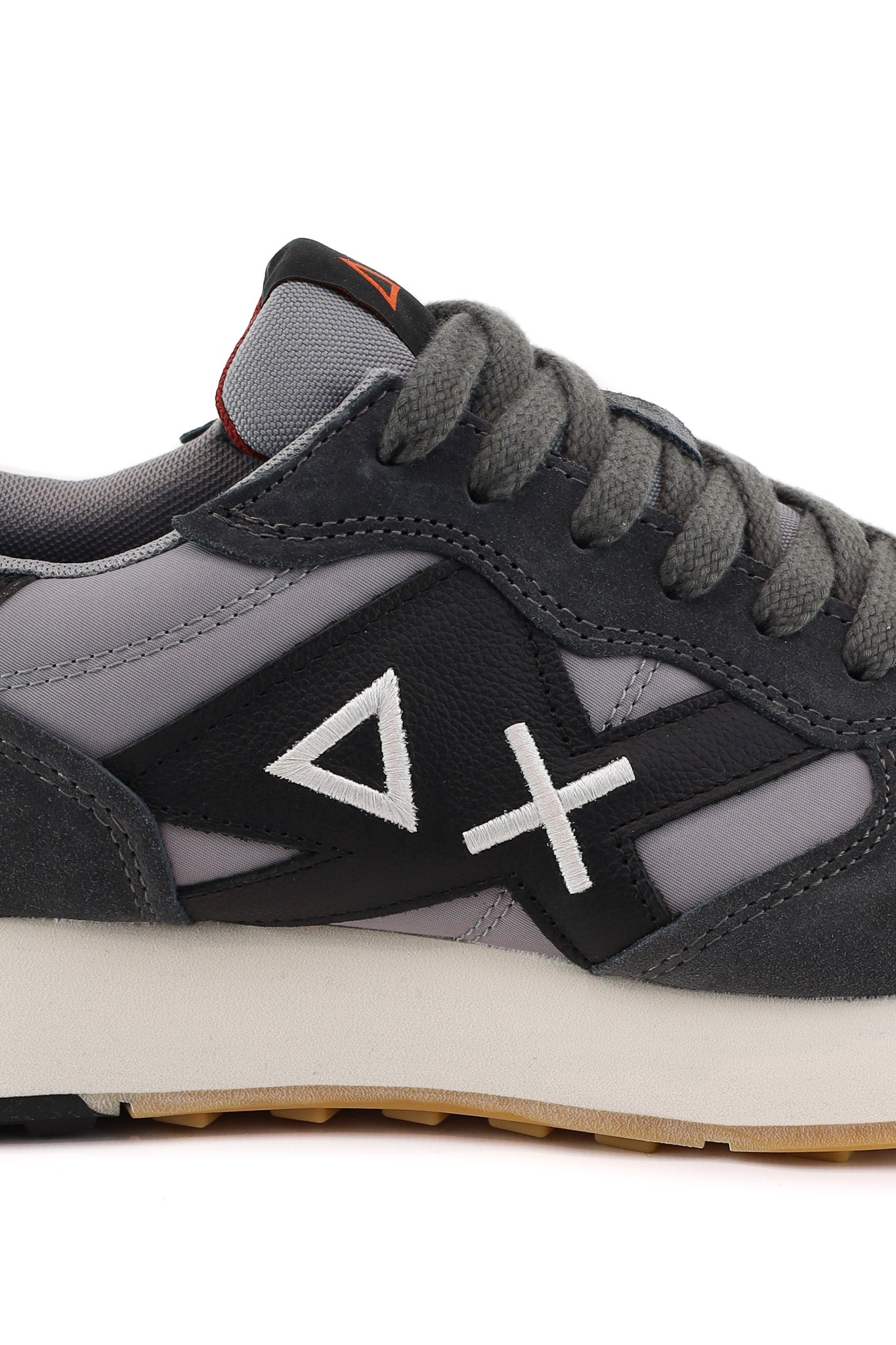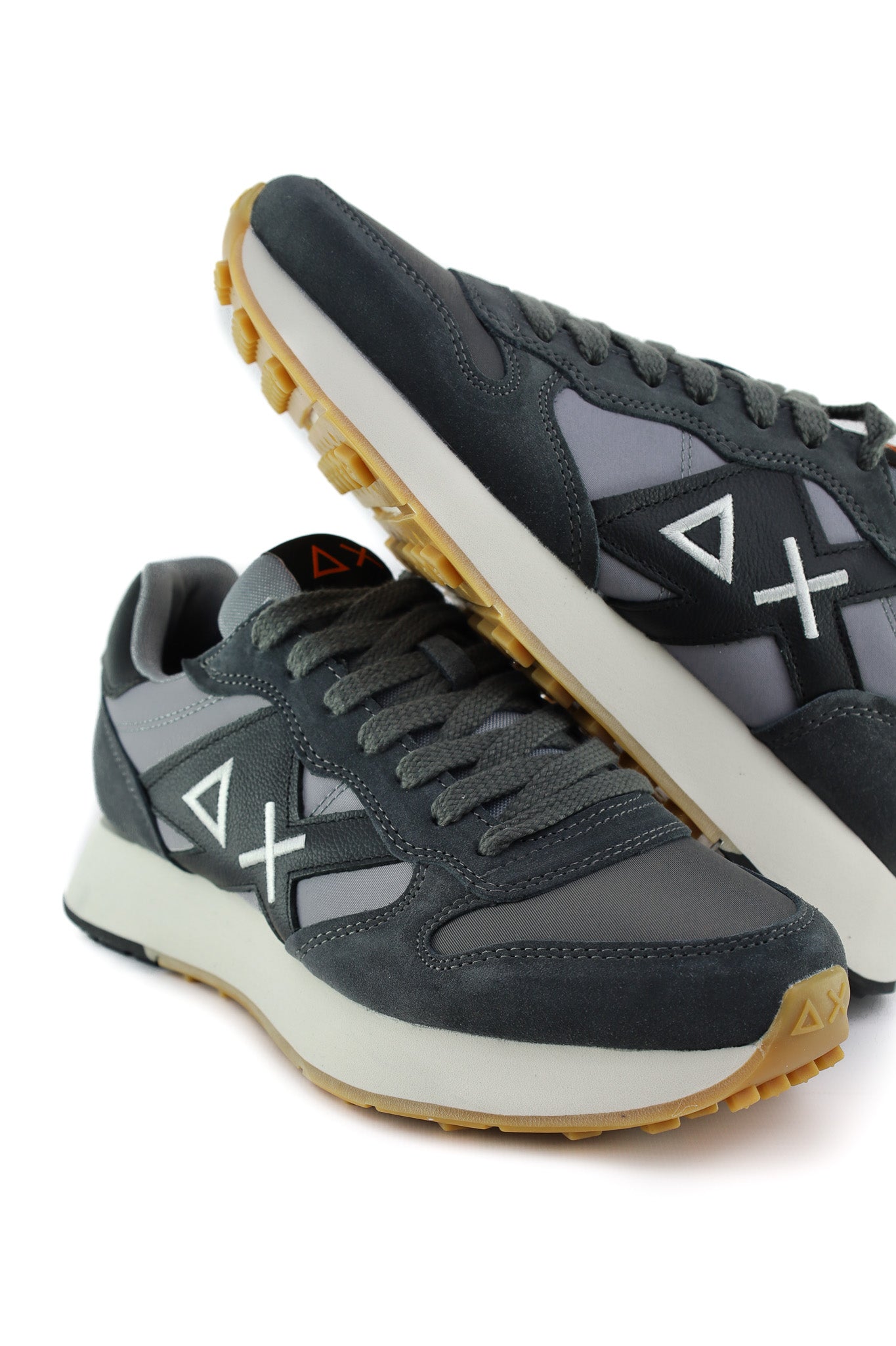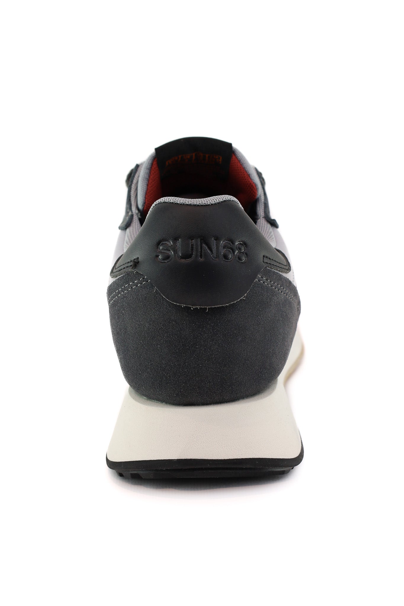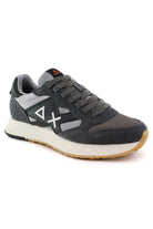 Sneakers Sun68 dal design running in suede e tessuto tecnico grigio, con logo laterale a contrasto nero e bianco e tallone rinforzato in pelle. L’intersuola chiara e il battistrada in gomma garantiscono comfort quotidiano, perfetto per look casual sportivi con jeans, chinos o pantaloni jogger.