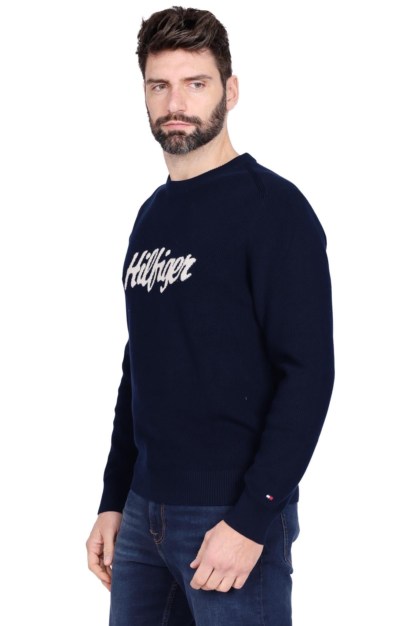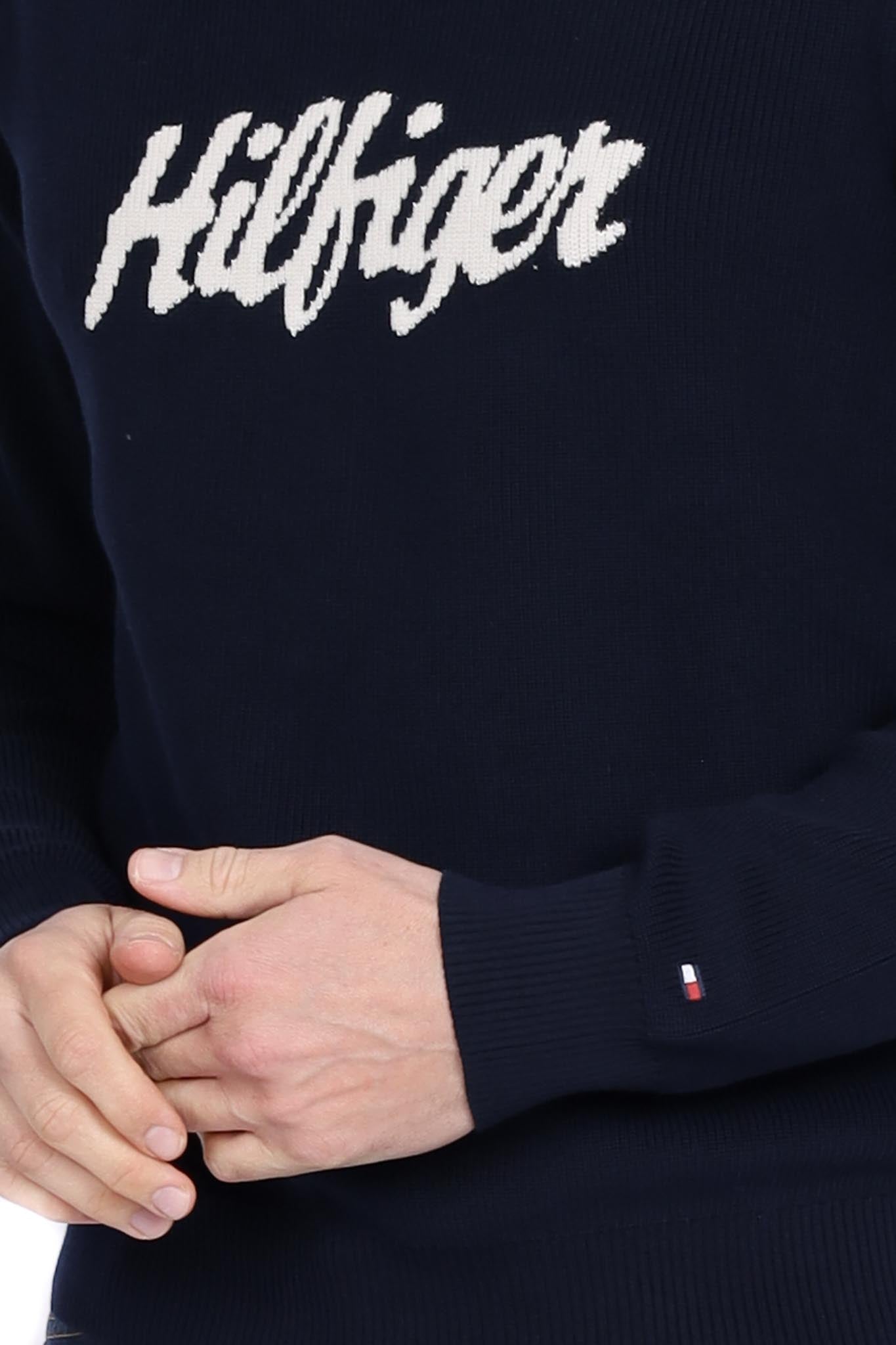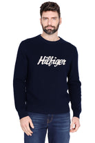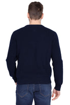 Felpa girocollo navy logata. Lana mista strutturata per calore elegante, vestibilità comoda.