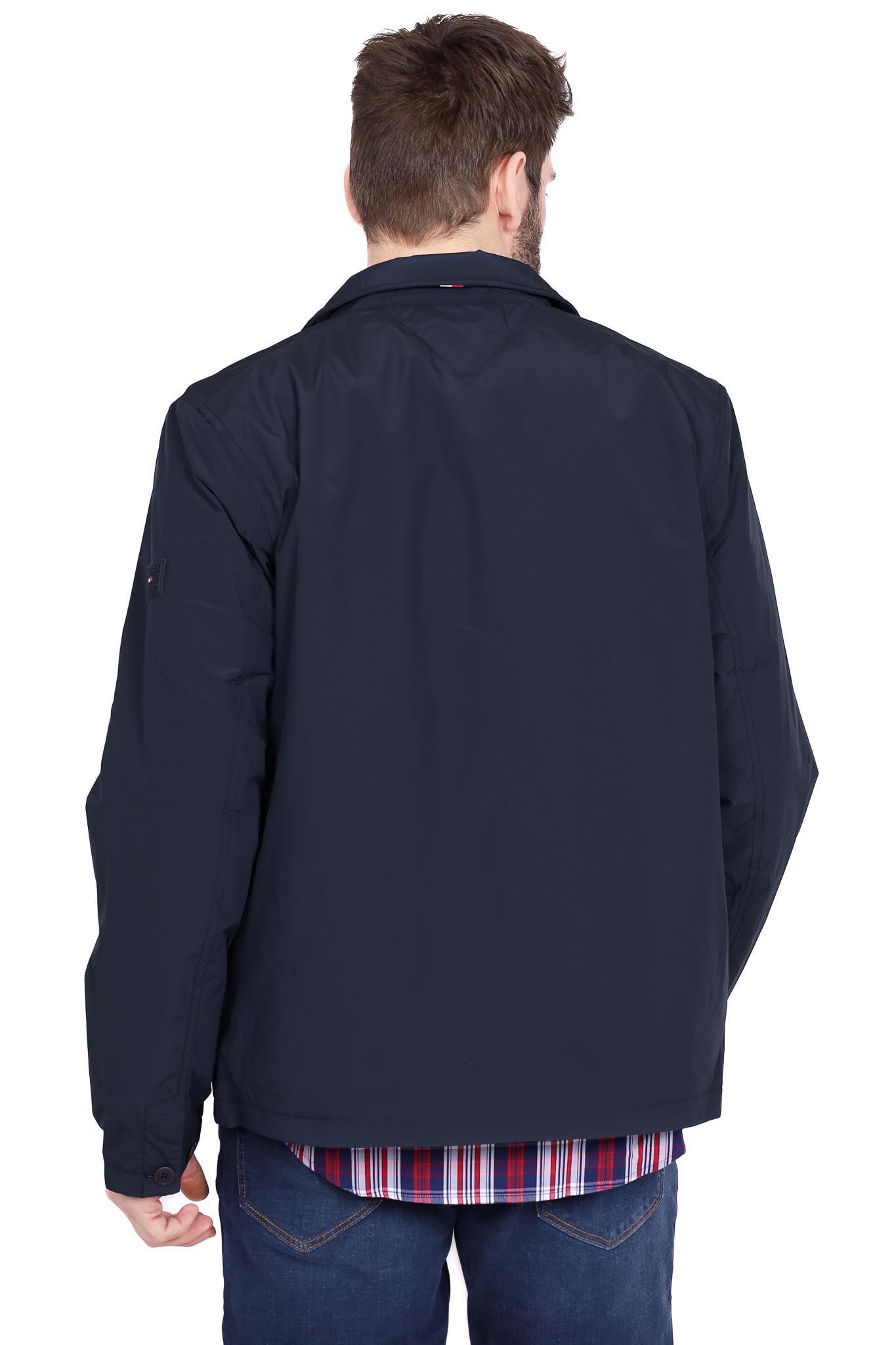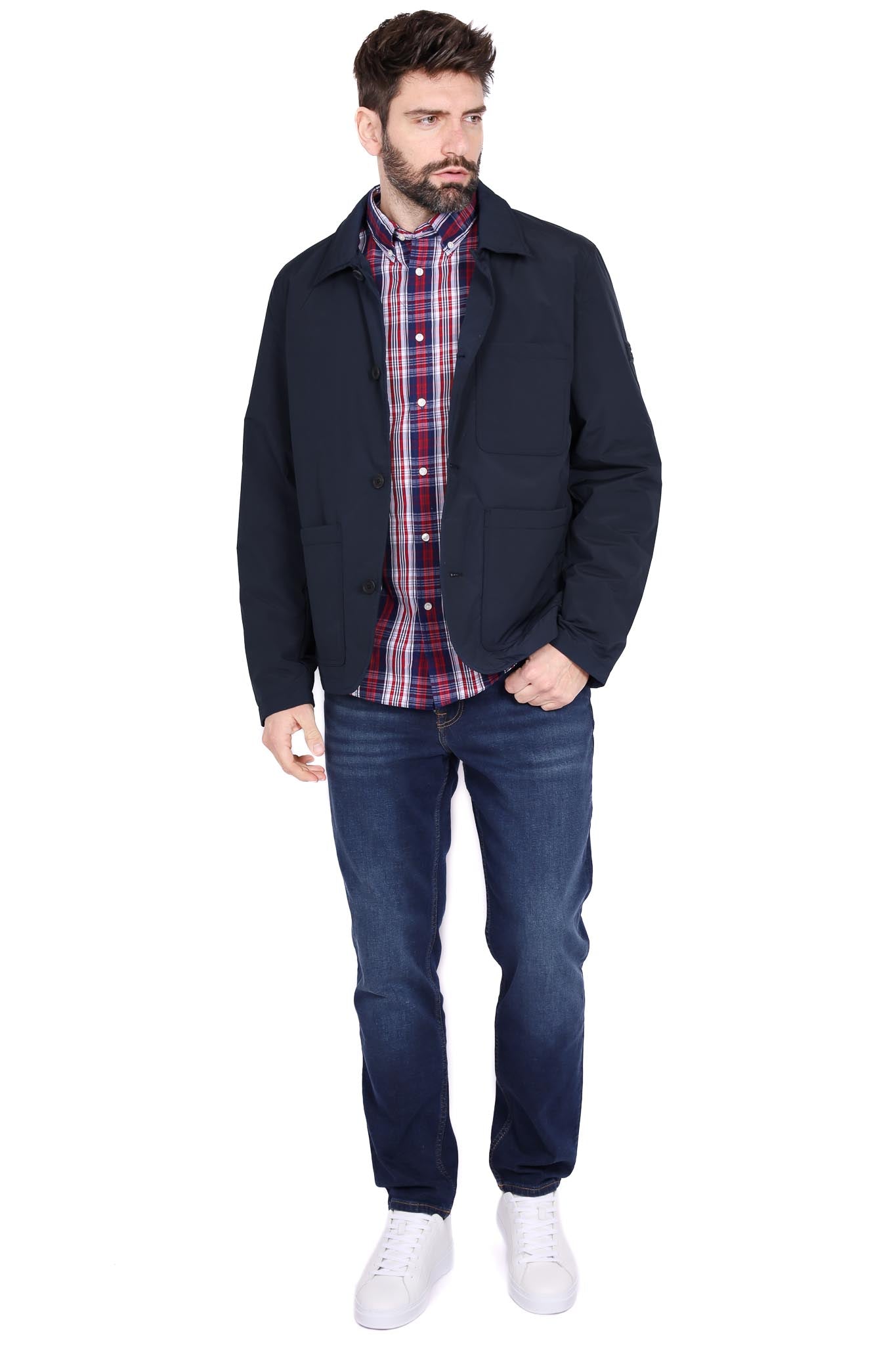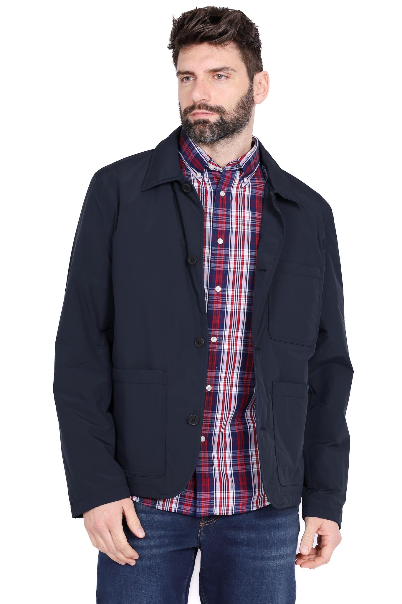 Giacca soprabito blu scuro con collo revers e tasche utility. Tessuto misto impermeabile per transizione stagionale, vestibilità regular.
