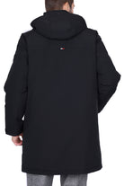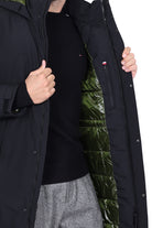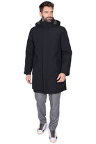Parka da uomo nero, imbottito e realizzato in tessuto tecnico resistente all’acqua, con cappuccio fisso e interno verde a contrasto. Chiusura con zip e bottoni a pressione, polsini antivento, tasche a filetto e tasca interna. Dettagli logo su manica e schiena. Perfetto per affrontare il freddo in città con comfort e stile contemporaneo.