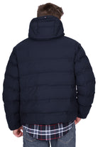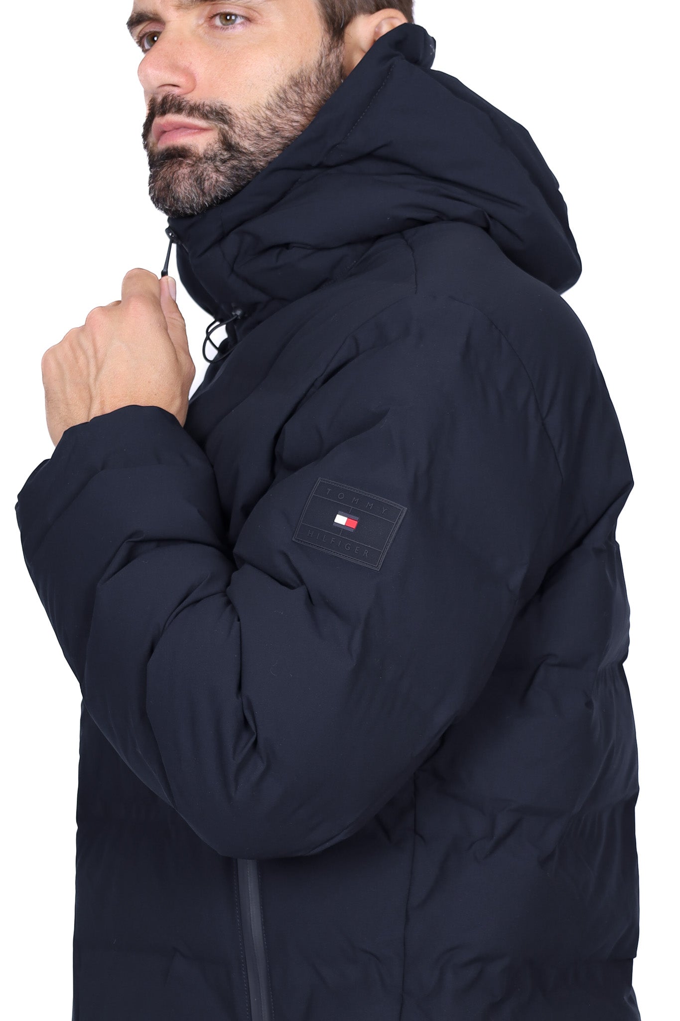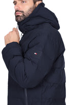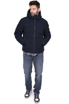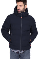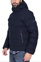 Piumino imbottito da uomo color blu scuro, realizzato in tessuto tecnico con trapuntatura orizzontale. Modello con cappuccio fisso, chiusura a zip, tasche laterali e dettagli logo tono su tono sul cappuccio e sul polso. Caldo, confortevole e dal design moderno, ideale per la stagione invernale su ogni tipo di outfit casual o sportivo.